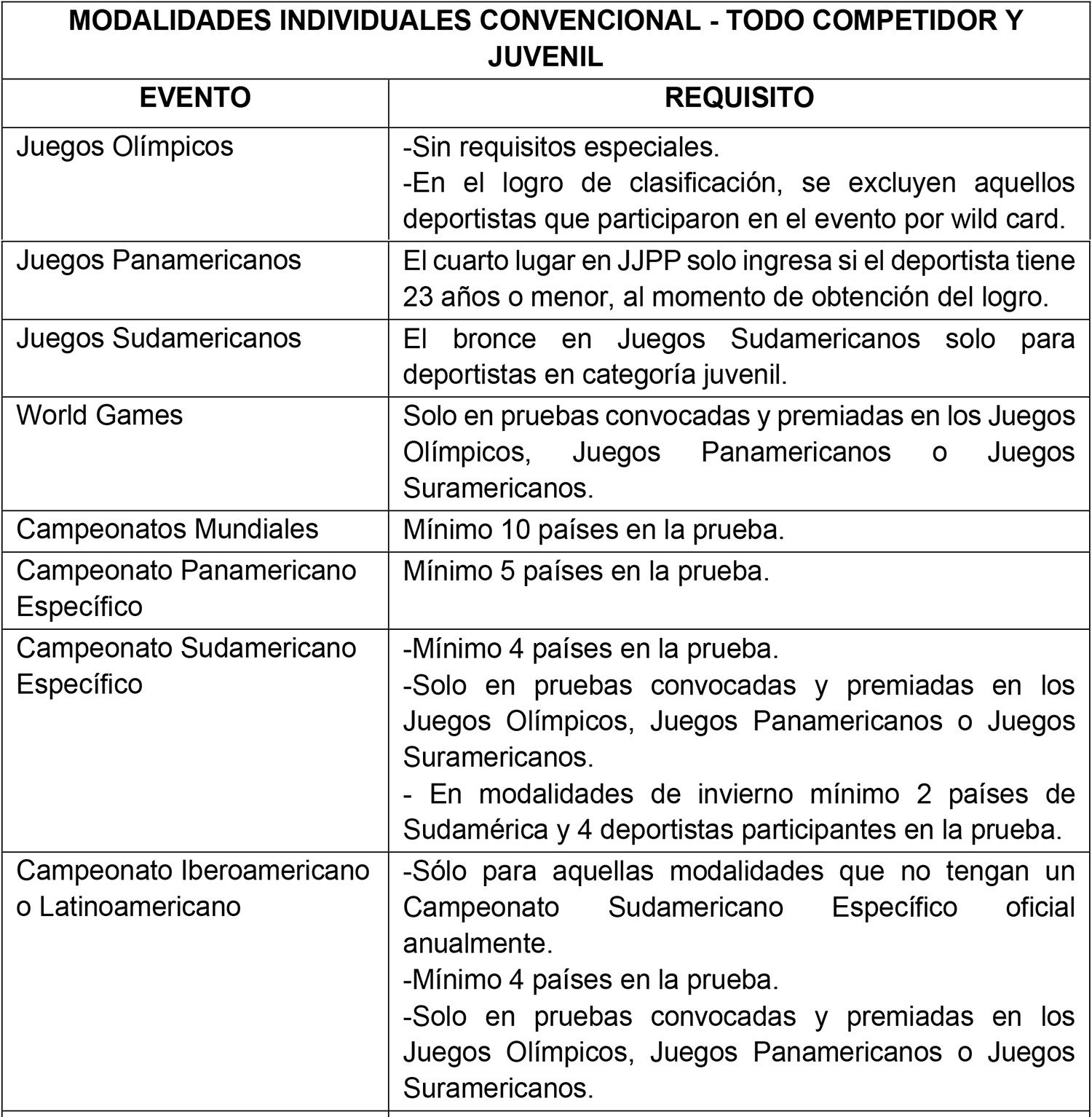 Requisitos específicos que deben cumplir los logros en Modalidades Individuales Convencionales, del Ciclo Olímpico de verano o invierno, en categoría Todo Competidor y Juvenil, para el ingreso y permanencia en el Sistema de Becas.