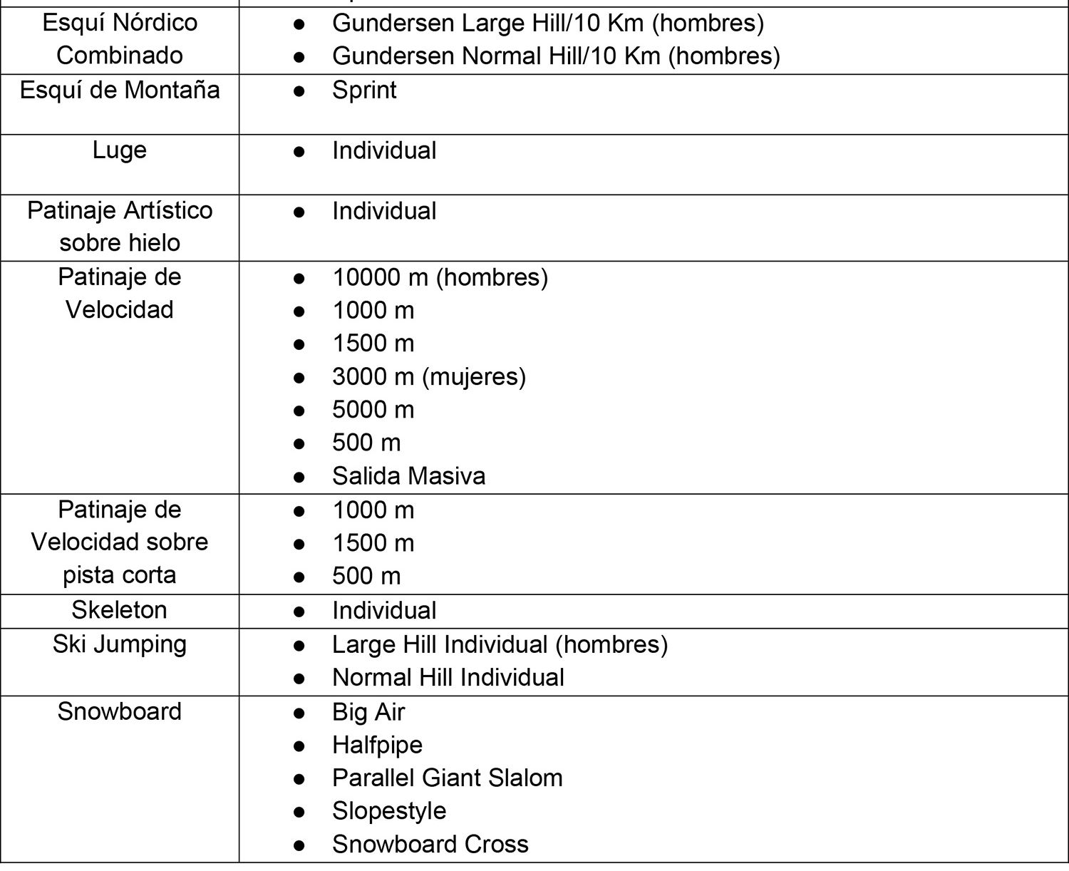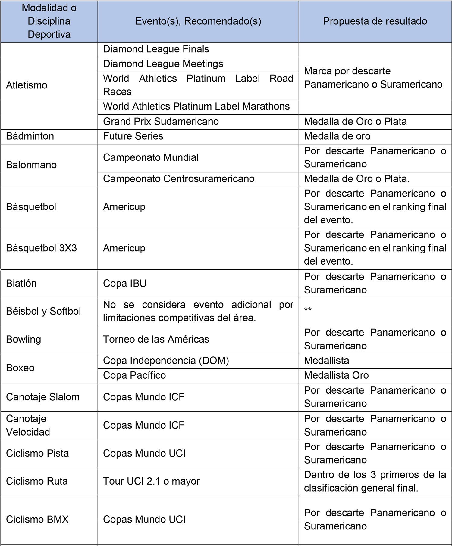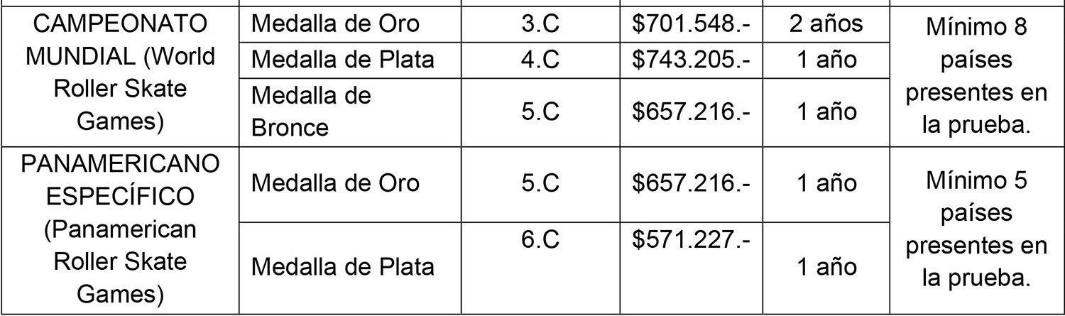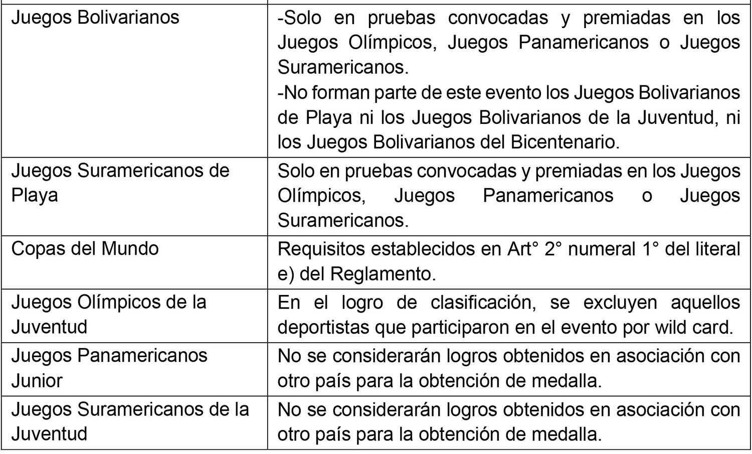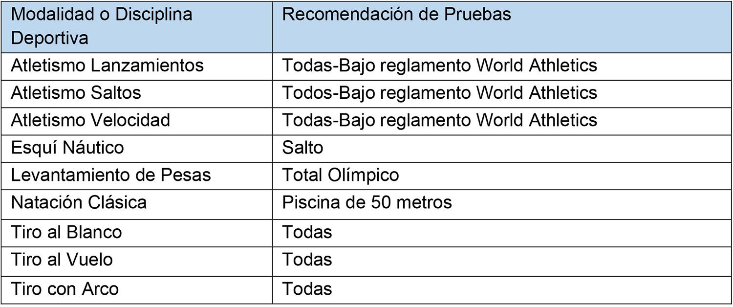 Los listados que se indican a continuación son meramente referenciales y consideran aquellas pruebas convocadas y premiadas en el programa de los Juegos Olímpicos y Paralímpicos, Juegos Panamericanos y Parapanamericanos, y Juegos Suramericanos y Parasuramericanos del Ciclo Olímpico y Paralímpico vigente, de verano e invierno. Se considerarán pruebas convocadas y premiadas a aquellas que forman parte del medallero general de los eventos señalados precedentemente en su última versión, o bien cuando se encuentren oficializadas en el programa de la próxima edición, por la entidad organizadora del megaevento correspondiente.