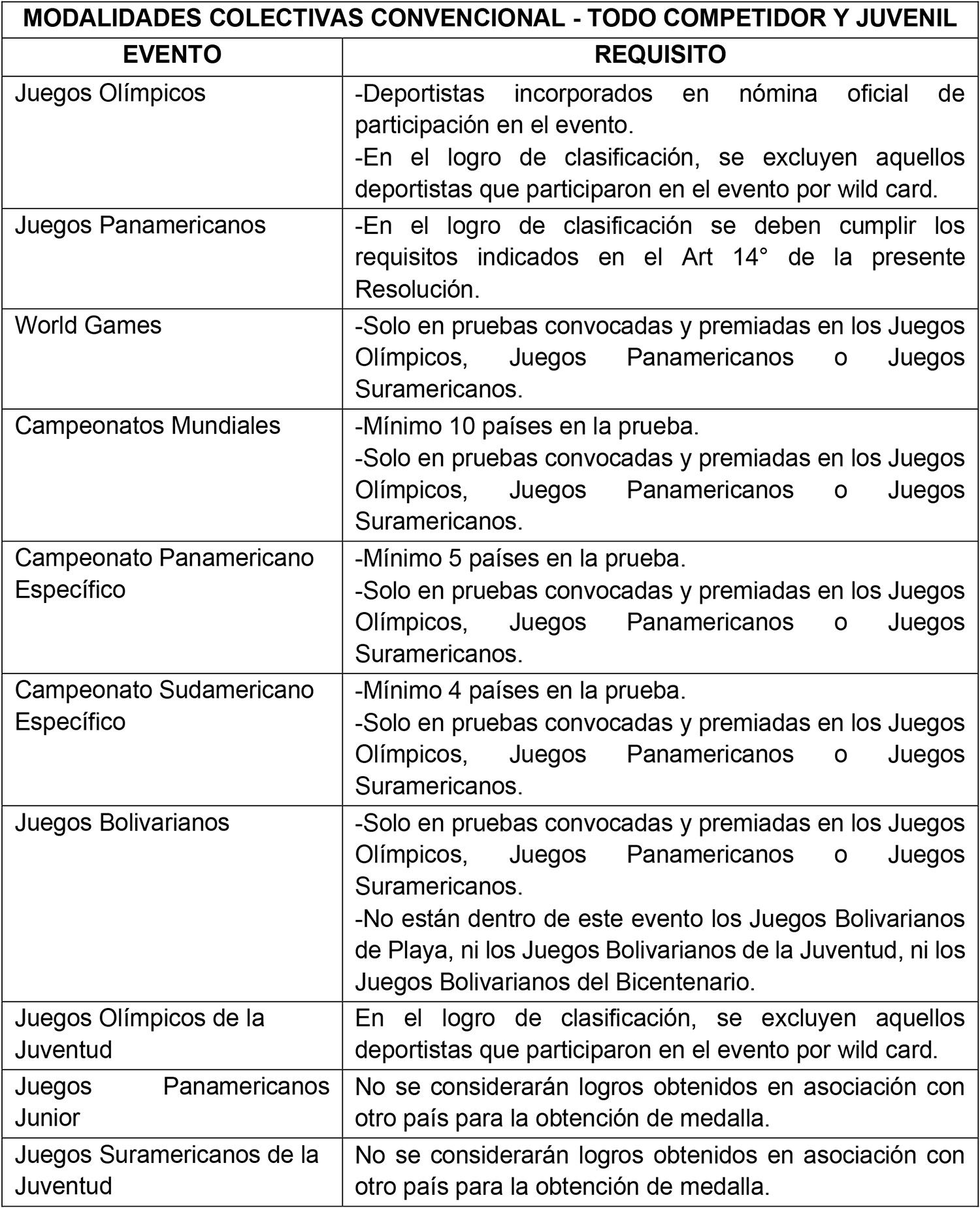 4. Clasificación a Juegos Panamericanos y a Juegos Parapanamericanos, exclusivamente en Modalidades Colectivas, conforme a las reglas y requisitos establecidos en la presente Resolución Complementaria.