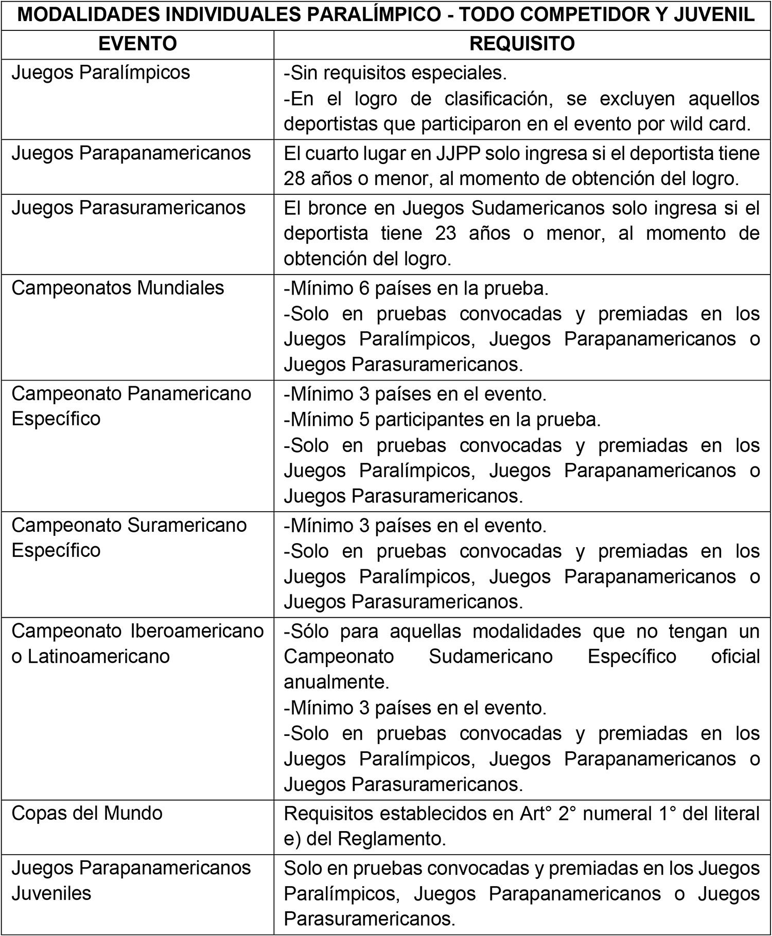 Artículo 12°.- Requisitos específicos para Modalidades Individualidades en Deporte Paralímpico.