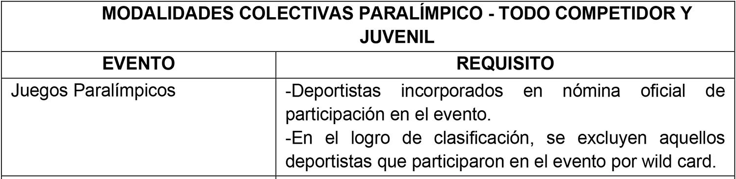 Requisitos específicos que deben cumplir los logros en Modalidades Colectivas Paralímpicas, del Ciclo Paralímpico de verano o invierno, en categoría Todo Competidor y Juvenil, para el ingreso y permanencia en el Sistema de Becas.