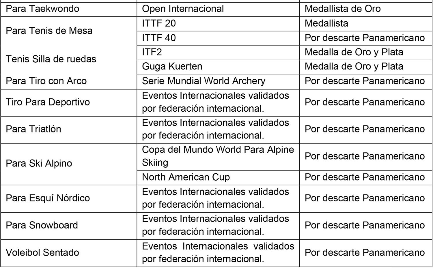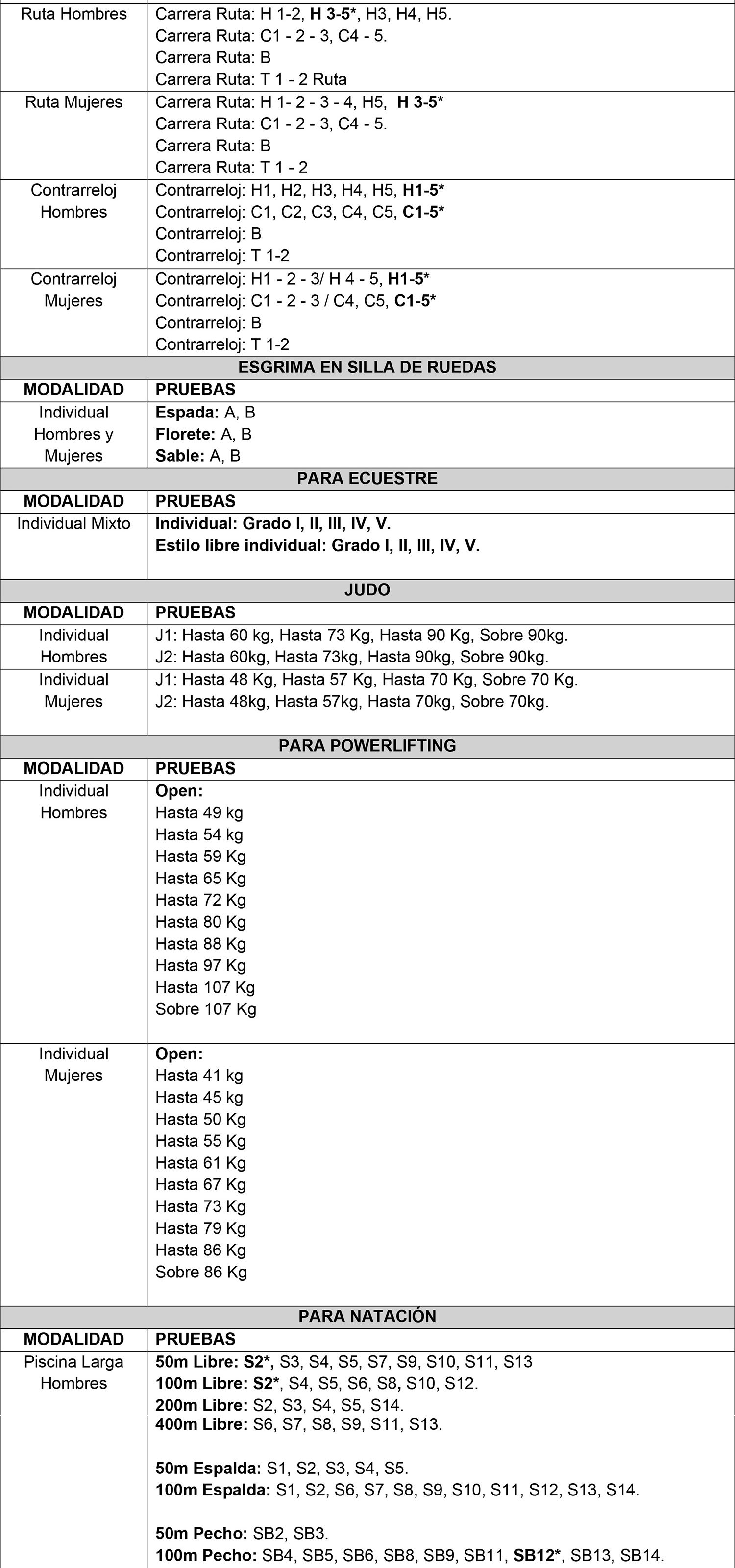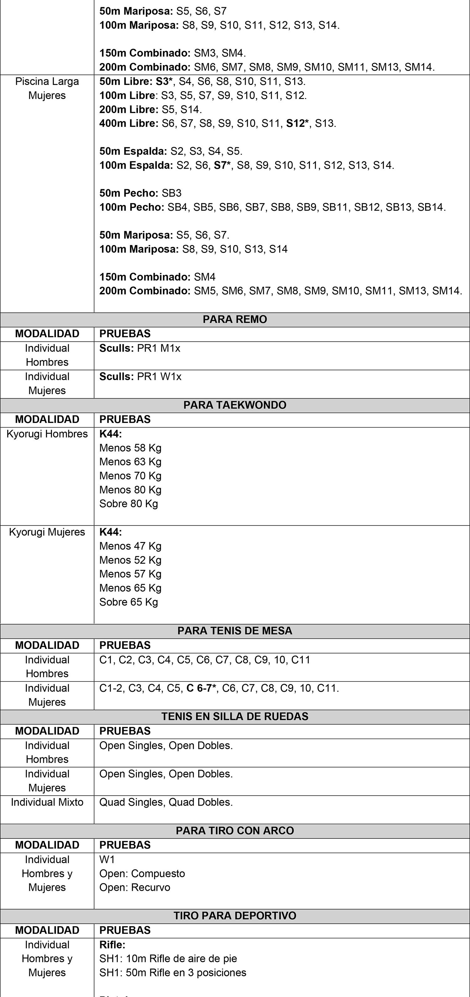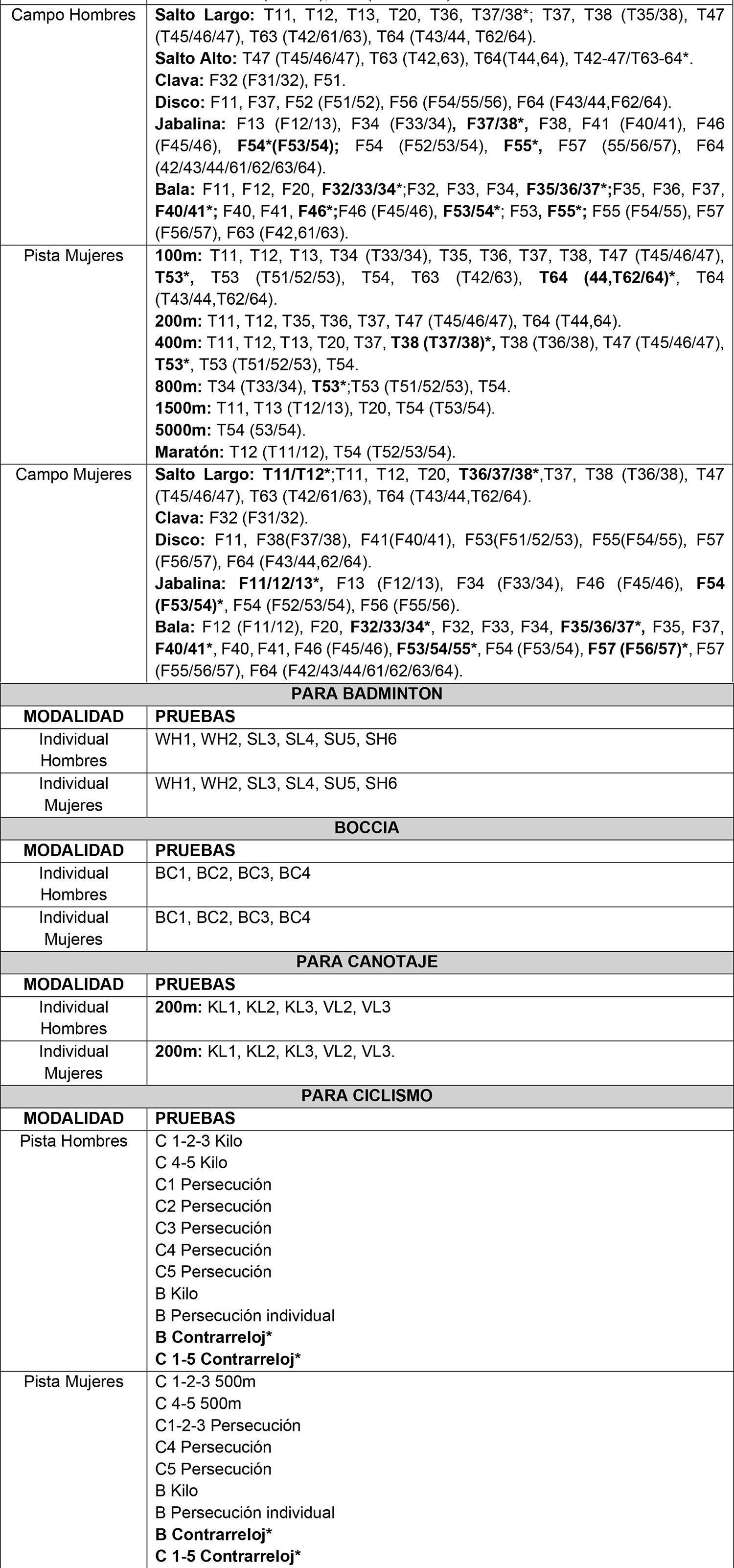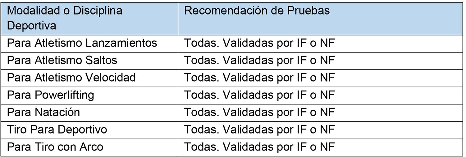 2.2) Tabla de pruebas exclusivamente validadas para tal fin, en modalidad Paralímpica.