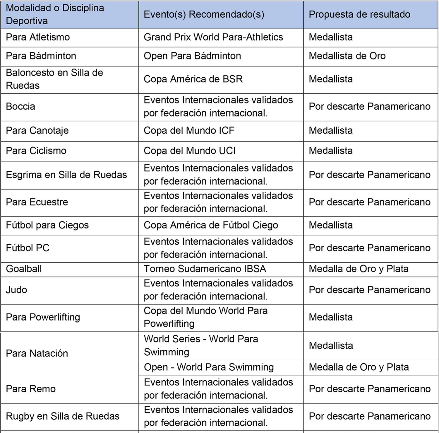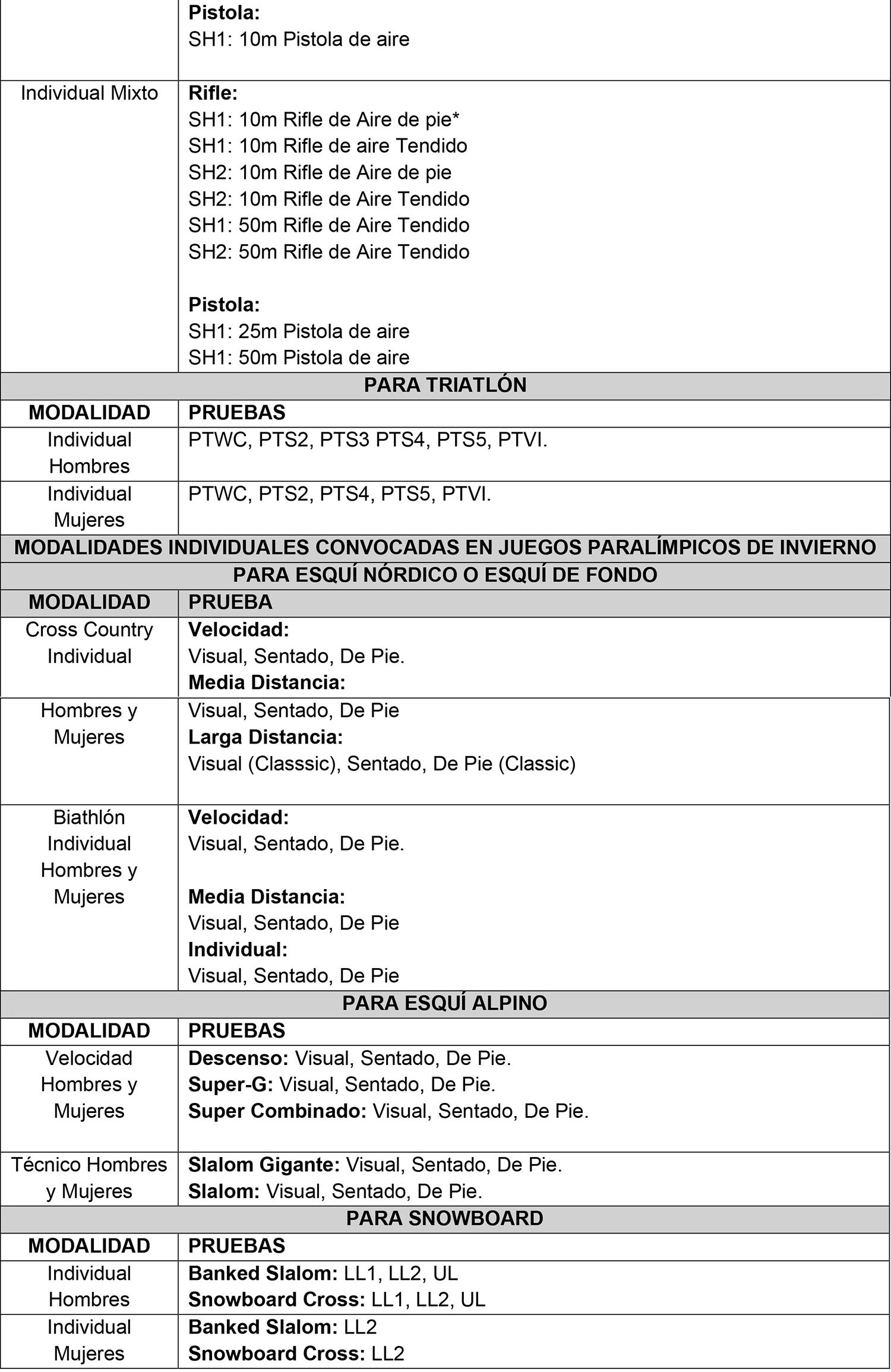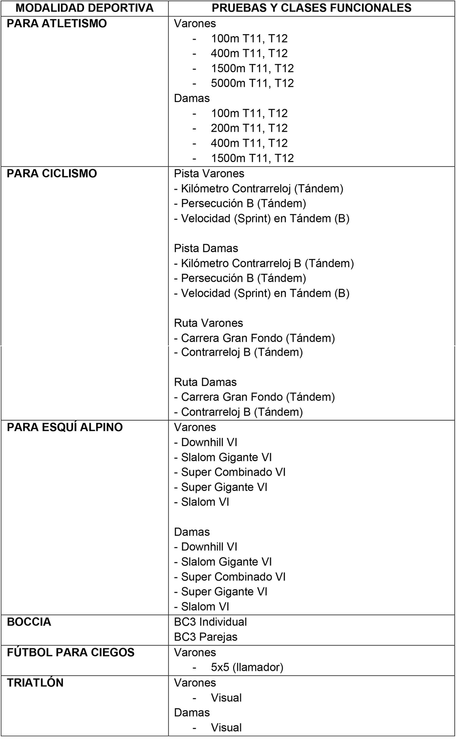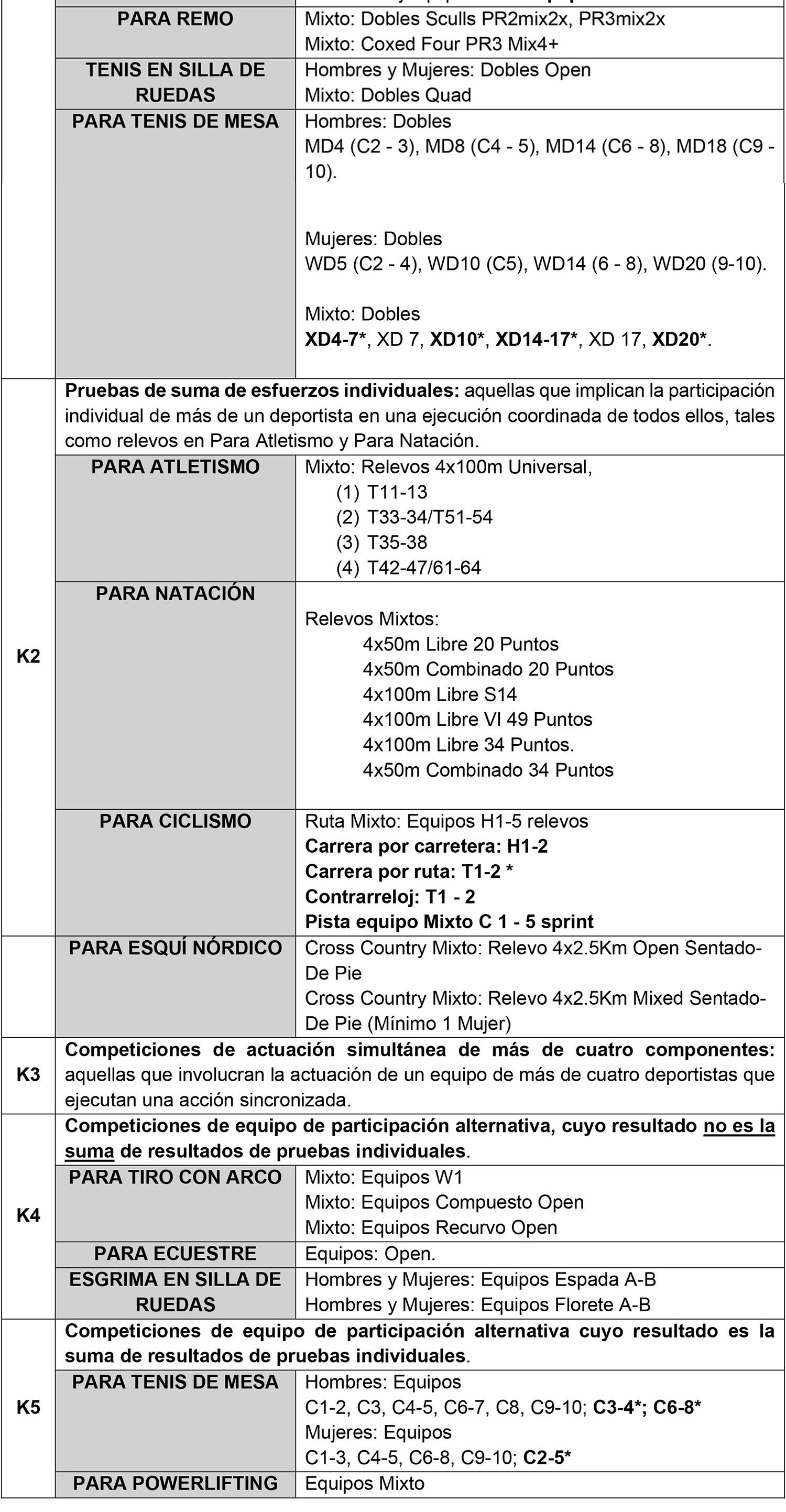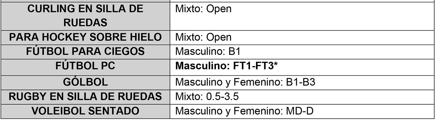 2.2) Tabla de pruebas exclusivamente validadas para tal fin, en modalidad Paralímpica.