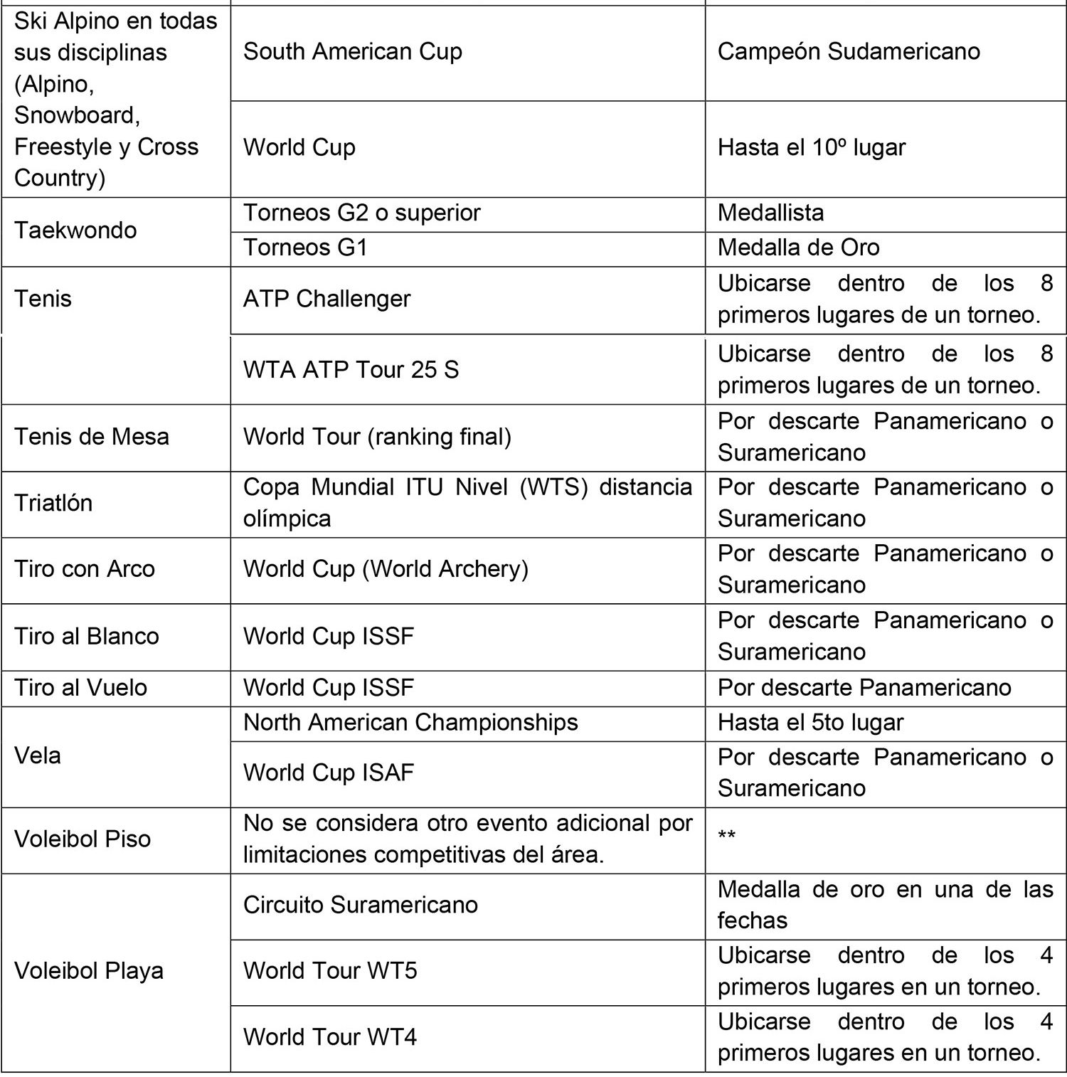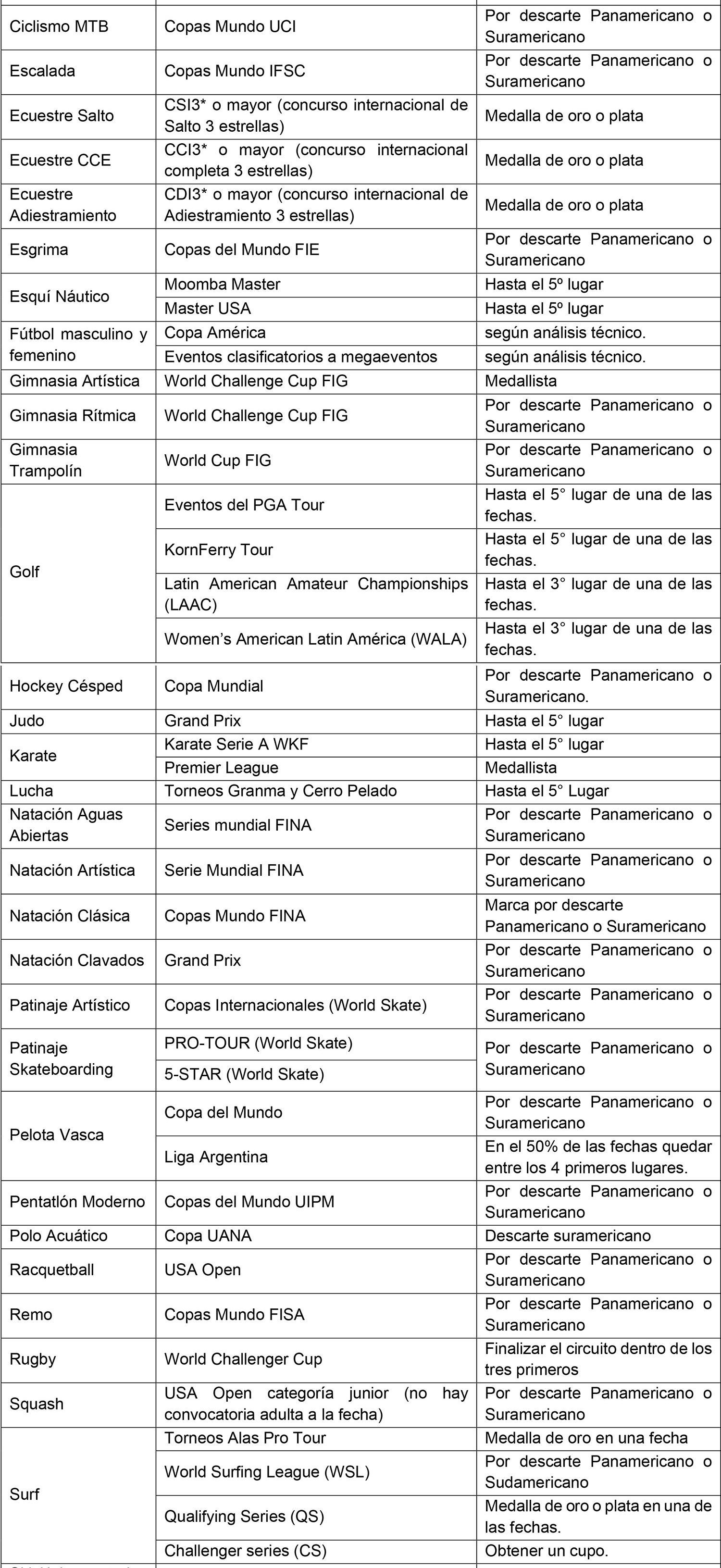Este criterio de evaluación es aplicable a todas las modalidades deportivas, convencionales y paralímpicas, y tiene como objetivo evaluar la participación de la persona becaria en otros eventos deportivos, además del evento fundamental. Para estos efectos, se considerarán los eventos que se indican en las siguientes tablas, y en los cuales se espera que la persona becaria pueda alcanzar los resultados que se proponen para cada una de las modalidades, tanto para el deporte convencional como paralímpico y que los proyecte como medallistas en un evento del mismo o mayor nivel al que se encuentra en la beca, de acuerdo a los resultados del último evento Mundial, Panamericano o Sudamericano específico, según corresponda.