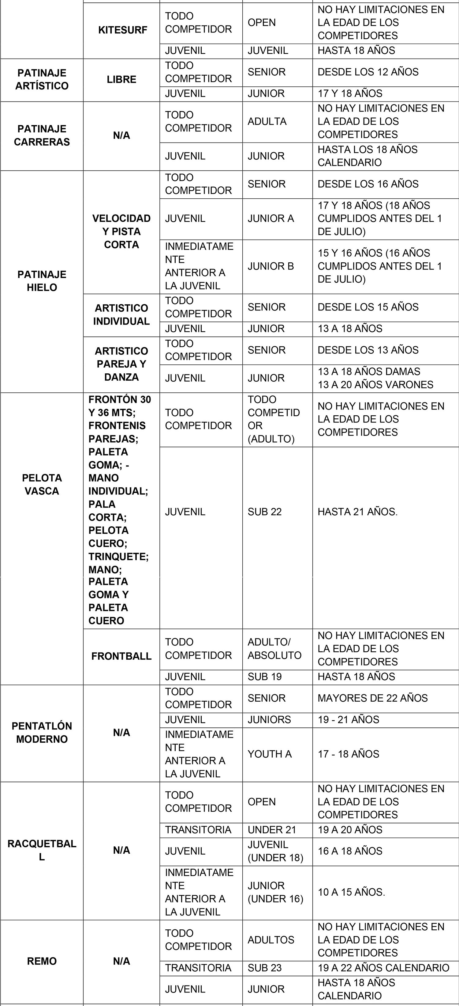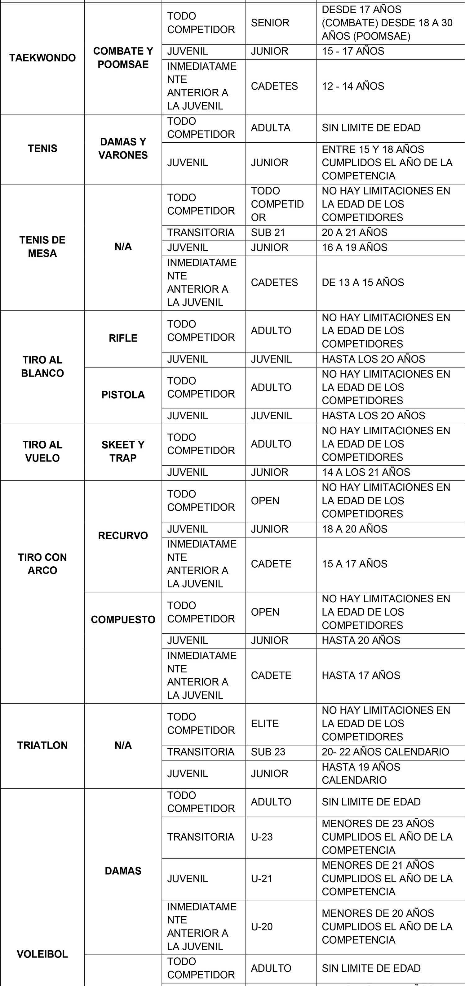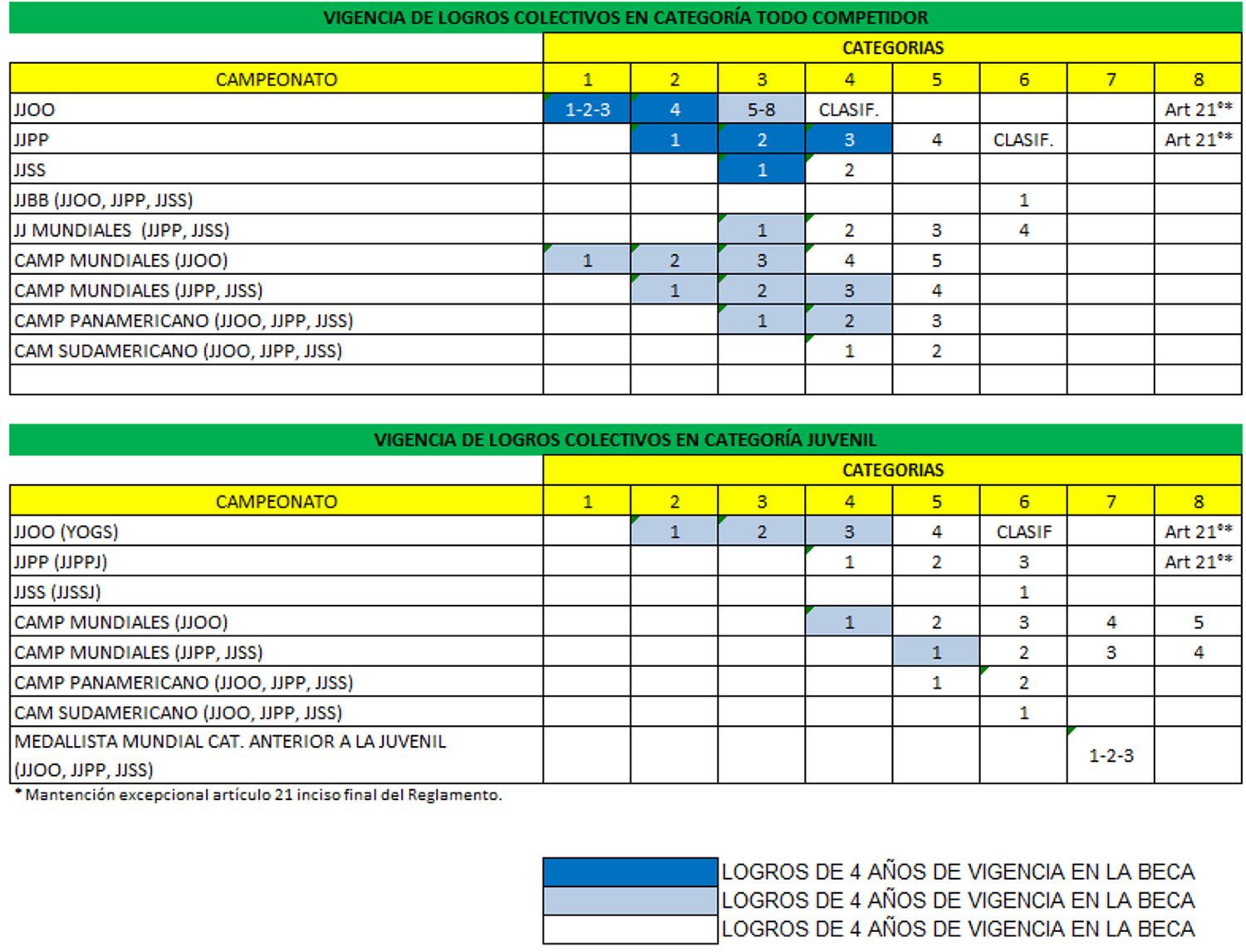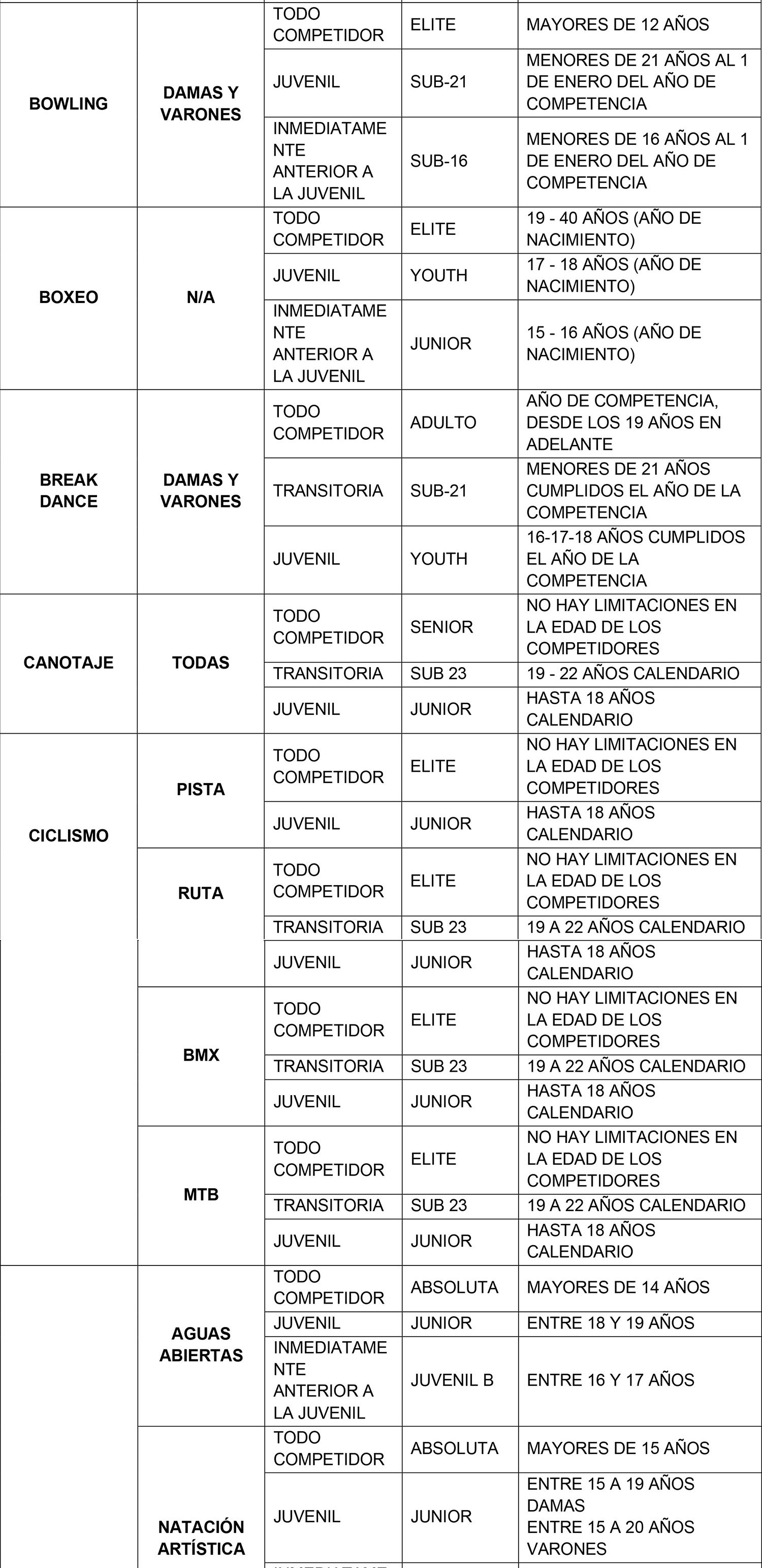 Se considerarán para el ingreso y permanencia en la beca exclusivamente aquellas categorías Todo Competidor, Transitoria y Juvenil denominadas de acuerdo al siguiente listado que se describe por modalidad deportiva. La categoría anterior a la Juvenil sólo se considera en aquellas modalidades que realizan un Campeonato Mundial oficial en dicha categoría.