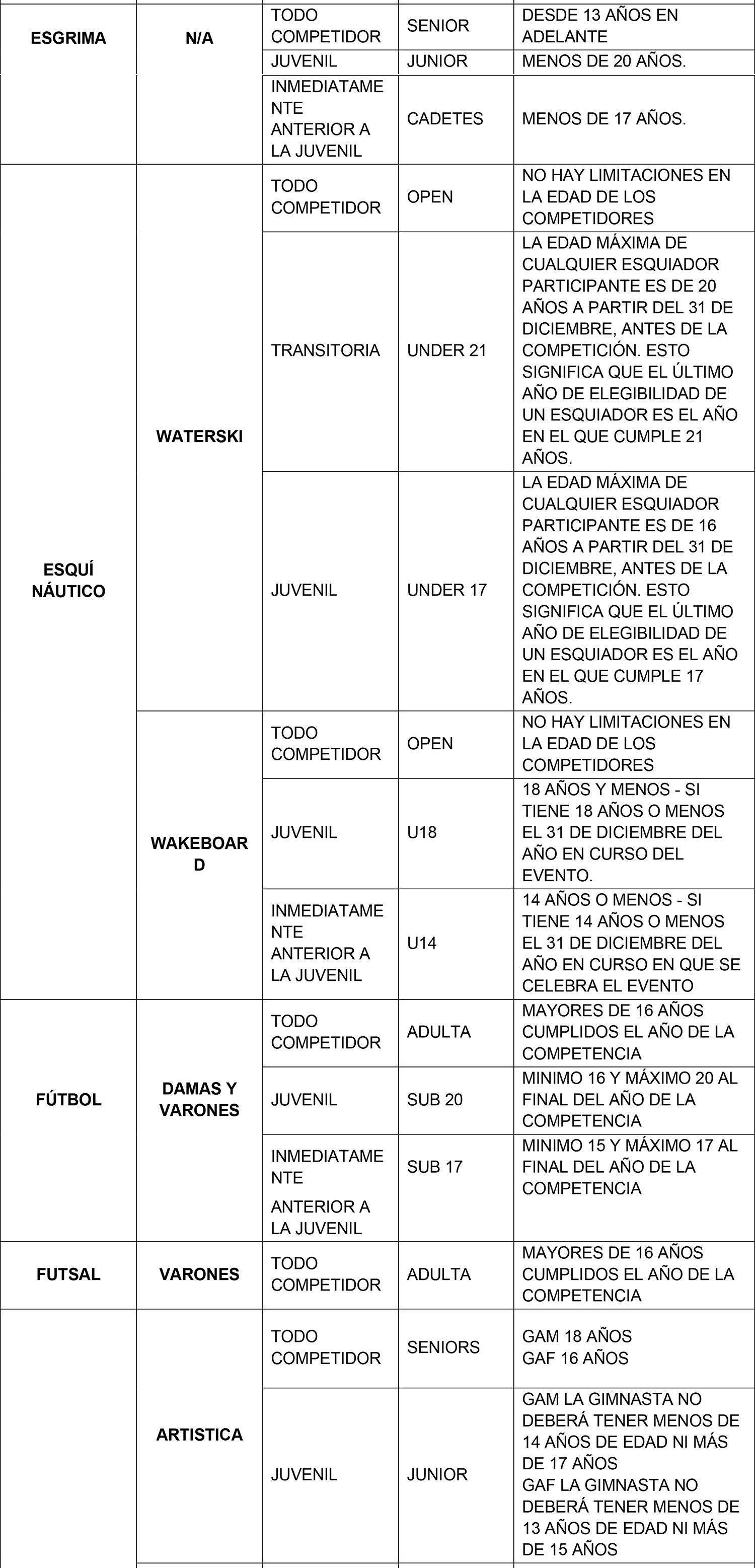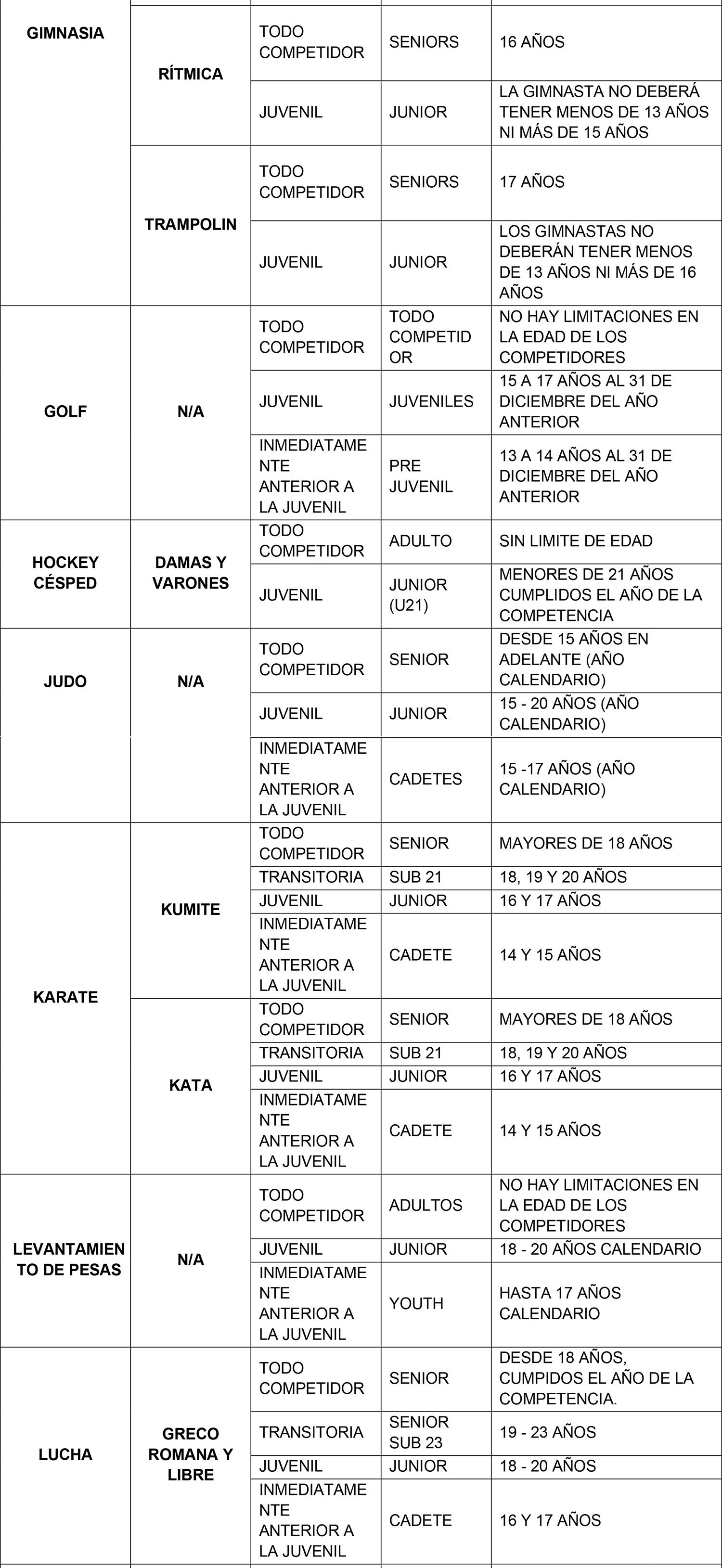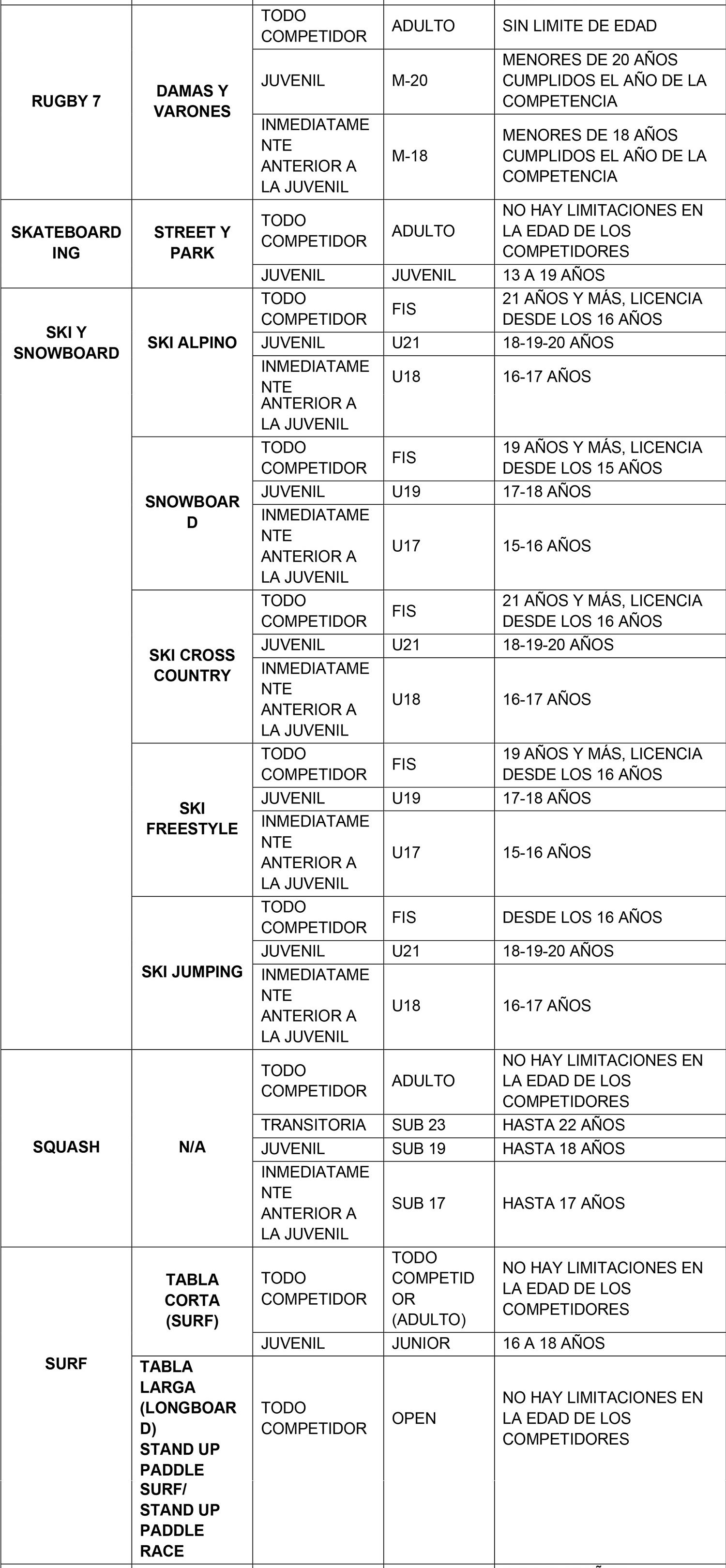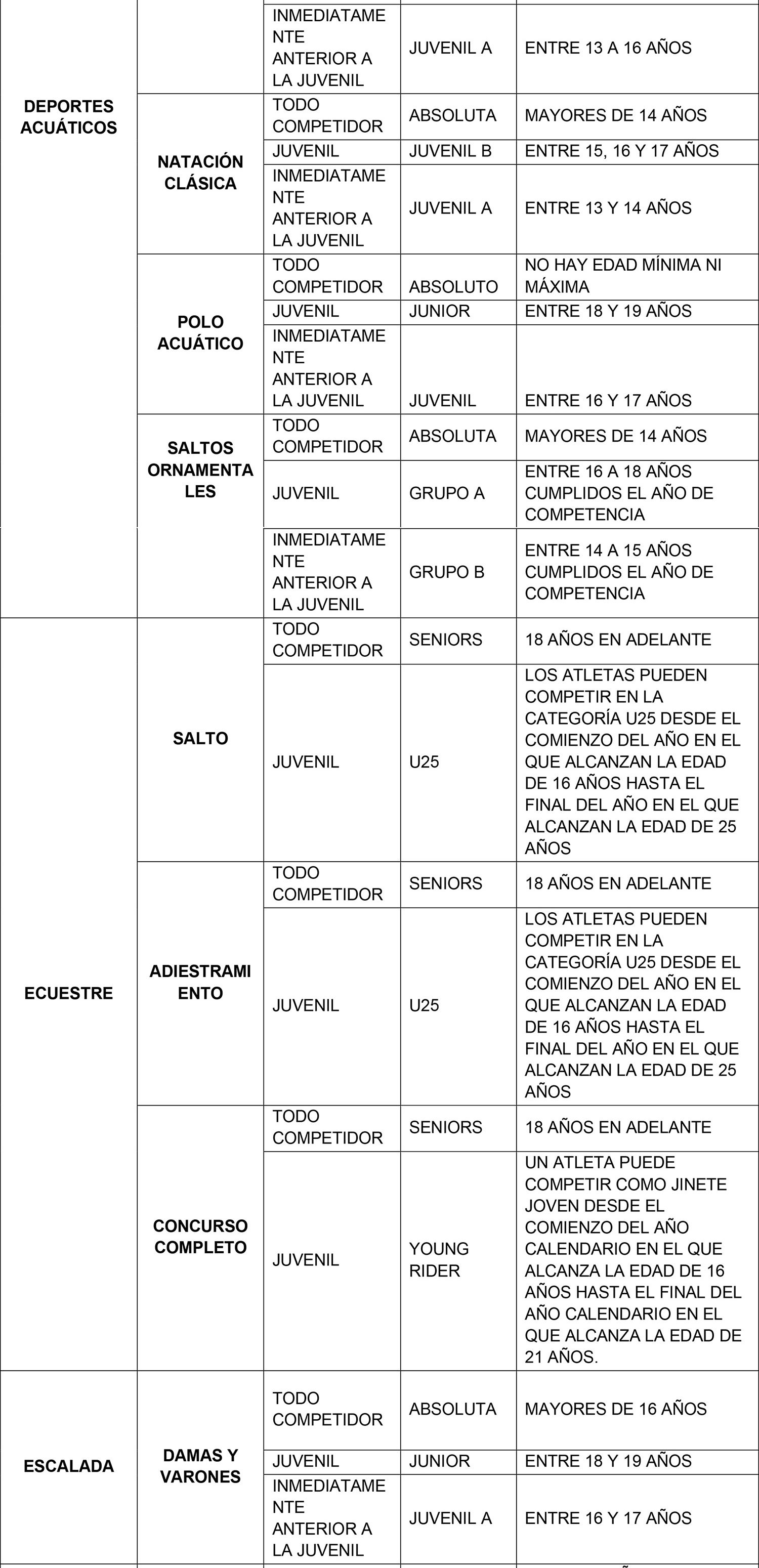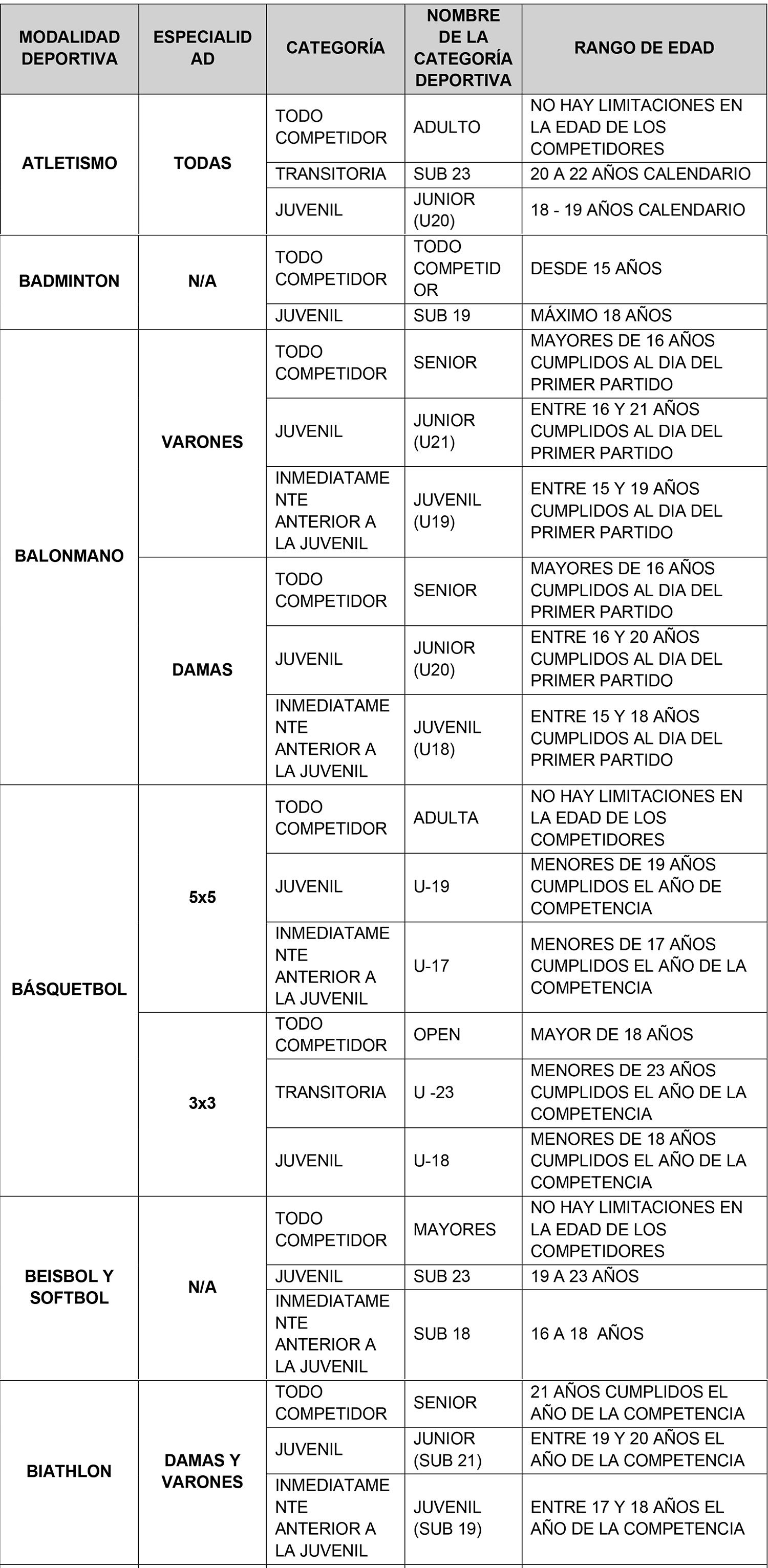 Se considerarán para el ingreso y permanencia en la beca exclusivamente aquellas categorías Todo Competidor, Transitoria y Juvenil denominadas de acuerdo al siguiente listado que se describe por modalidad deportiva. La categoría anterior a la Juvenil sólo se considera en aquellas modalidades que realizan un Campeonato Mundial oficial en dicha categoría.