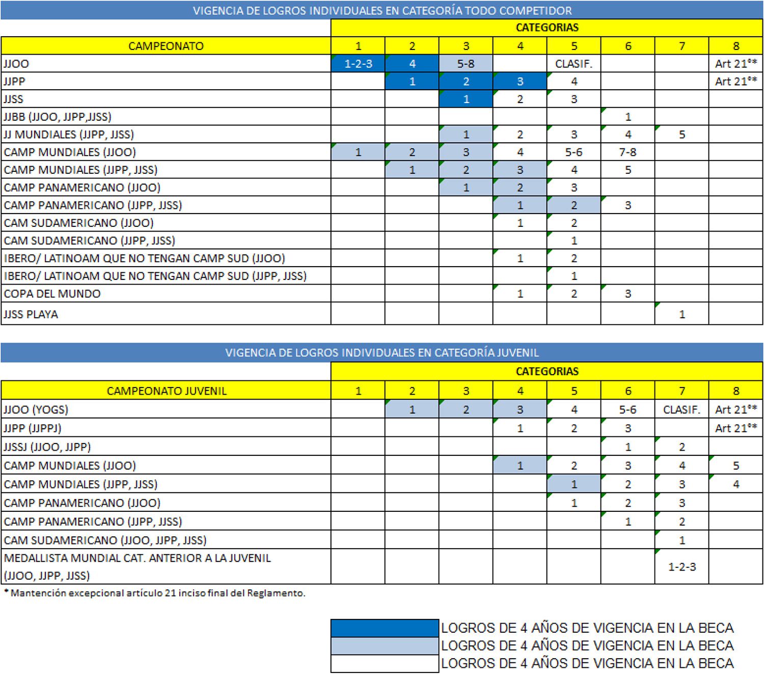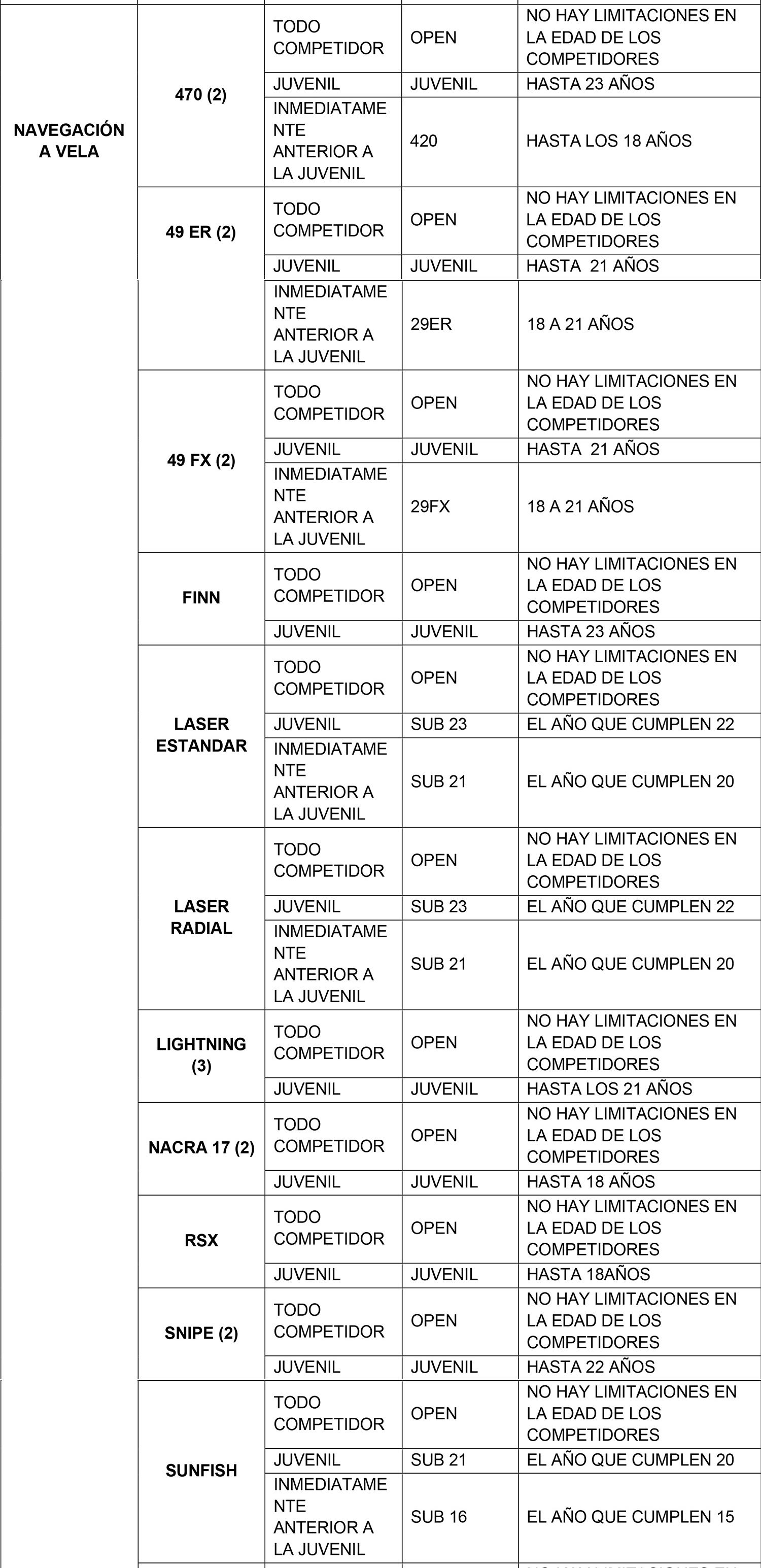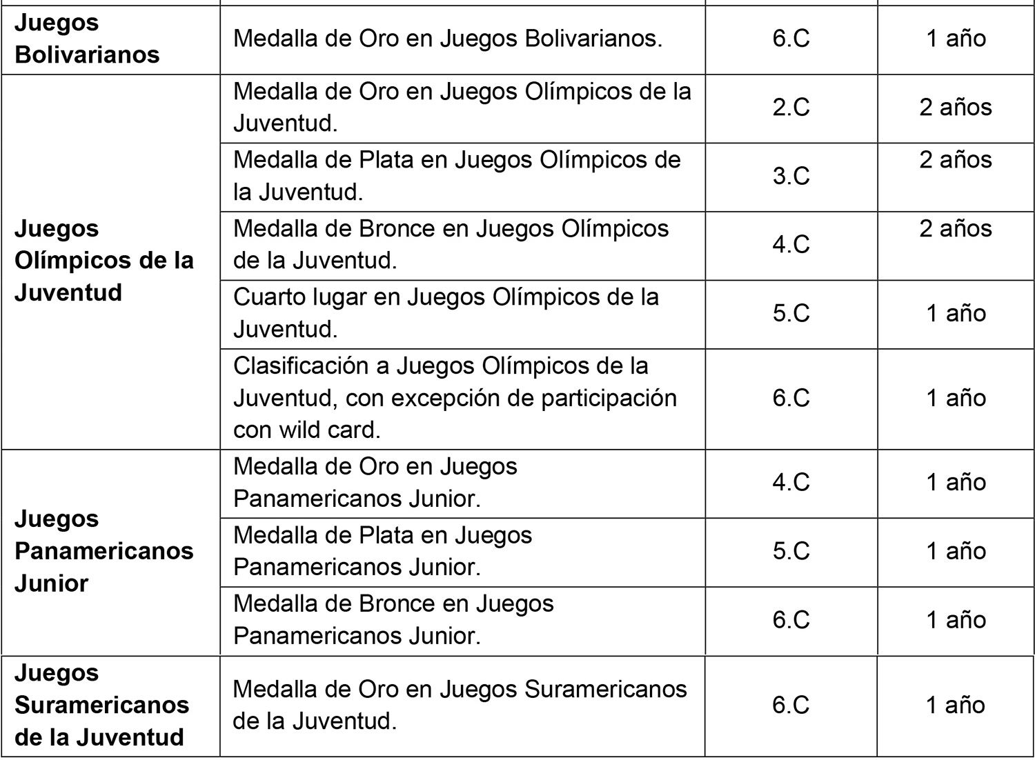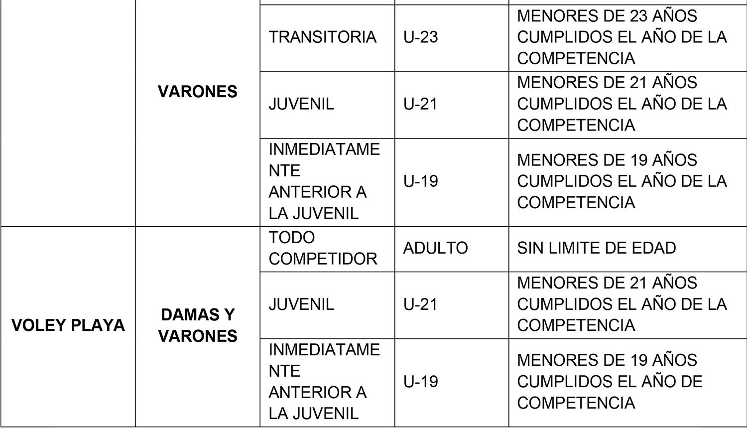 Se considerarán para el ingreso y permanencia en la beca exclusivamente aquellas categorías Todo Competidor, Transitoria y Juvenil denominadas de acuerdo al siguiente listado que se describe por modalidad deportiva. La categoría anterior a la Juvenil sólo se considera en aquellas modalidades que realizan un Campeonato Mundial oficial en dicha categoría.