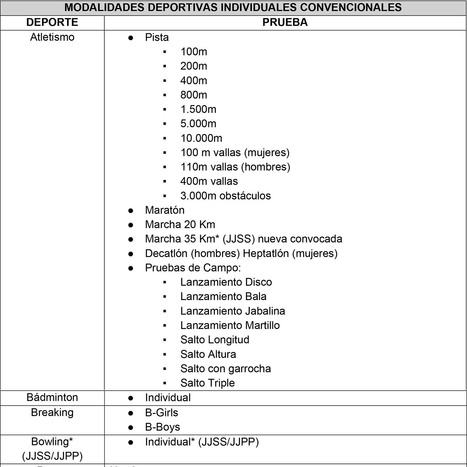 D) Listado de modalidades individuales, de deporte paralímpico, en las cuales podrán obtenerse logros deportivos: (* Prueba convocada sólo en Juegos Para Panamericanos o Para Suramericanos)