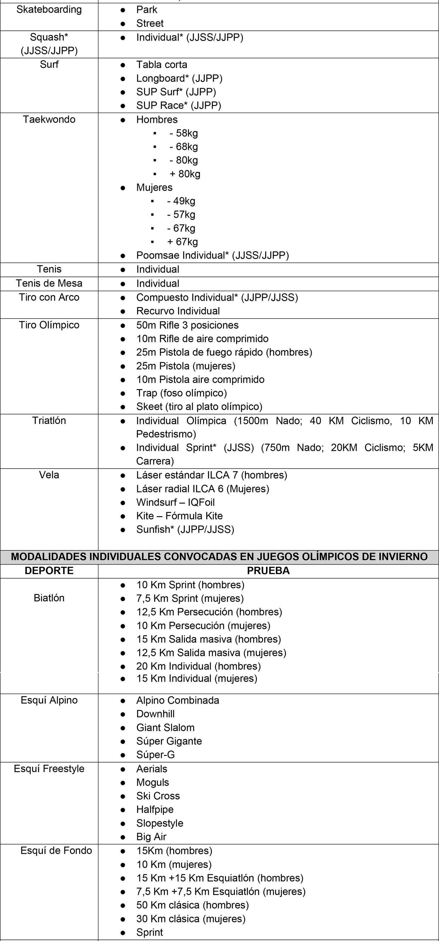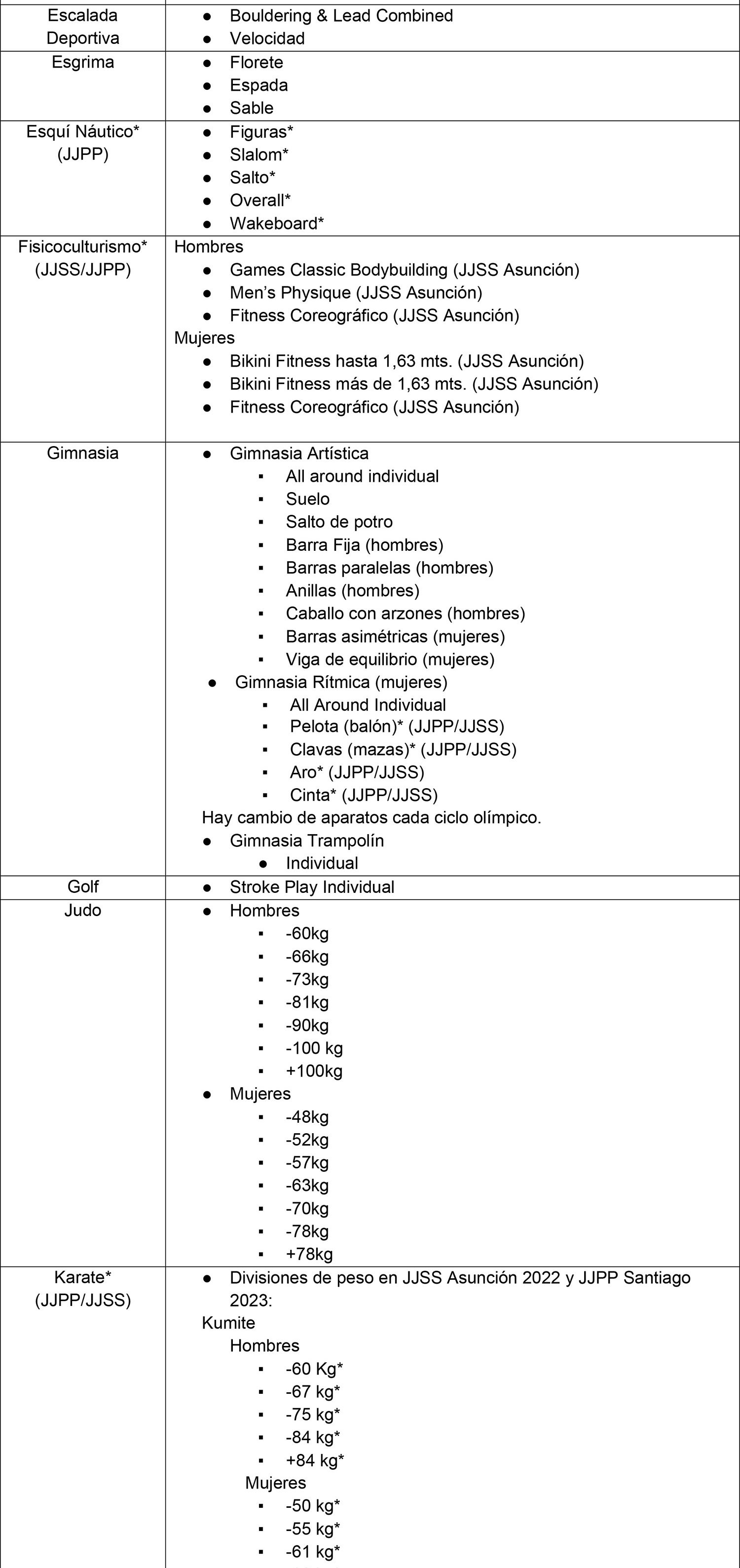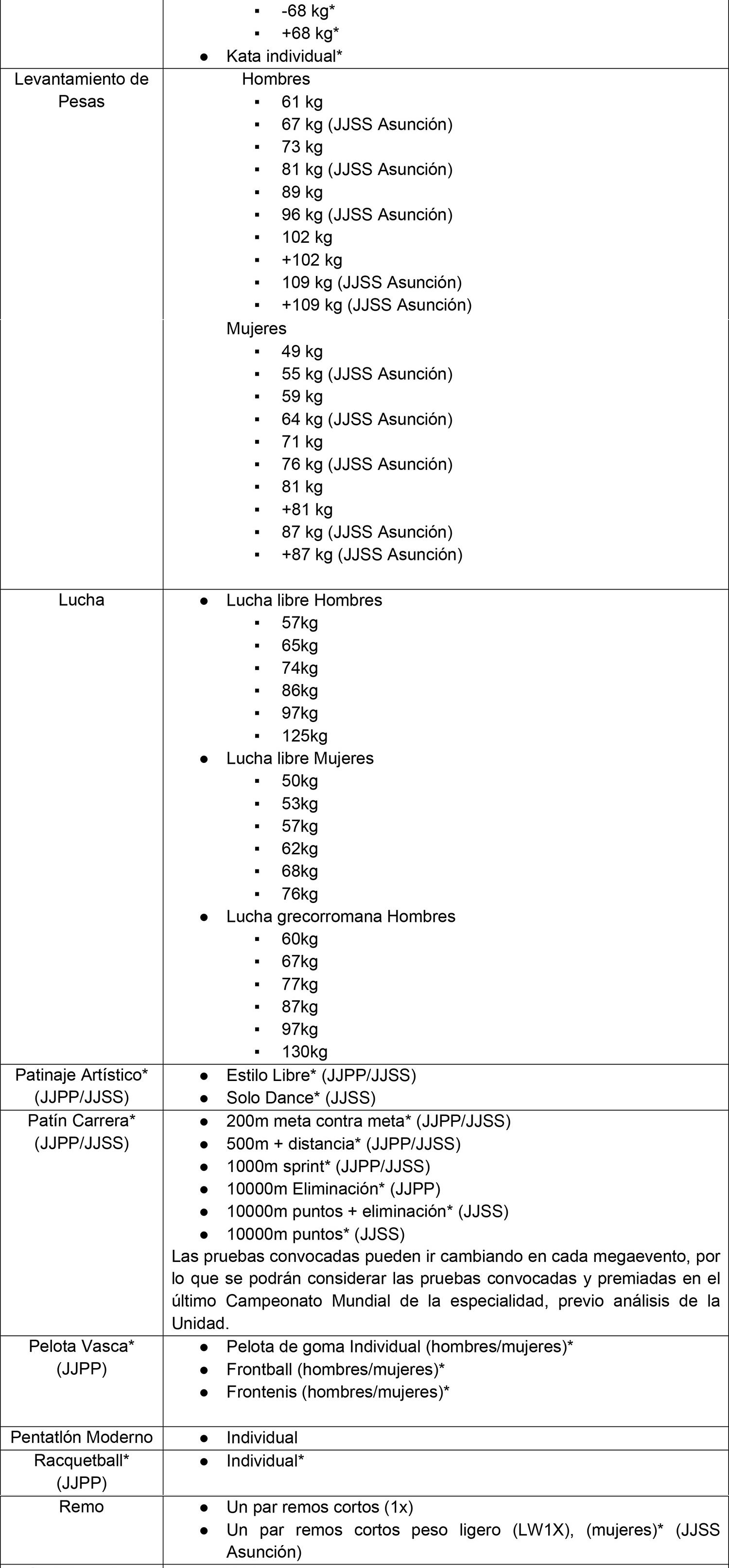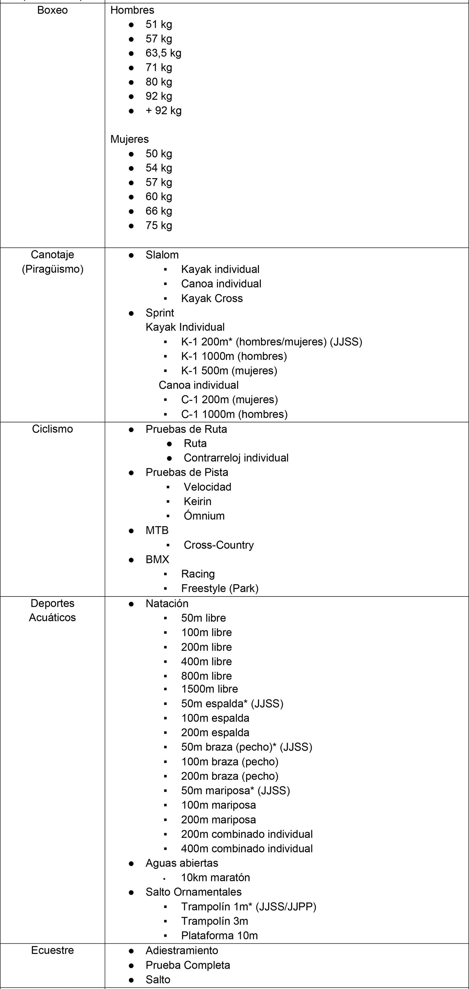 * Pruebas no convocadas en el programa de los Juegos Olímpicos, pero que se encuentran convocadas en el programa de Juegos Panamericanos y/o Juegos Suramericanos.