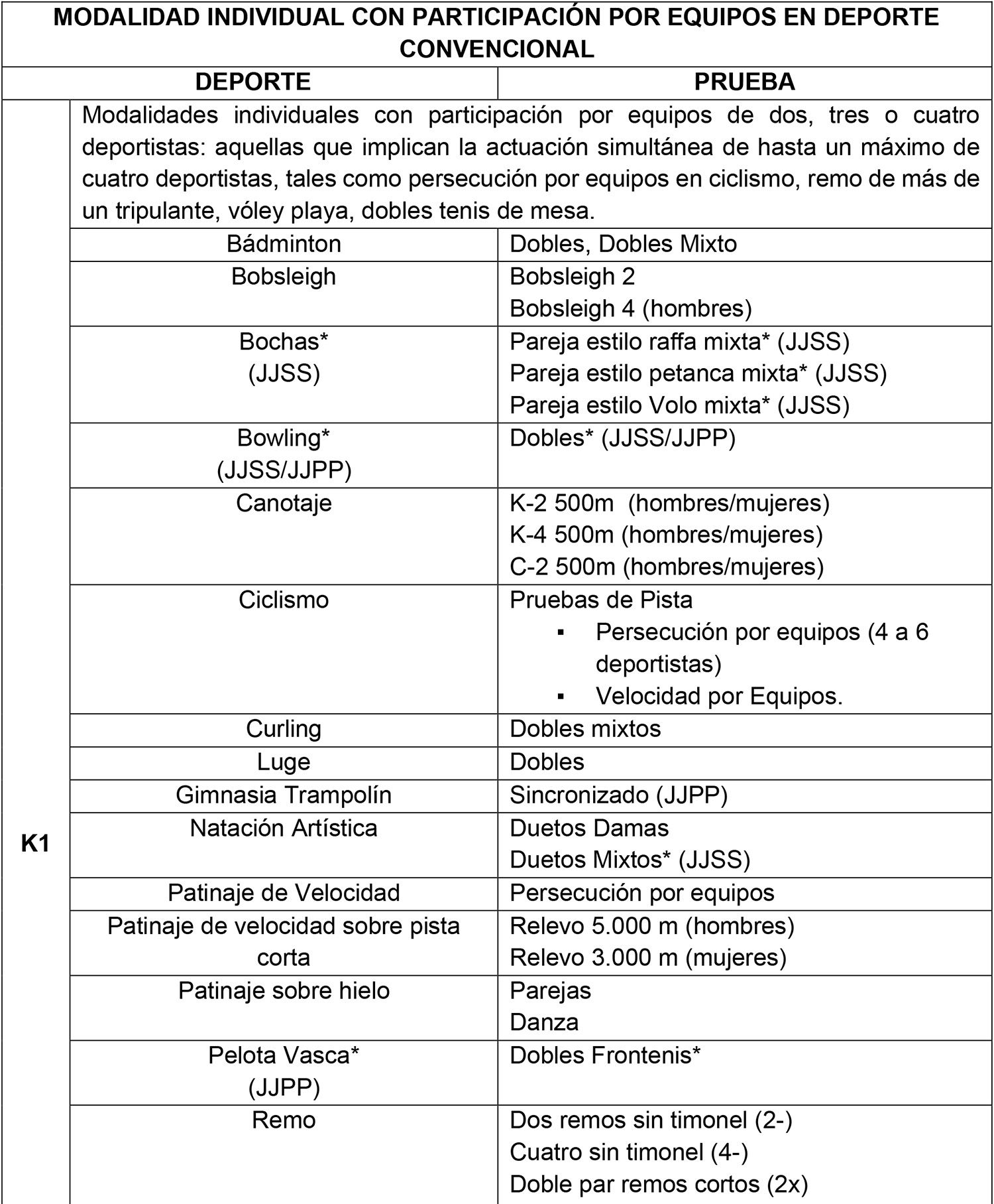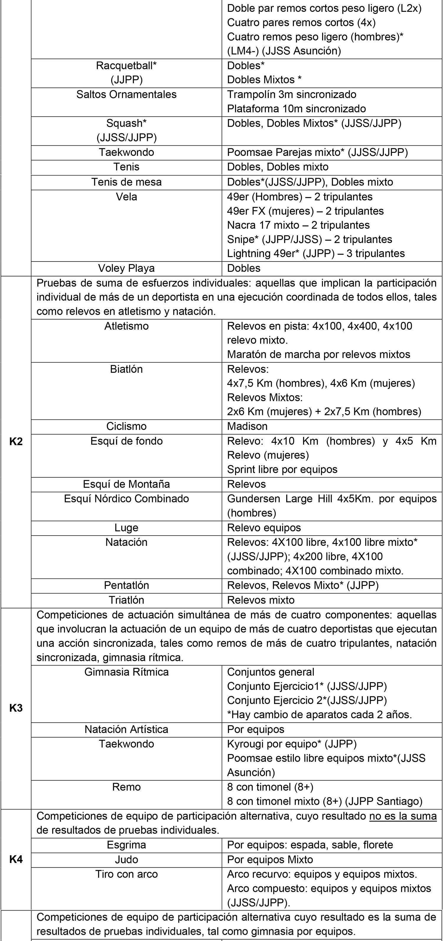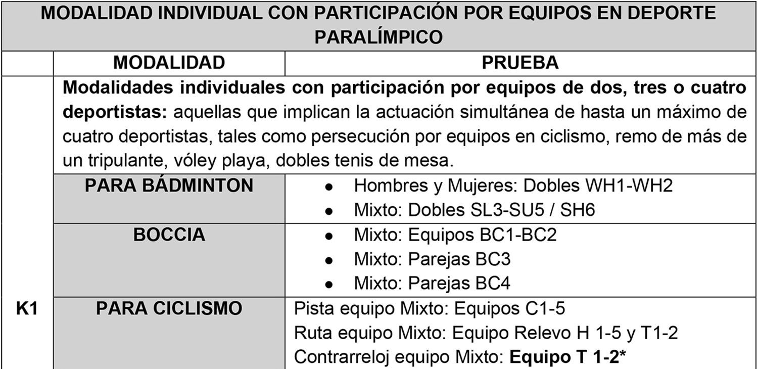 a) En las modalidades individuales con participación por equipos, definidos en el artículo 2° literal k) del Reglamento, a saber: las modalidades individuales con participación por equipo de 2, 3 o 4 deportistas (K1); las pruebas de suma de esfuerzos individuales (K2); las competiciones de equipo de participación alternativa cuyo resultado no es la suma de resultados de pruebas individuales (K4); y las competiciones de equipo de participación alternativa cuyo resultado es la suma de resultado de pruebas individuales (K5), se pagarán de acuerdo lo señalado para los deportes individuales. Todas estas modalidades y competiciones se encuentran expresamente señaladas en la tabla del Anexo I de la presente Resolución Complementaria.