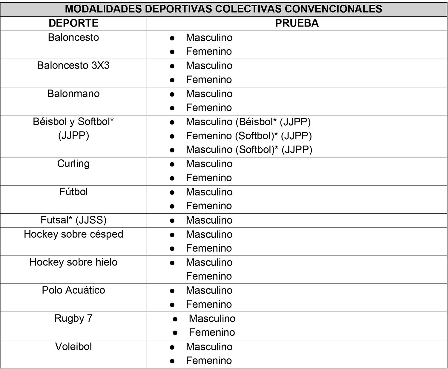 C) Listado de modalidades colectivas, de deporte convencional, en las cuales podrán obtenerse logros deportivos: