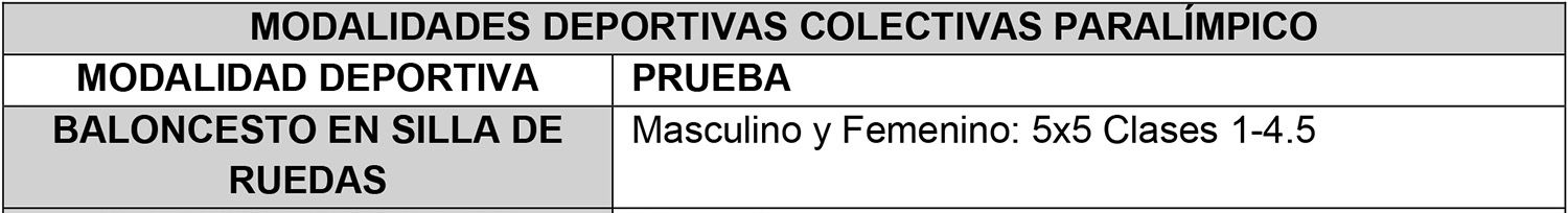 F) Listado de modalidades colectivas, de deporte paralímpico, en las cuales podrán obtenerse logros deportivos: