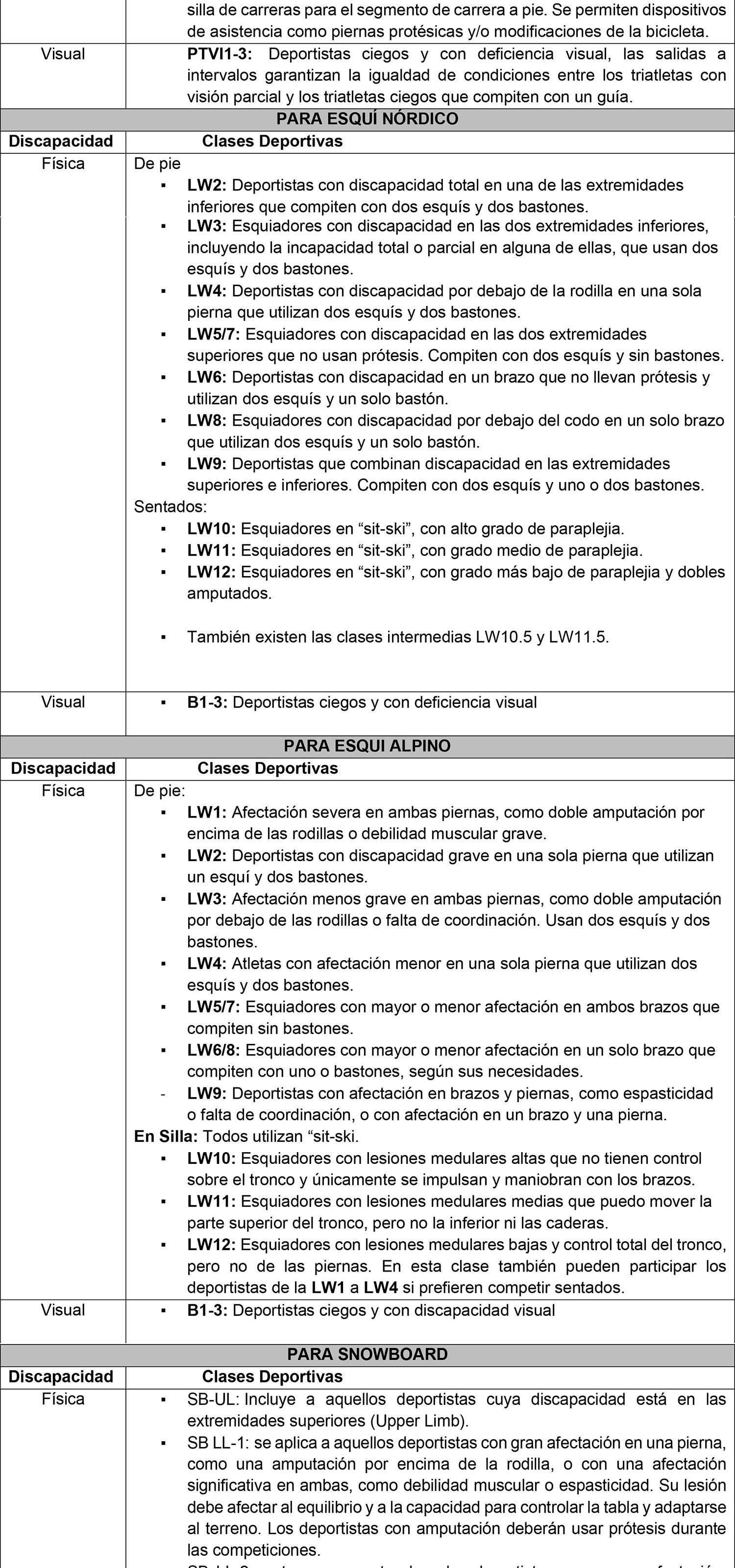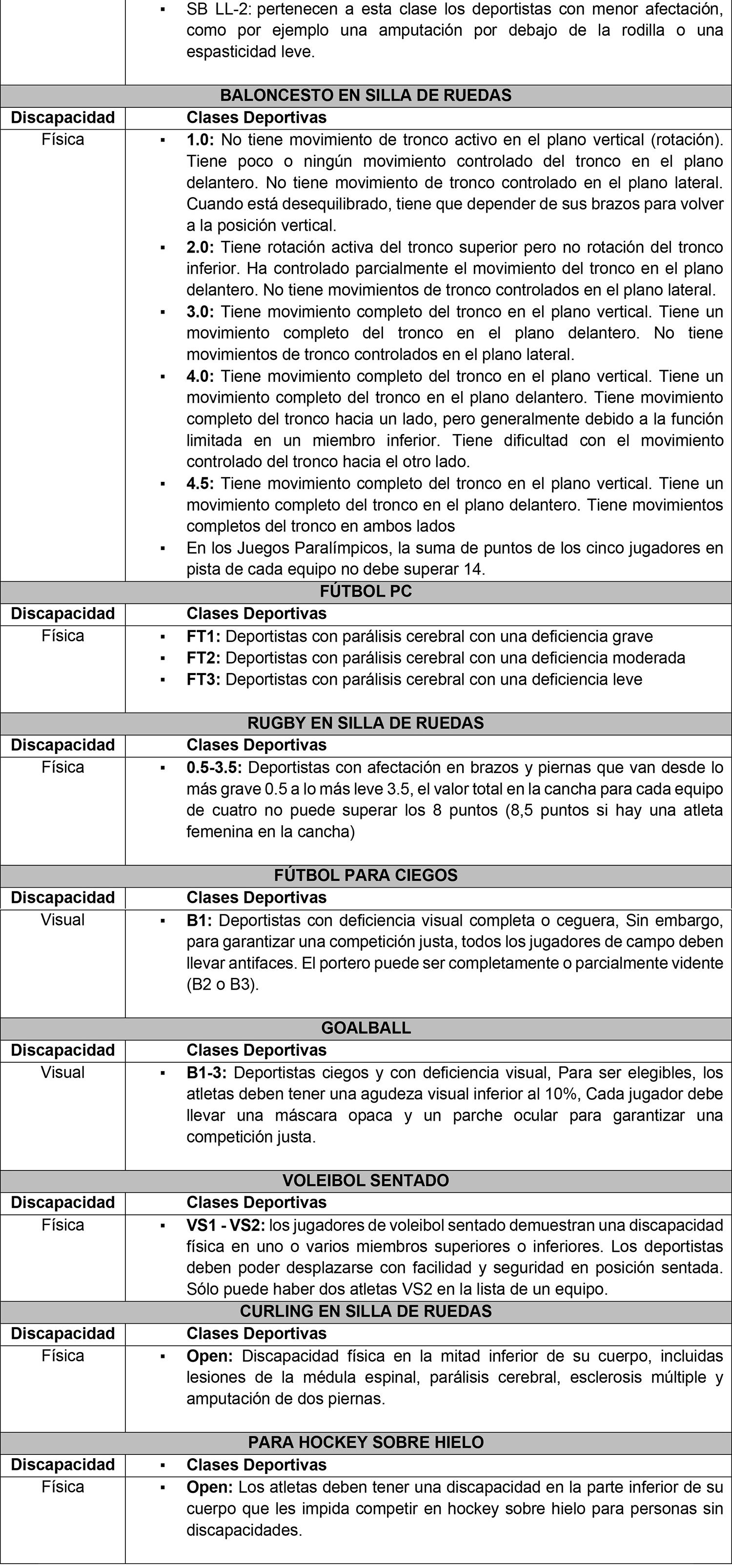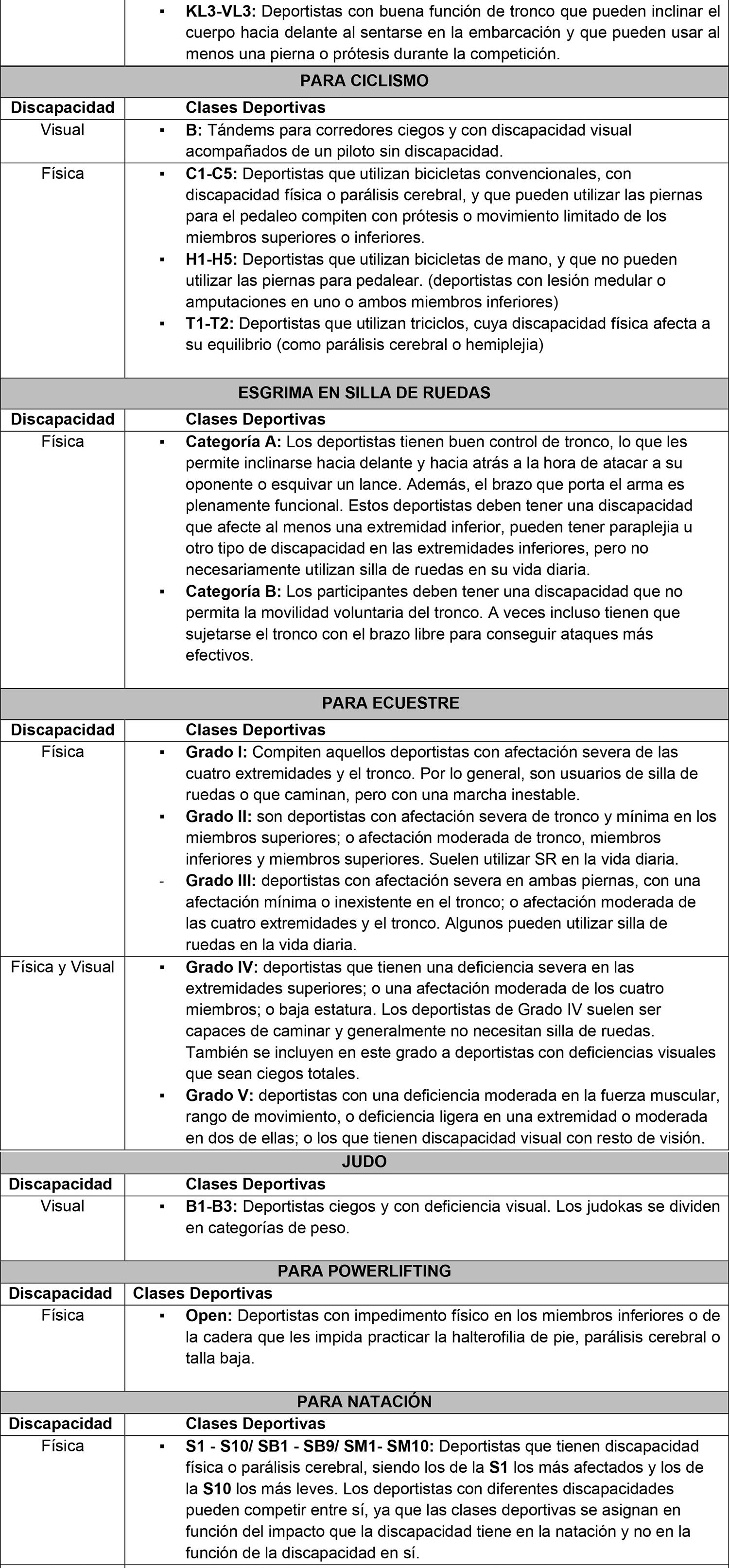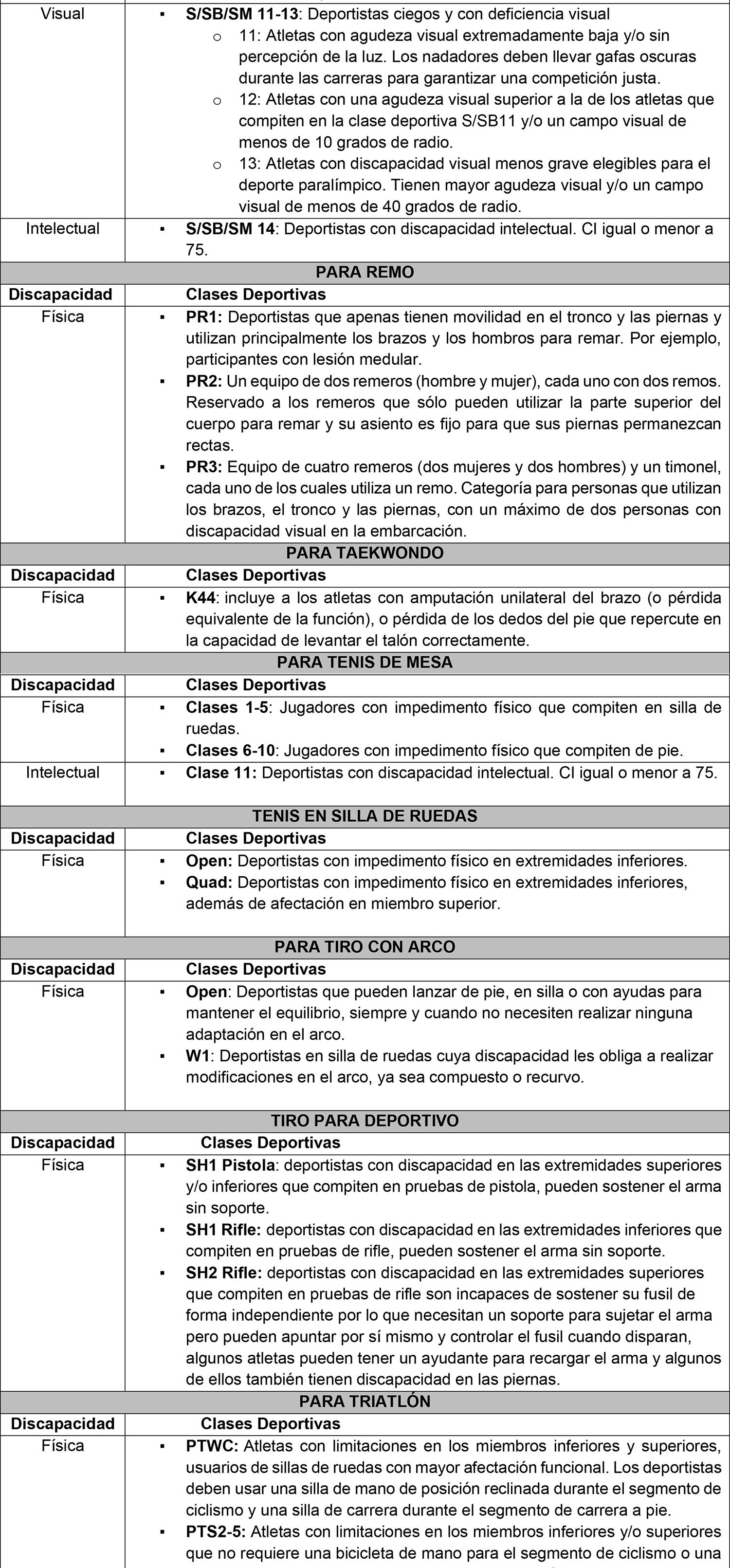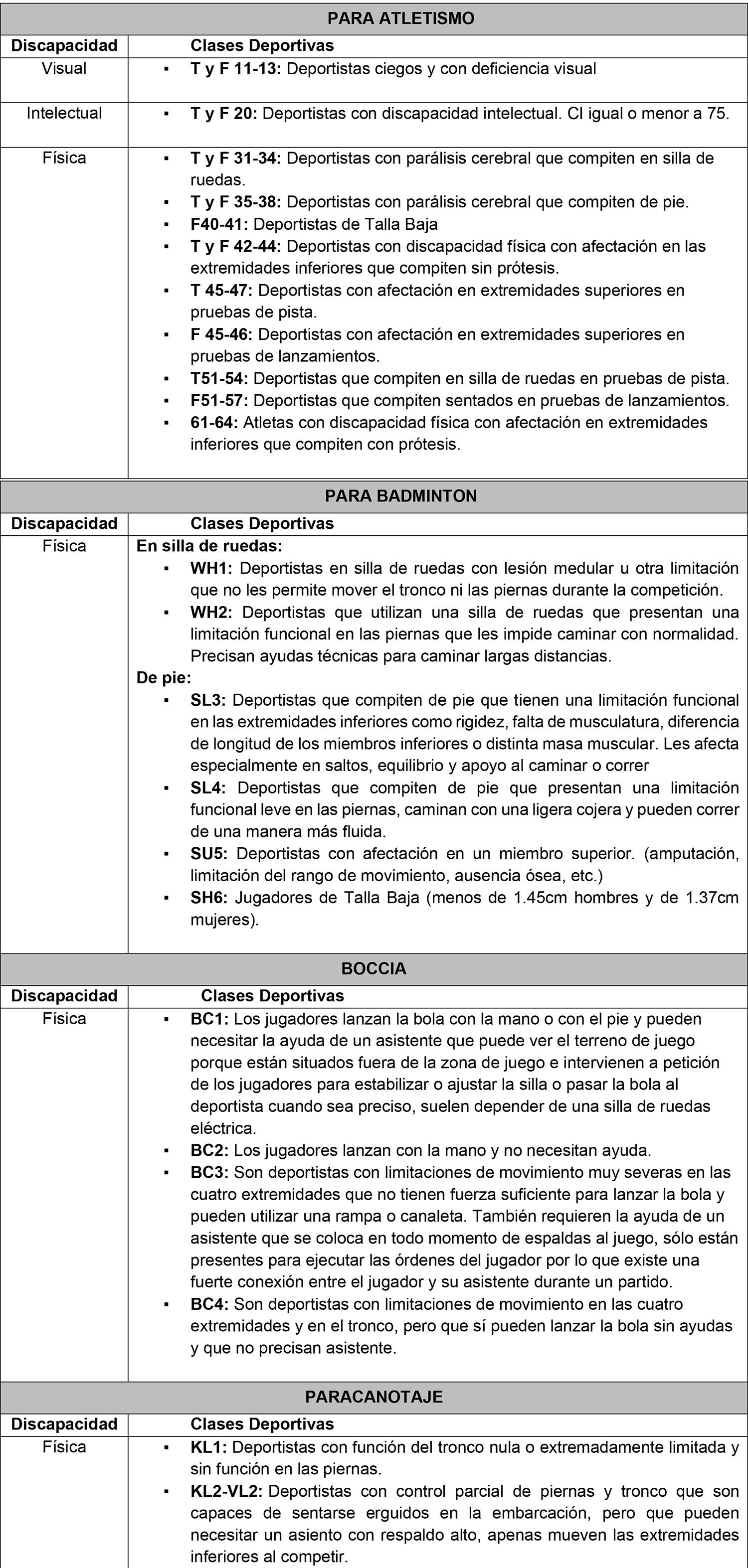 ANEXO N° III: DESCRIPCIÓN DE CLASES FUNCIONALES EN DEPORTE PARALÍMPICO.