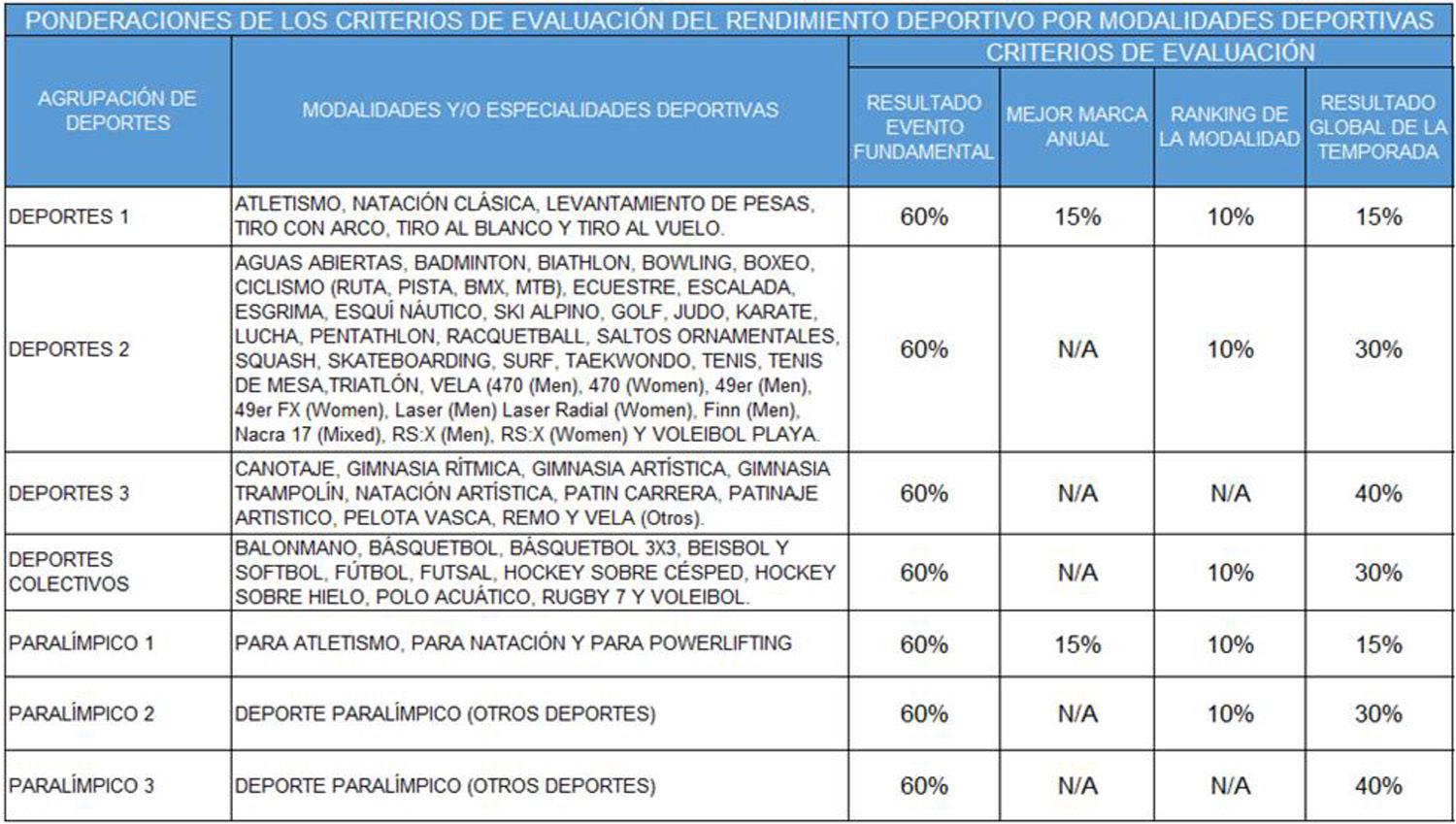 Para la evaluación de este criterio se considerará el último listado oficial de la temporada publicado por la federación internacional y solo en aquellas modalidades deportivas que cuenten con un ranking anual oficial.