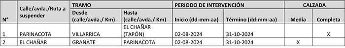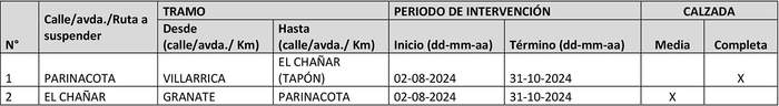 1. Prohíbase la circulación de todo tipo de vehículos motorizados, en todo horario, hasta el 31 de octubre de 2024, según cuadro adjunto, en las siguientes vías de la comuna de Copiapó: