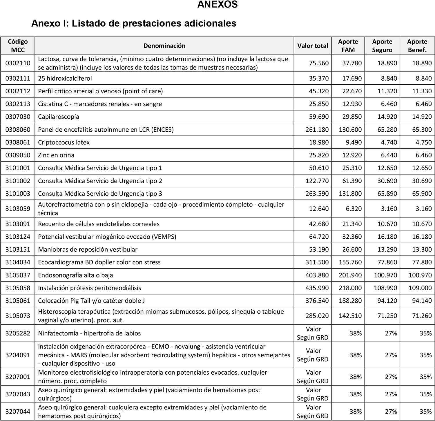 9. Se incorporan en el Arancel MCC 25 prestaciones de salud nuevas, con pertinencia sanitaria, que se denominan "prestaciones adicionales" de las cuales 21 son ambulatorias y de procedimiento, en tanto que 4 de ellas corresponden a prestaciones hospitalarias CMA. Estas prestaciones pasan a integrar los grupos 03, 31 y 32 del Arancel de la MCC y se detallan en el anexo I de la presente resolución.