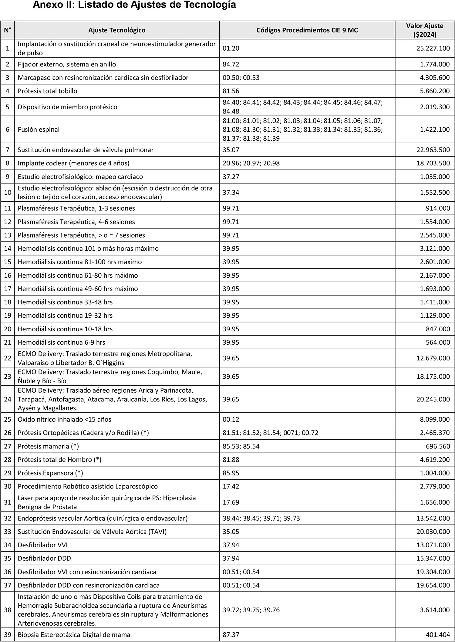 d) Ajustes de Tecnología, que considera prestaciones, dispositivos, fármacos, prótesis o insumos que son parte de una intervención sanitaria y se pagan adicional al pago otorgado por el mecanismo de pago GRD y respecto de los procedimientos CIE9-MC definidos. (Anexo II). El pago de estos ajustes será de cargo de la prima complementaria.