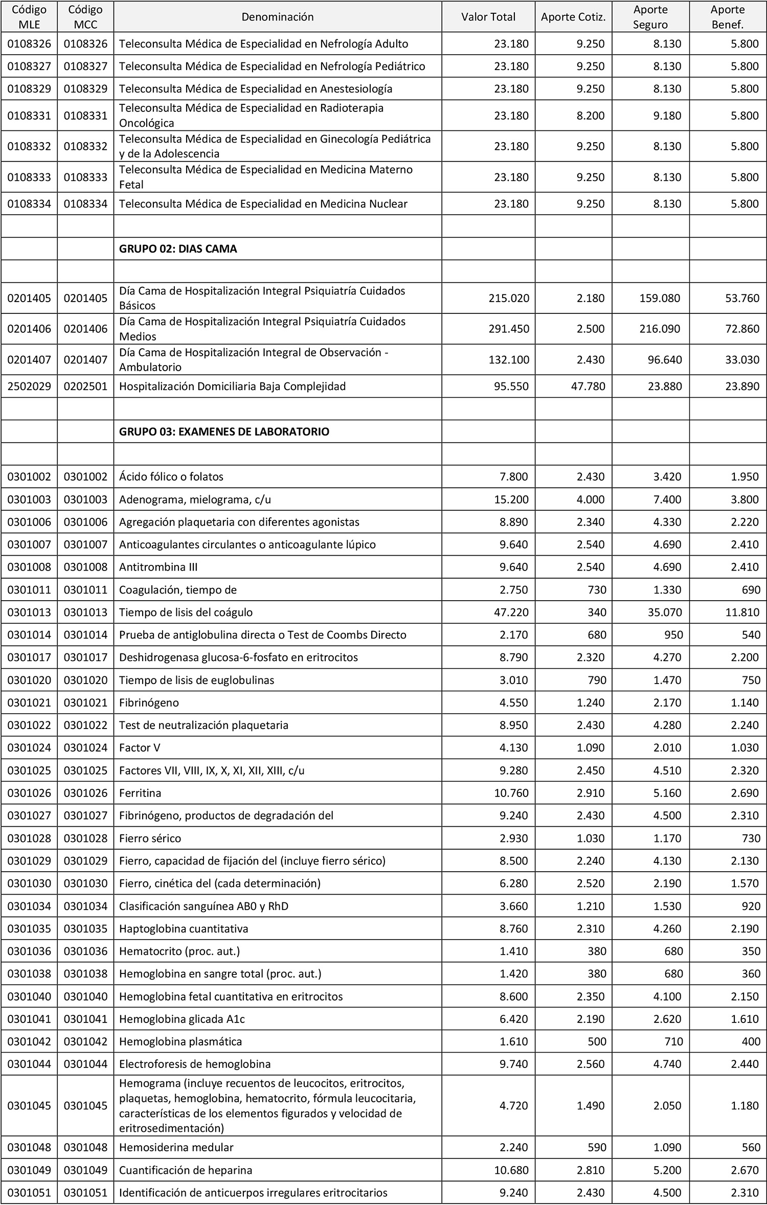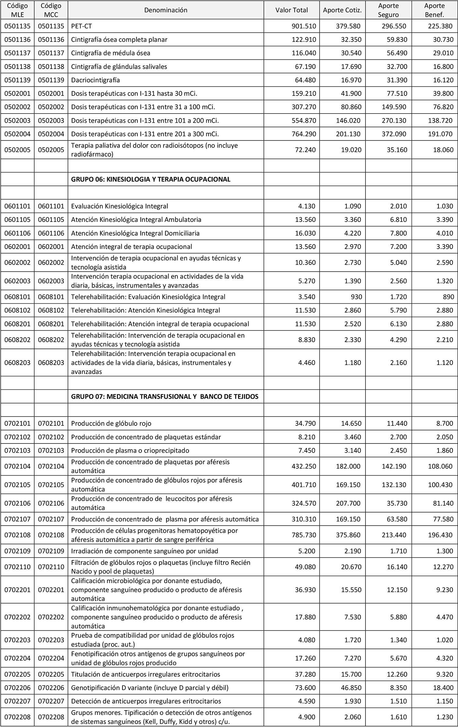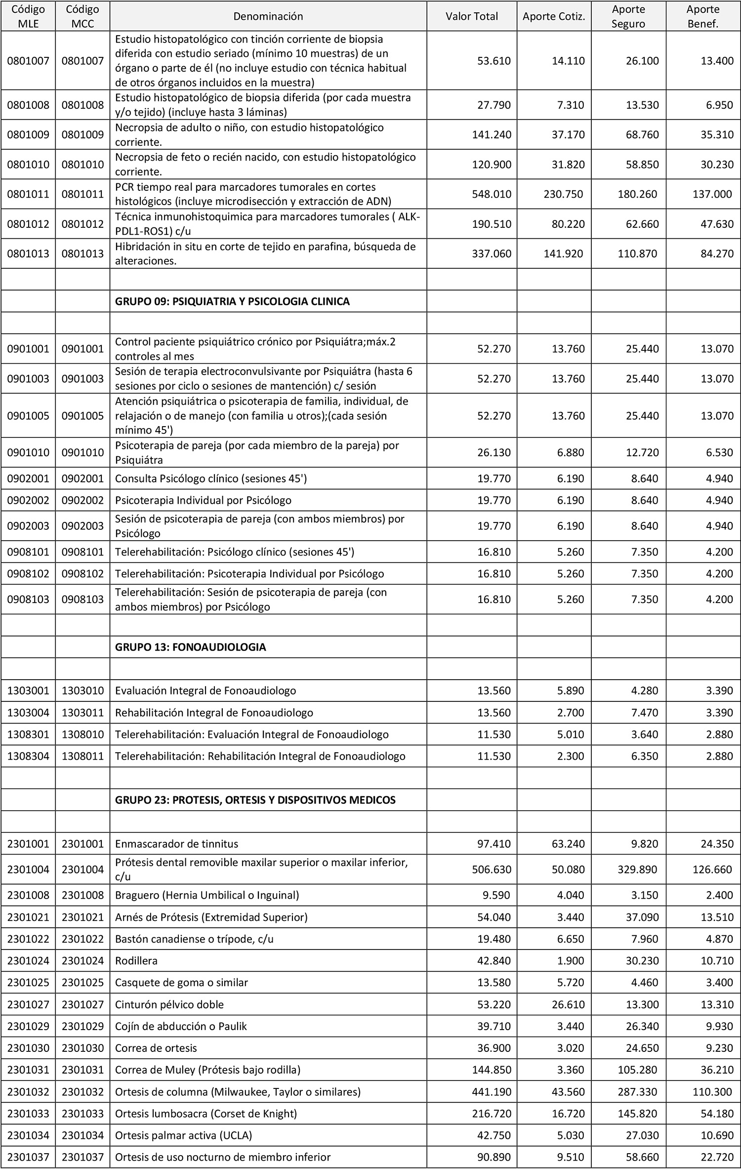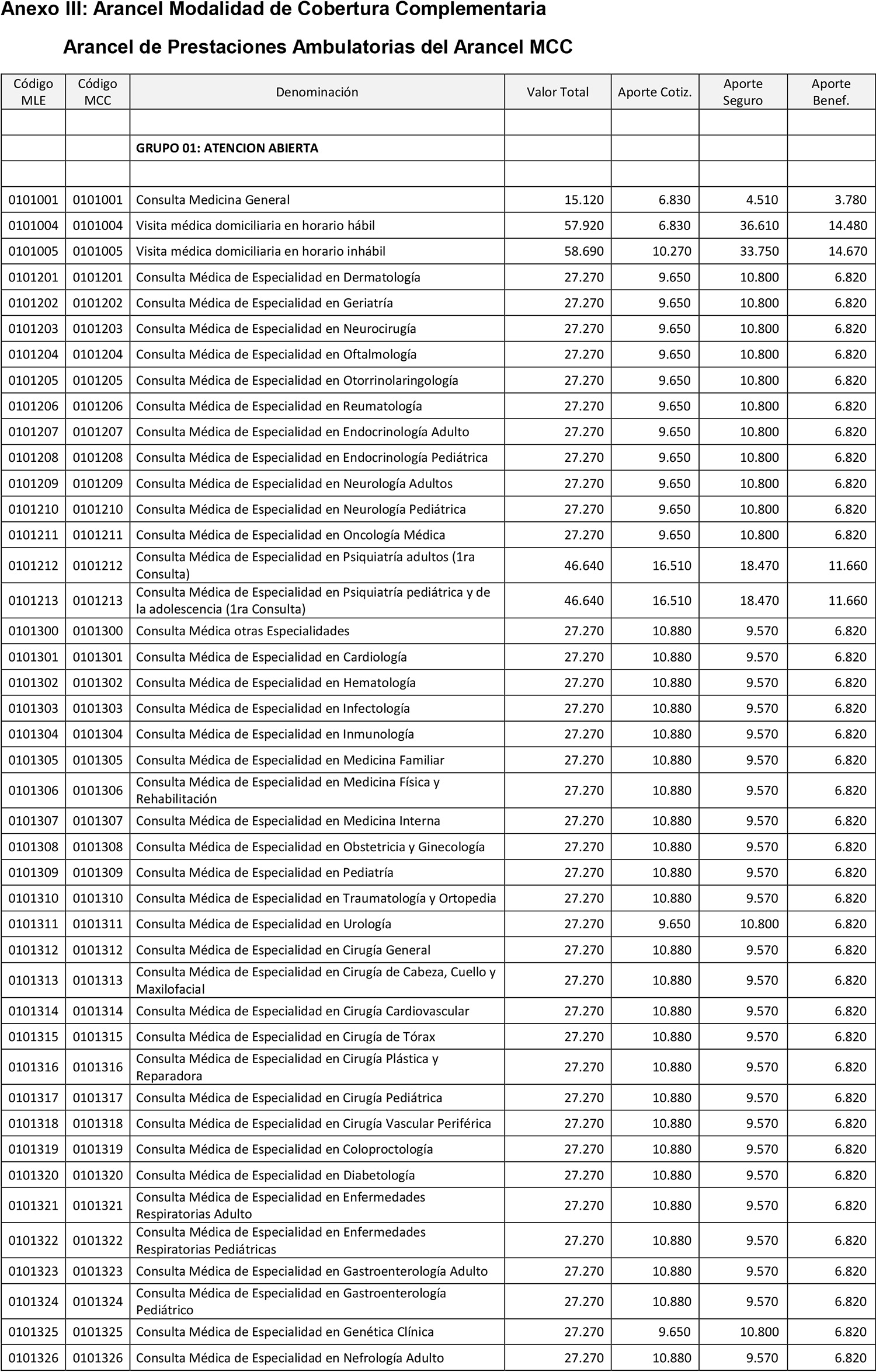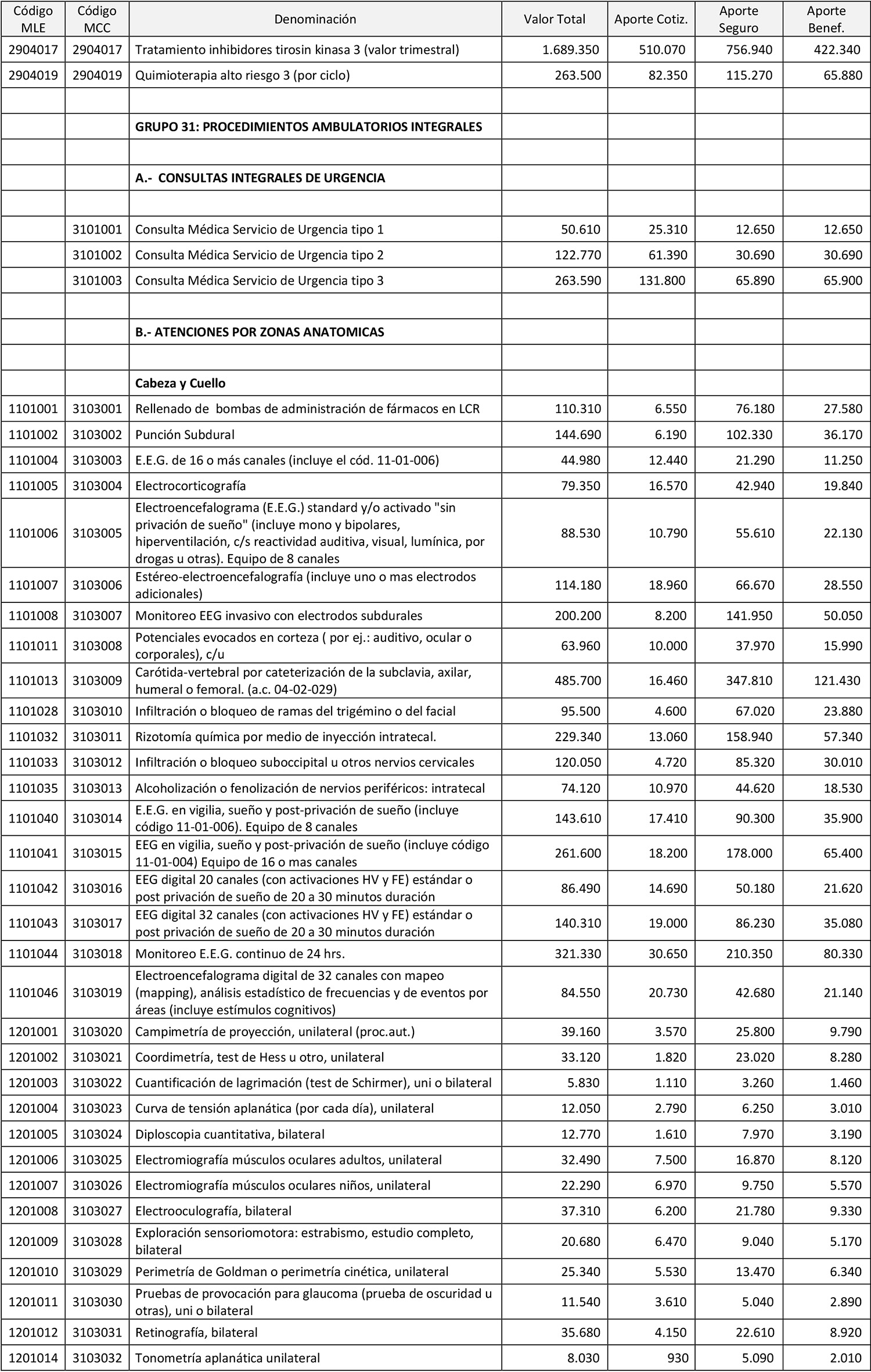 a) Prestaciones ambulatorias del Arancel MLE, que han sido reorganizadas en los siguientes grupos 01, 02 (códigos 0201405, 0201406, 0201407 y 0202501), 03, 04, 05, 06, 07, 08, 09, 13, 23, 24, 26, 29 y 31.