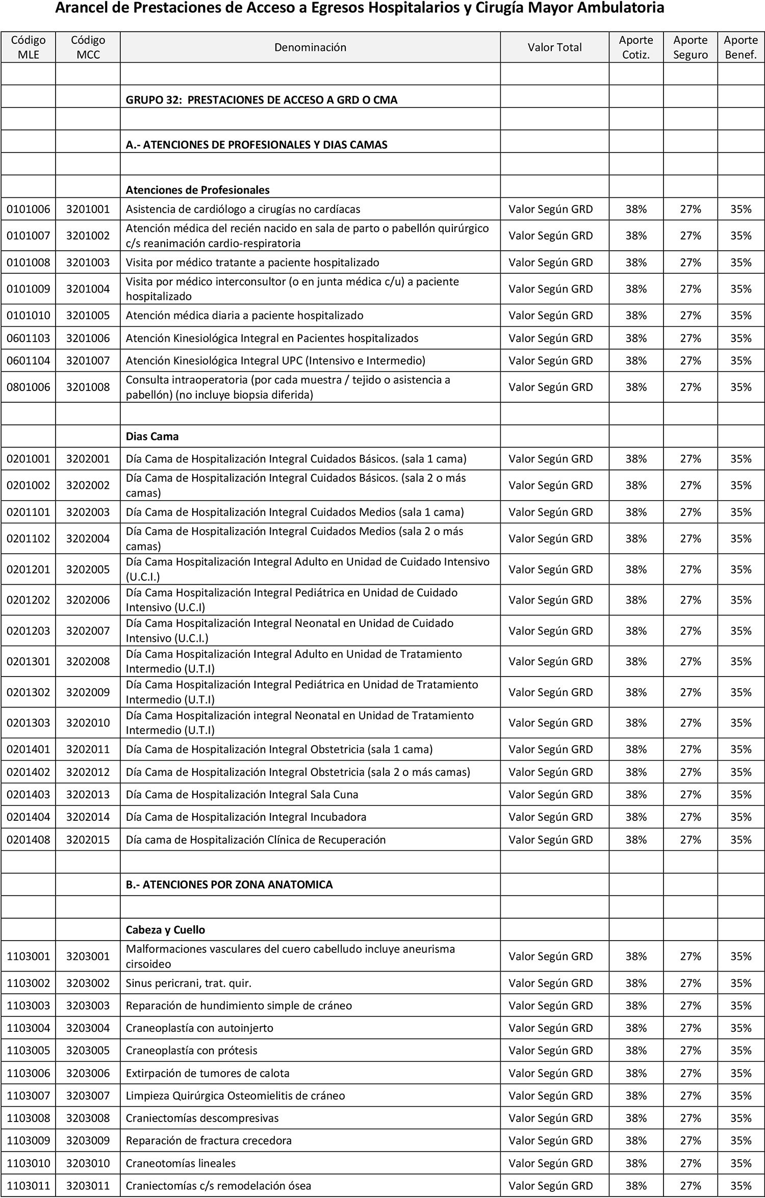c) Se reformulan los grupos del 11 al 12 y del 14 al 21 del Arancel de la MLE. Las prestaciones de estos grupos pasan a integrar dos nuevos grupos en la MCC que se denominan Grupo N° 31 "Procedimientos ambulatorios integrales" y Grupo N° 32 "Prestaciones de acceso a GRD o CMA" (Grupos Relacionados por Diagnóstico o Cirugía Mayor Ambulatoria). Los procedimientos ambulatorios integrales consideran todos los elementos que se requieren para la atención de salud que están incluidos en el valor arancelado, en tanto que las prestaciones de acceso a GRD o CMA definen las prestaciones que tienen cobertura en la MCC.