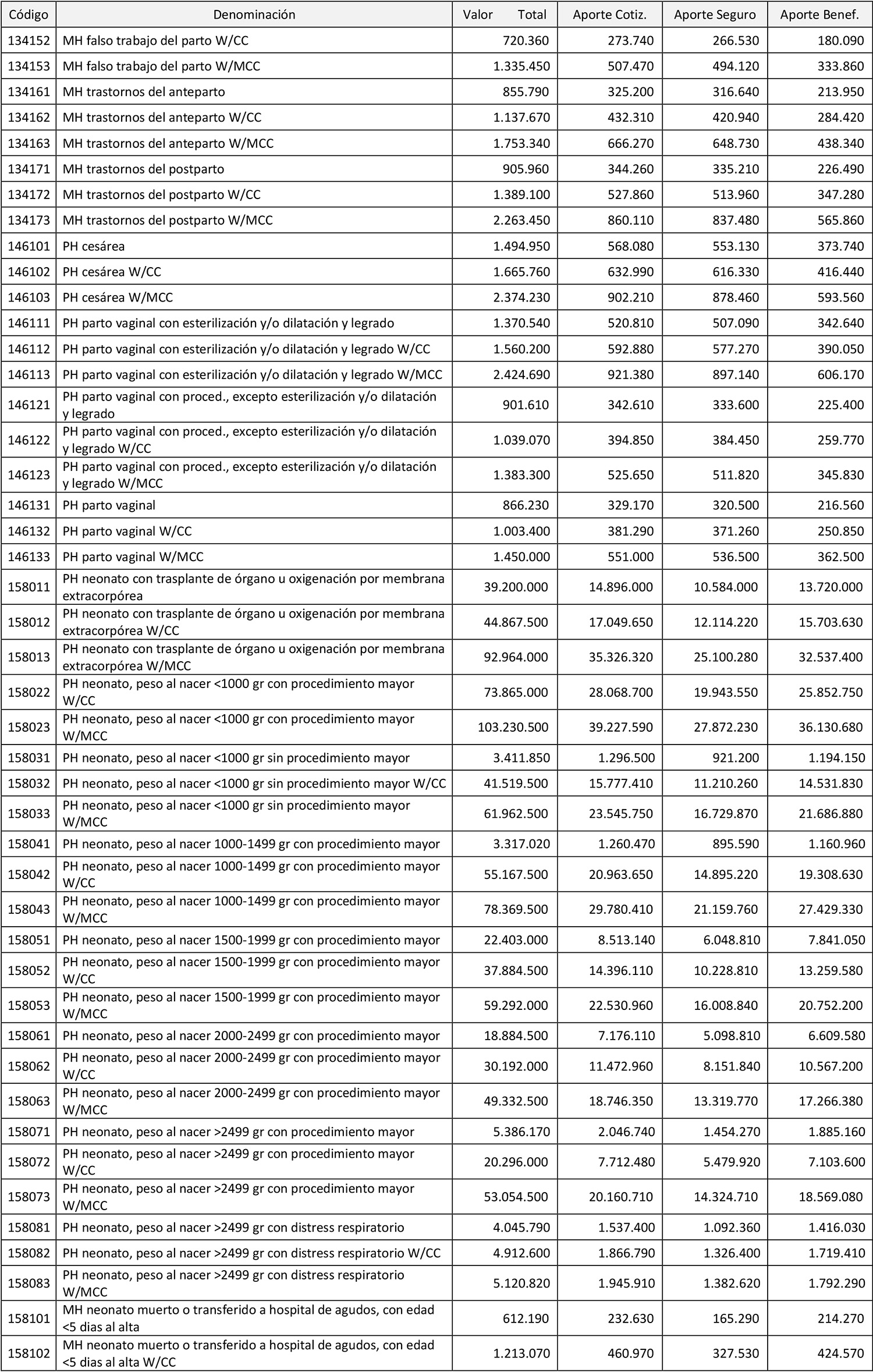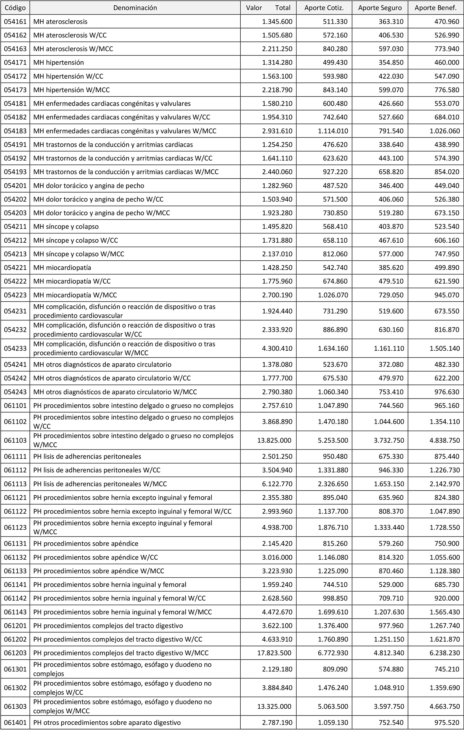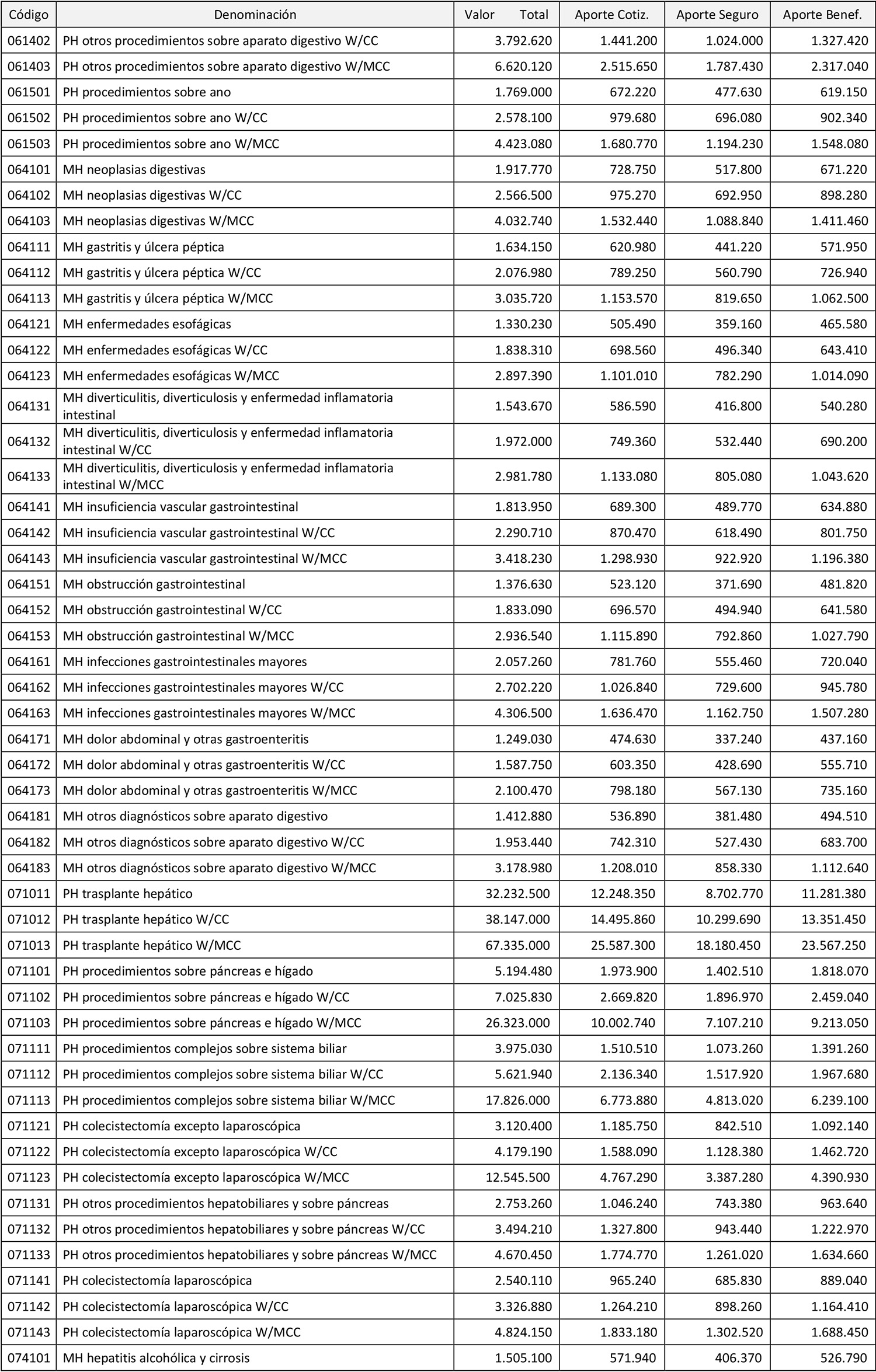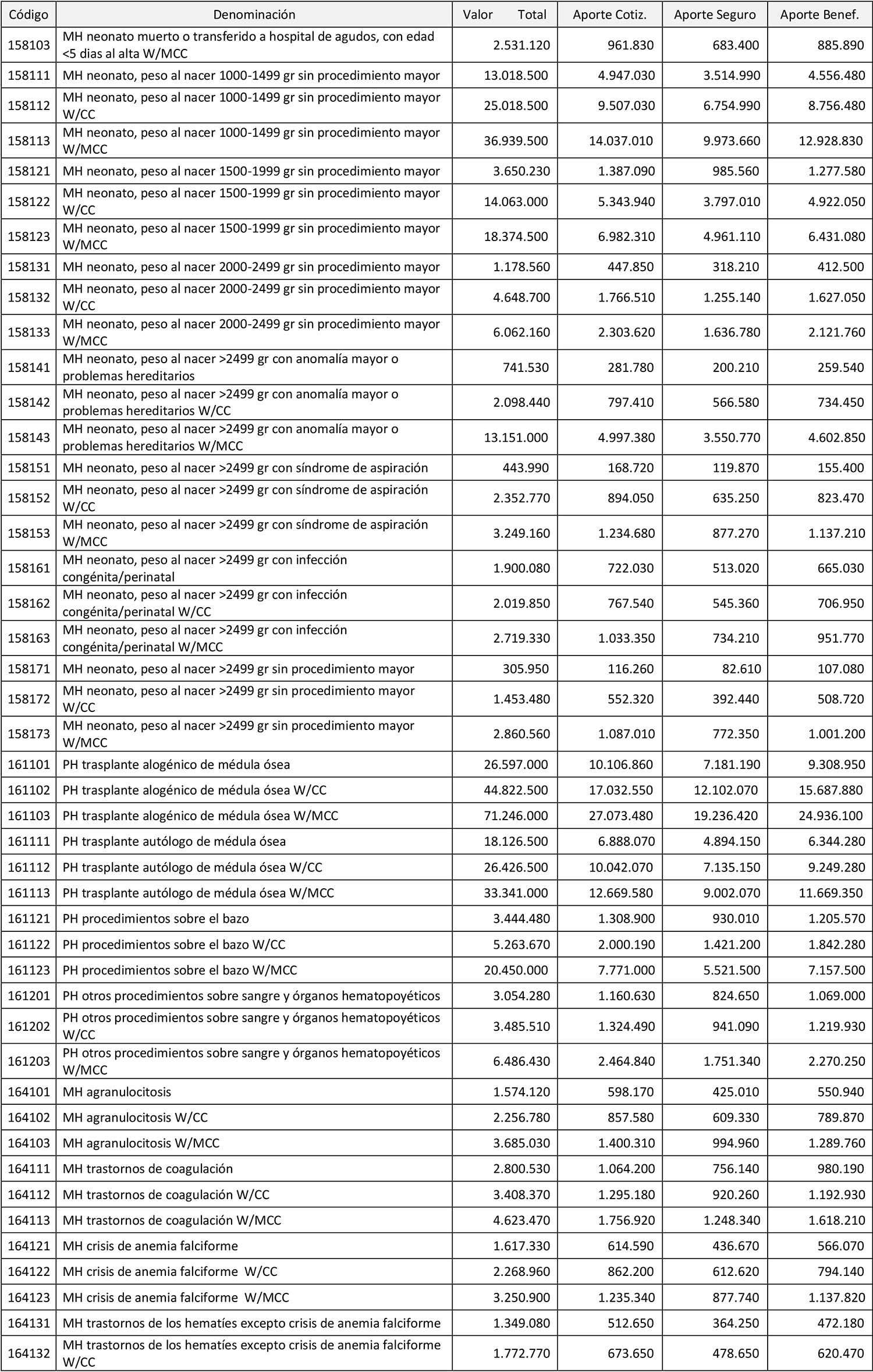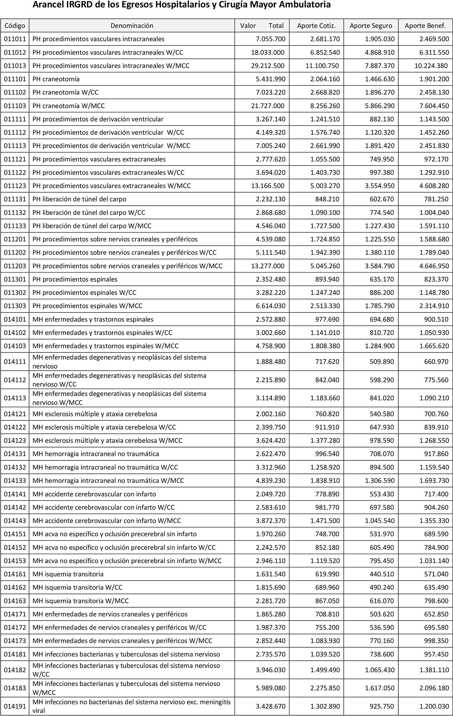 Artículo 5. Los precios base GRD establecidos en el Arancel MCC son los siguientes: