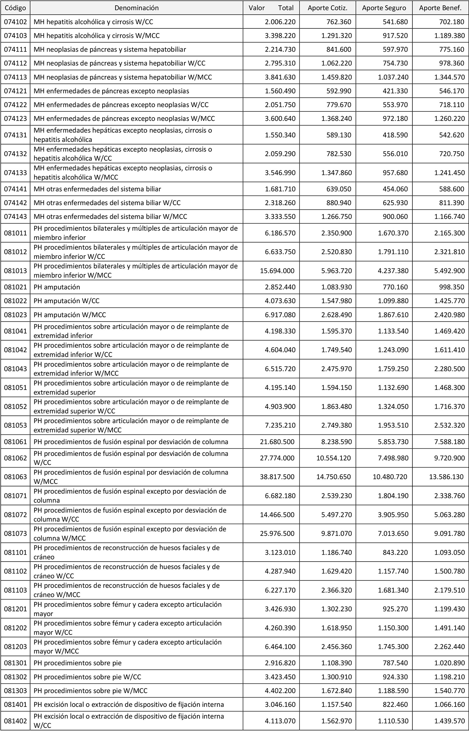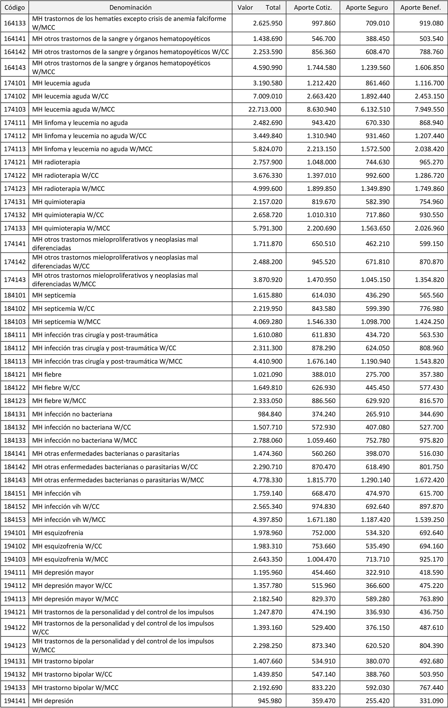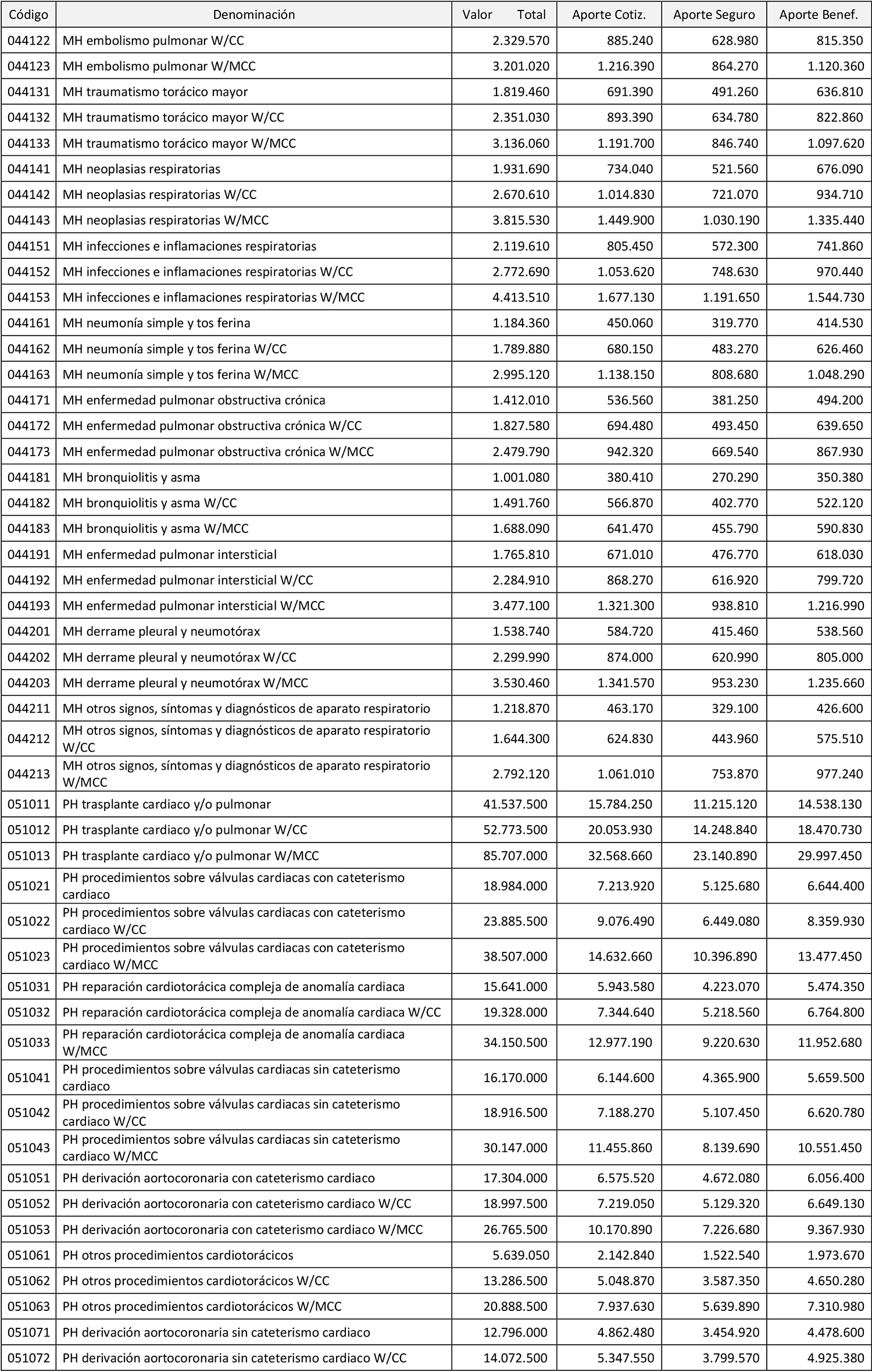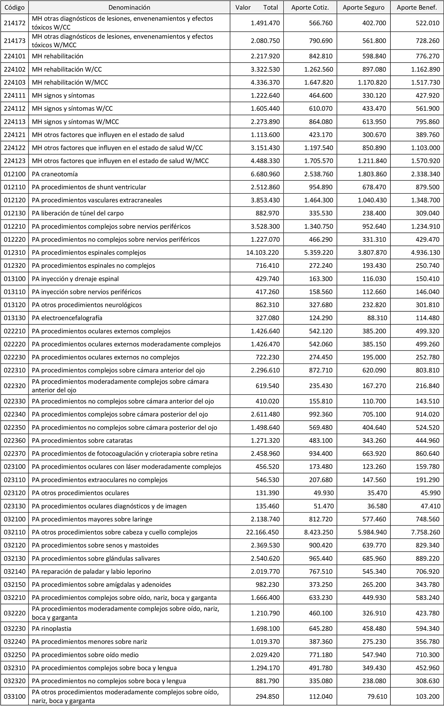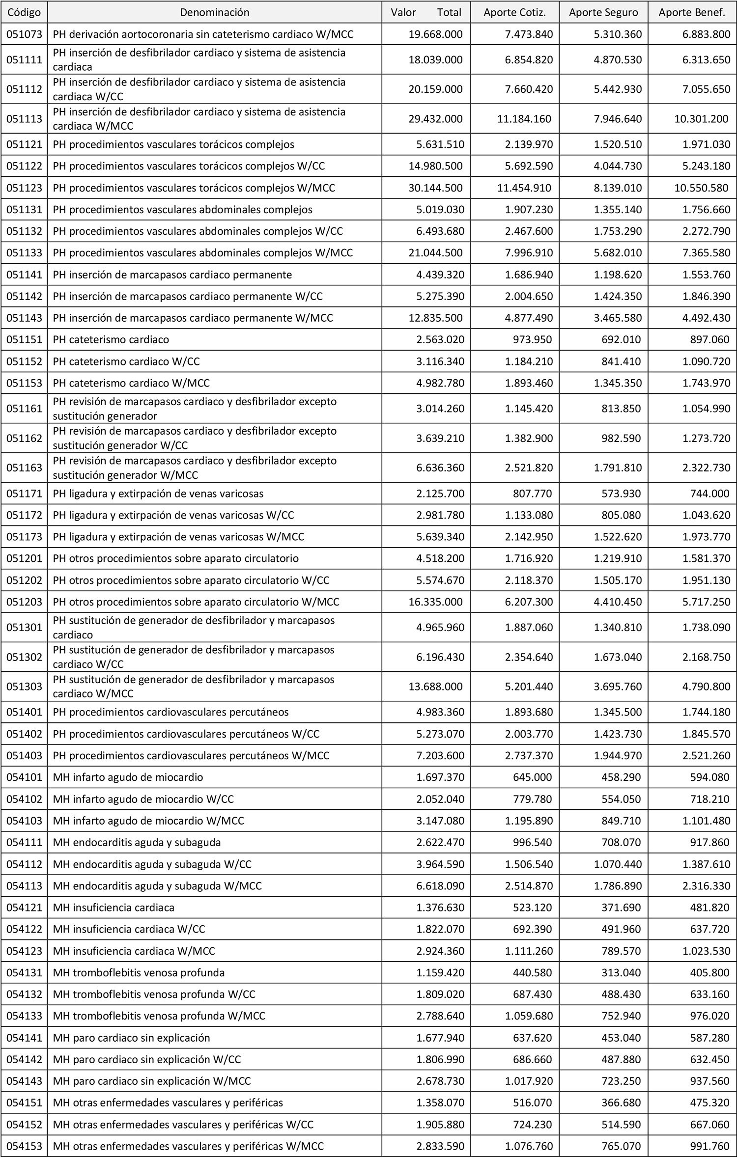 Artículo 5. Los precios base GRD establecidos en el Arancel MCC son los siguientes: