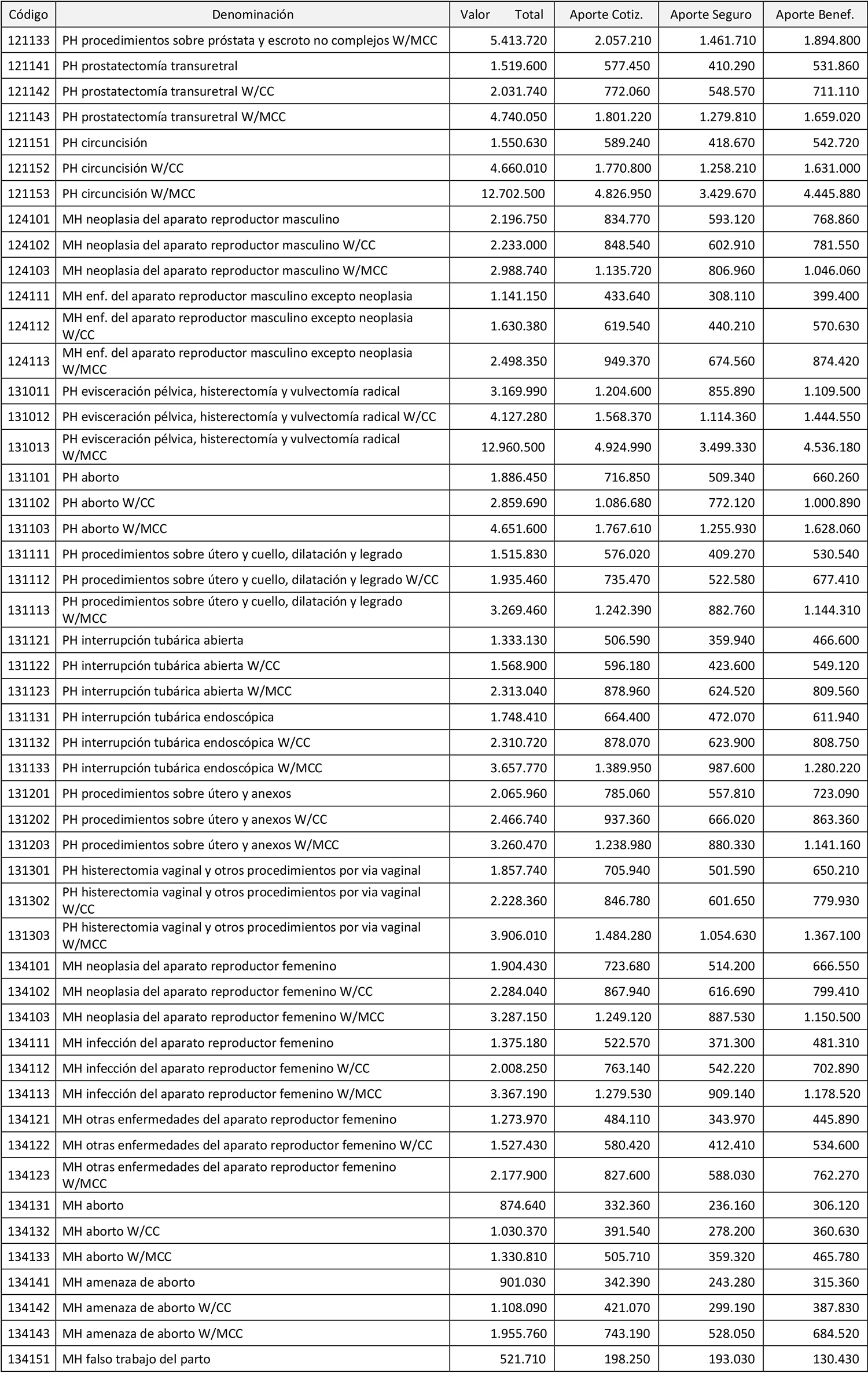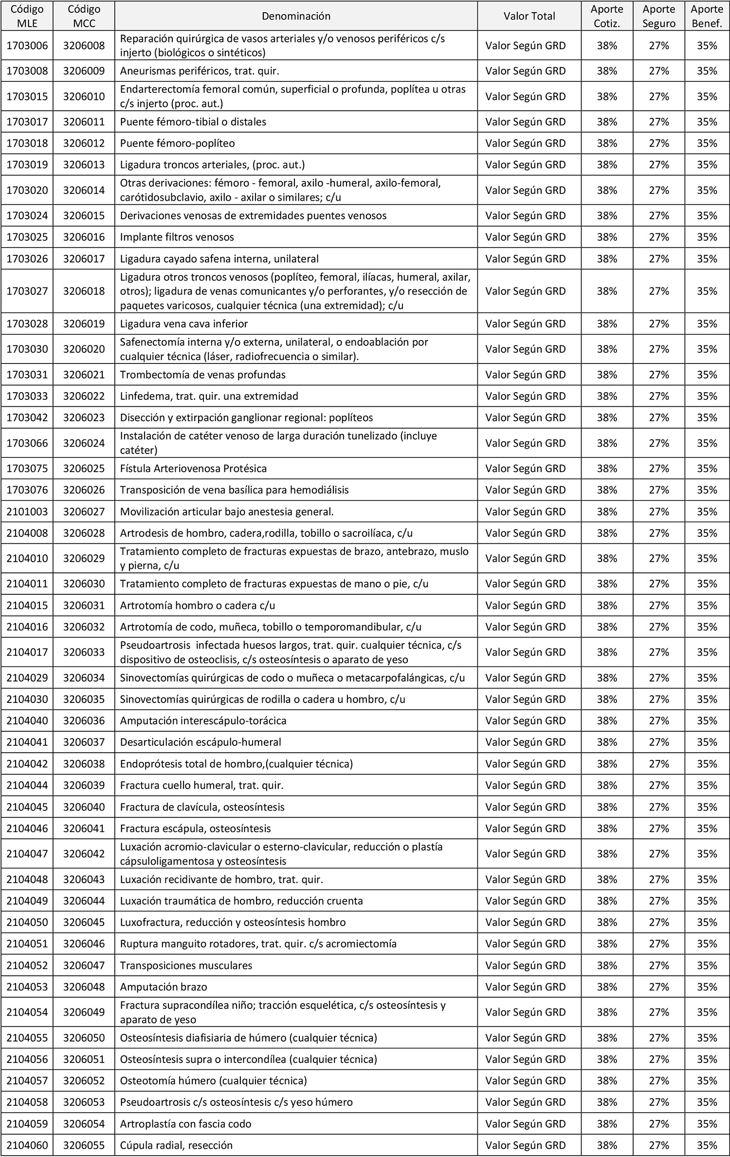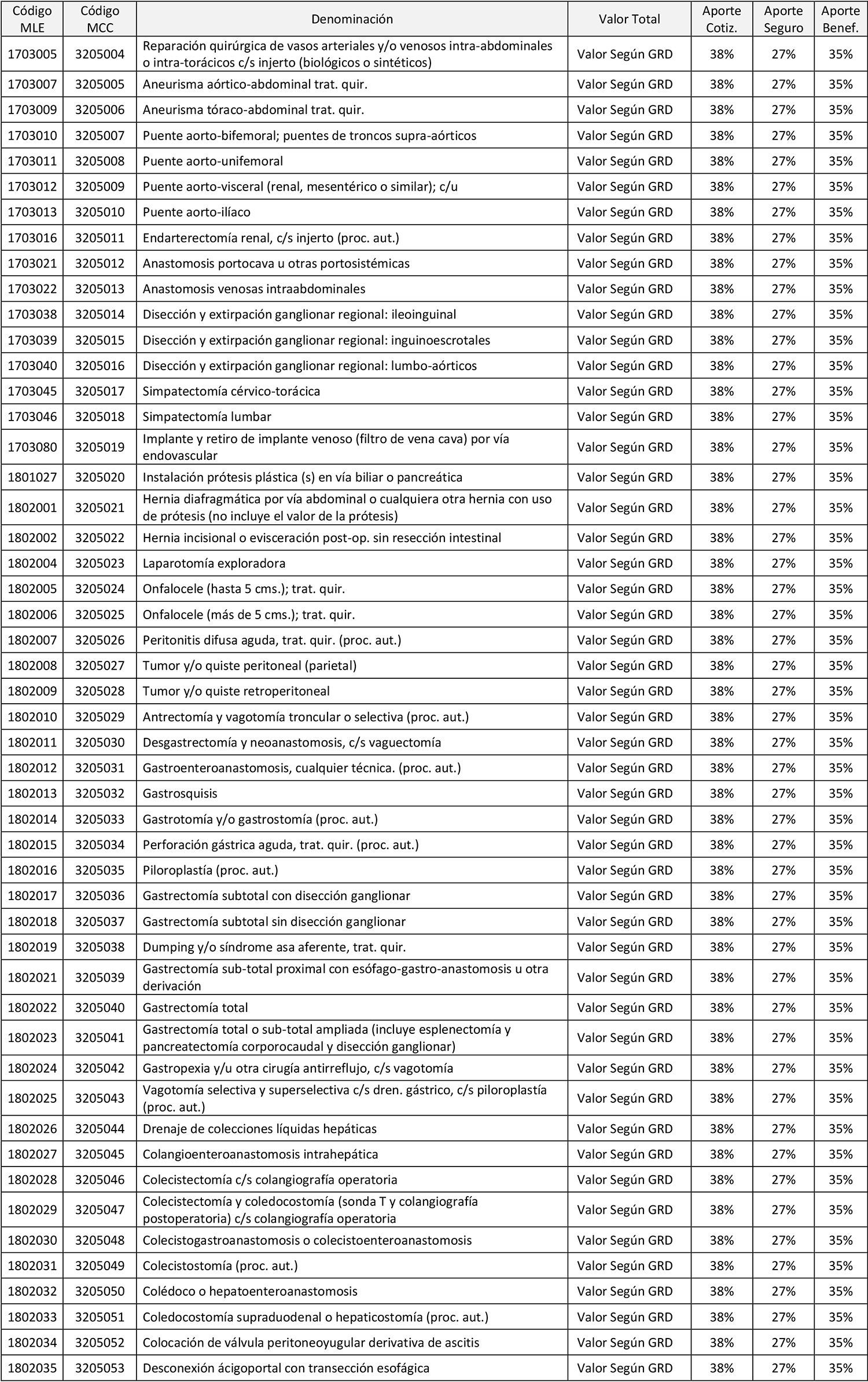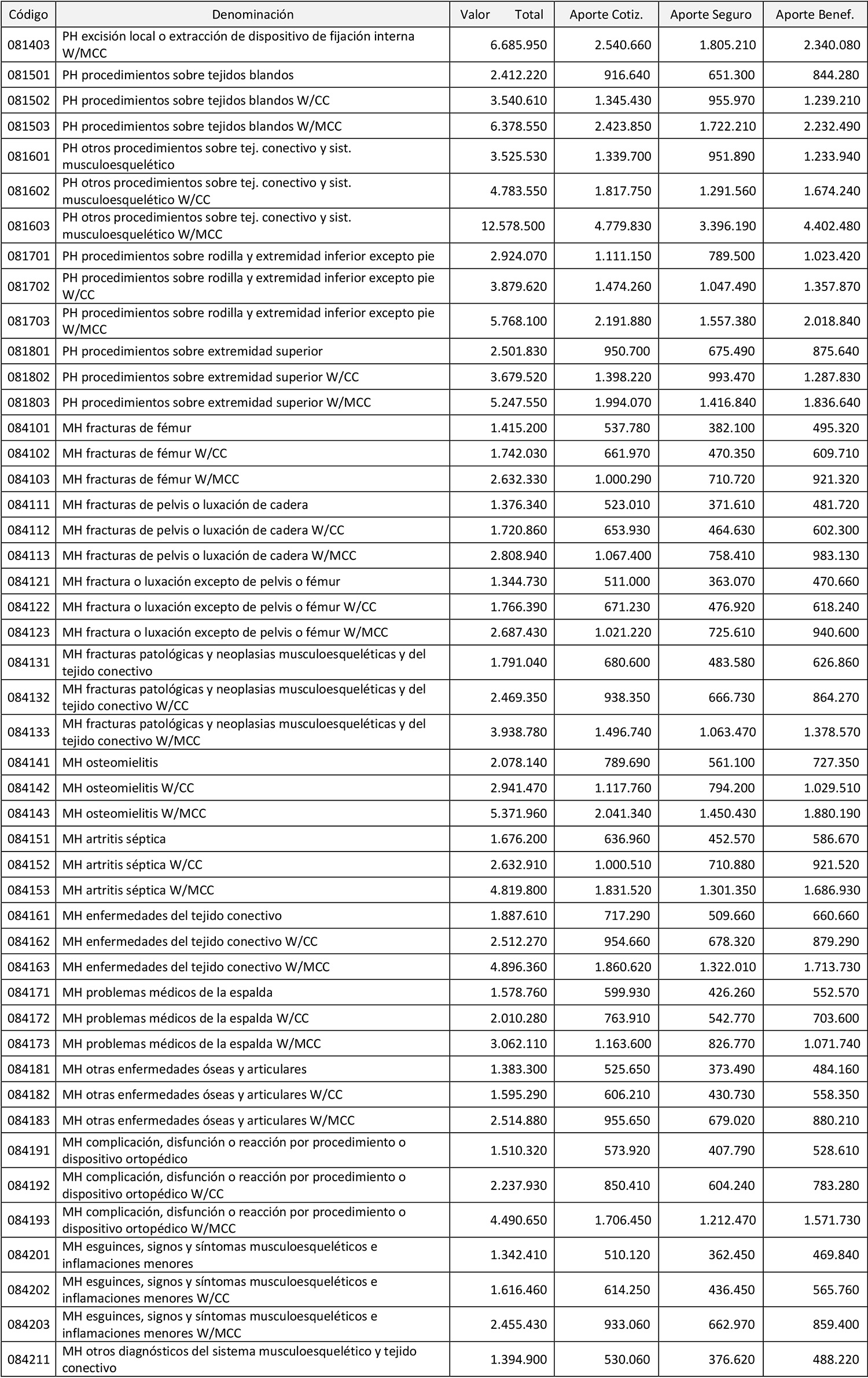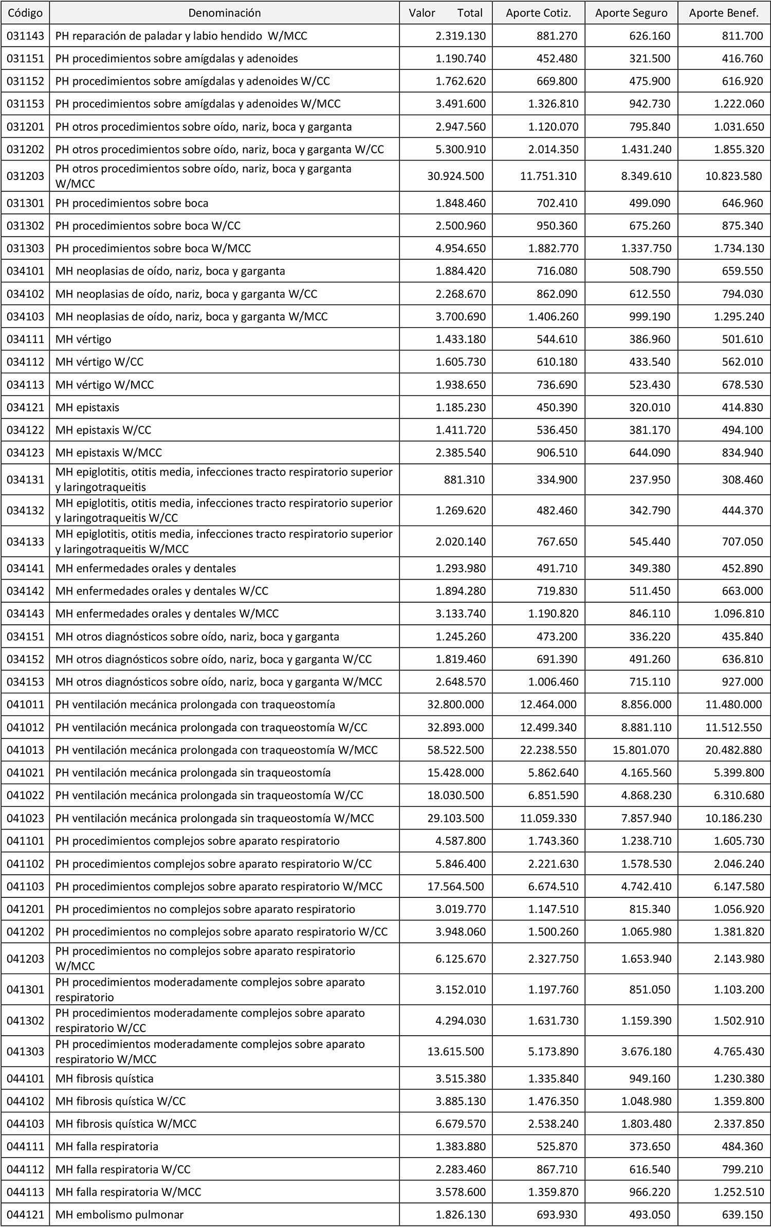 Artículo 5. Los precios base GRD establecidos en el Arancel MCC son los siguientes: