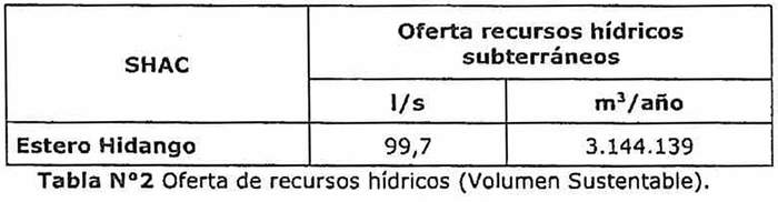 12. Que, ahora bien, por medio del decreto Nº 293, de 27 de abril de 2018, del Ministerio de Obras Públicas, se reservan 156.999 m3/año bajo la figura de derechos en carácter de provisionales, para el abastecimiento de la población en el sector hidrogeológico de aprovechamiento común denominado Estero Hidango, quedando como demanda total la siguiente: