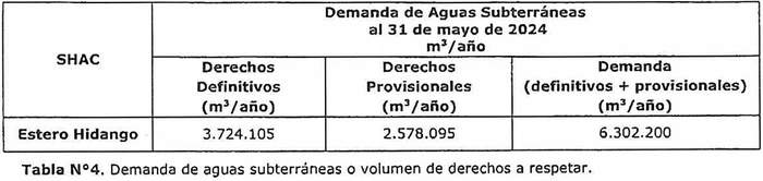 13. Que, luego del análisis de la oferta de recursos hídricos y la demanda de aguas subterráneas, se puede concluir que en el sector hidrogeológico de aprovechamiento común, denominado Estero Hidango, la demanda de aguas subterráneas, al 31 de mayo de 2024, compromete la disponibilidad total factible de otorgar conforme a los estudios técnicos desarrollados por la Dirección General de Aguas.