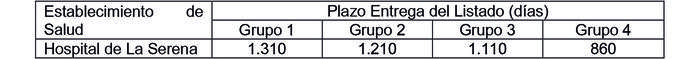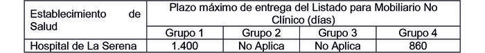 4. Modifícanse, por razones de interés público, las características de las obras y servicios del contrato de concesión de la obra pública fiscal denominada "Hospital de La Serena", en el sentido que, como consecuencia de lo dispuesto en el N° 1 del presente decreto supremo, se modifican los plazos máximos de entrega de listados para el proceso de adquisición del Mobiliario No Clínico durante la Etapa de Construcción, que se señalan en la letra B. del artículo 1.3 del Anexo B de las Bases de Licitación, quedando como se indican en el Cuadro N° 2 siguiente:
