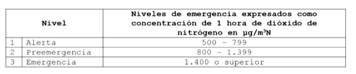 Tabla 1. Niveles de emergencia expresados como concentración de 1 hora de dióxido de nitrógeno.