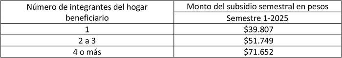 12. Que, para efectos de la determinación del monto máximo de recursos disponibles para financiar el subsidio transitorio al pago del consumo de energía eléctrica del primer semestre del año 2025, se ha considerado también que, conforme a los montos establecidos para dicho subsidio en el artículo 5° del procedimiento regulado en el artículo segundo del decreto 136/2024 y sus modificaciones posteriores, para el proceso correspondiente al primer semestre del año 2025, los montos semestrales corresponden a los siguientes: