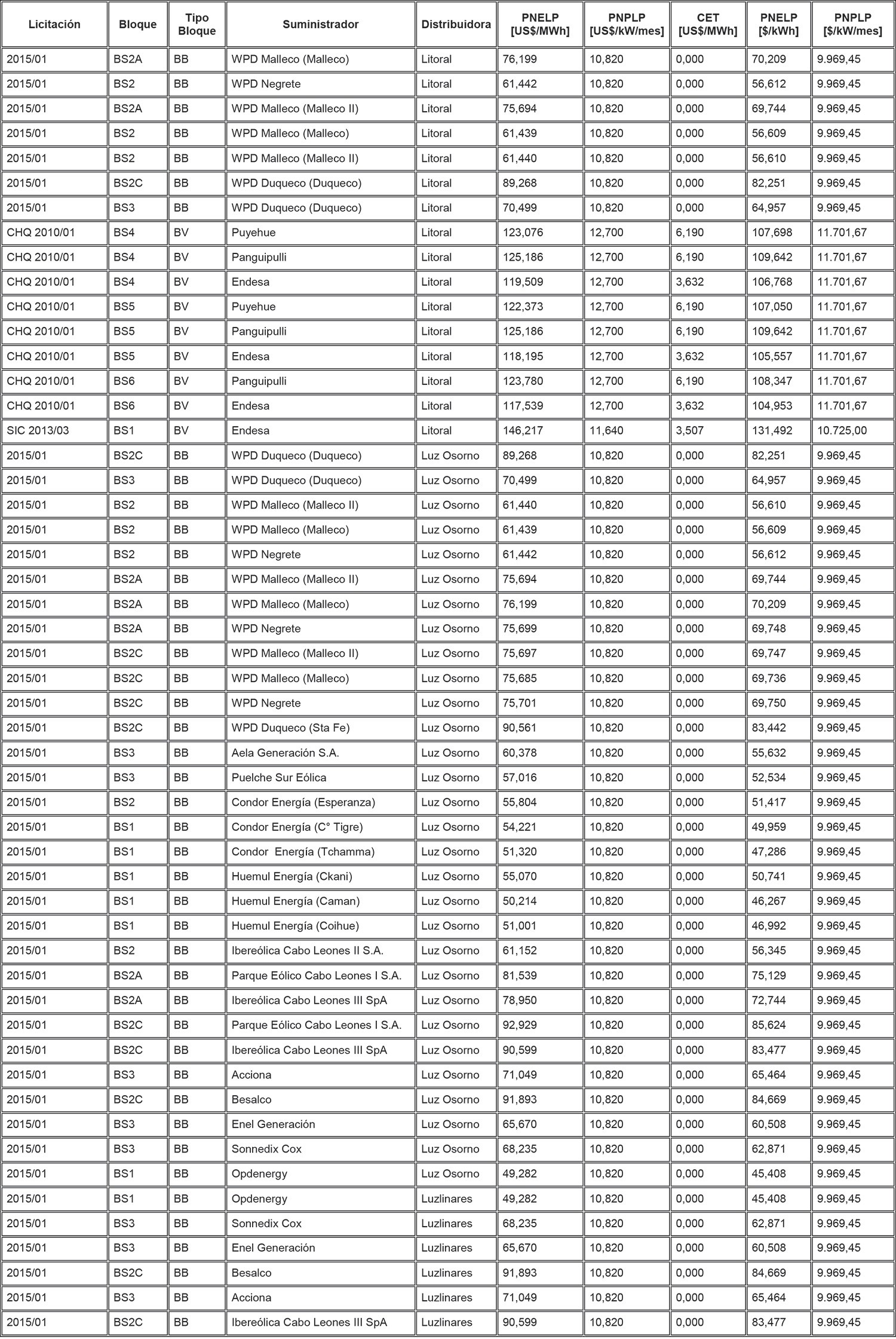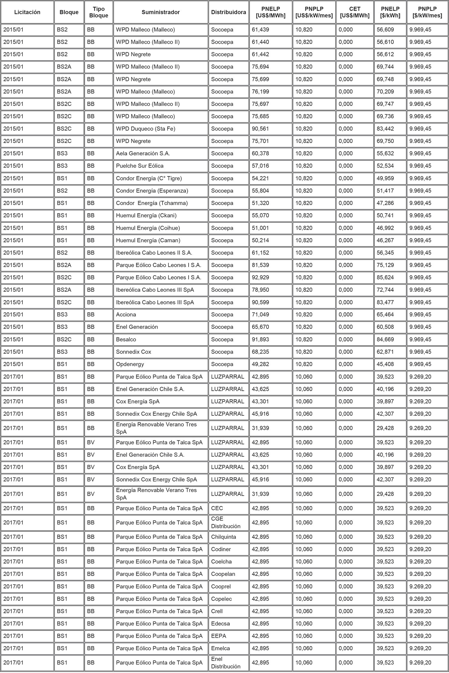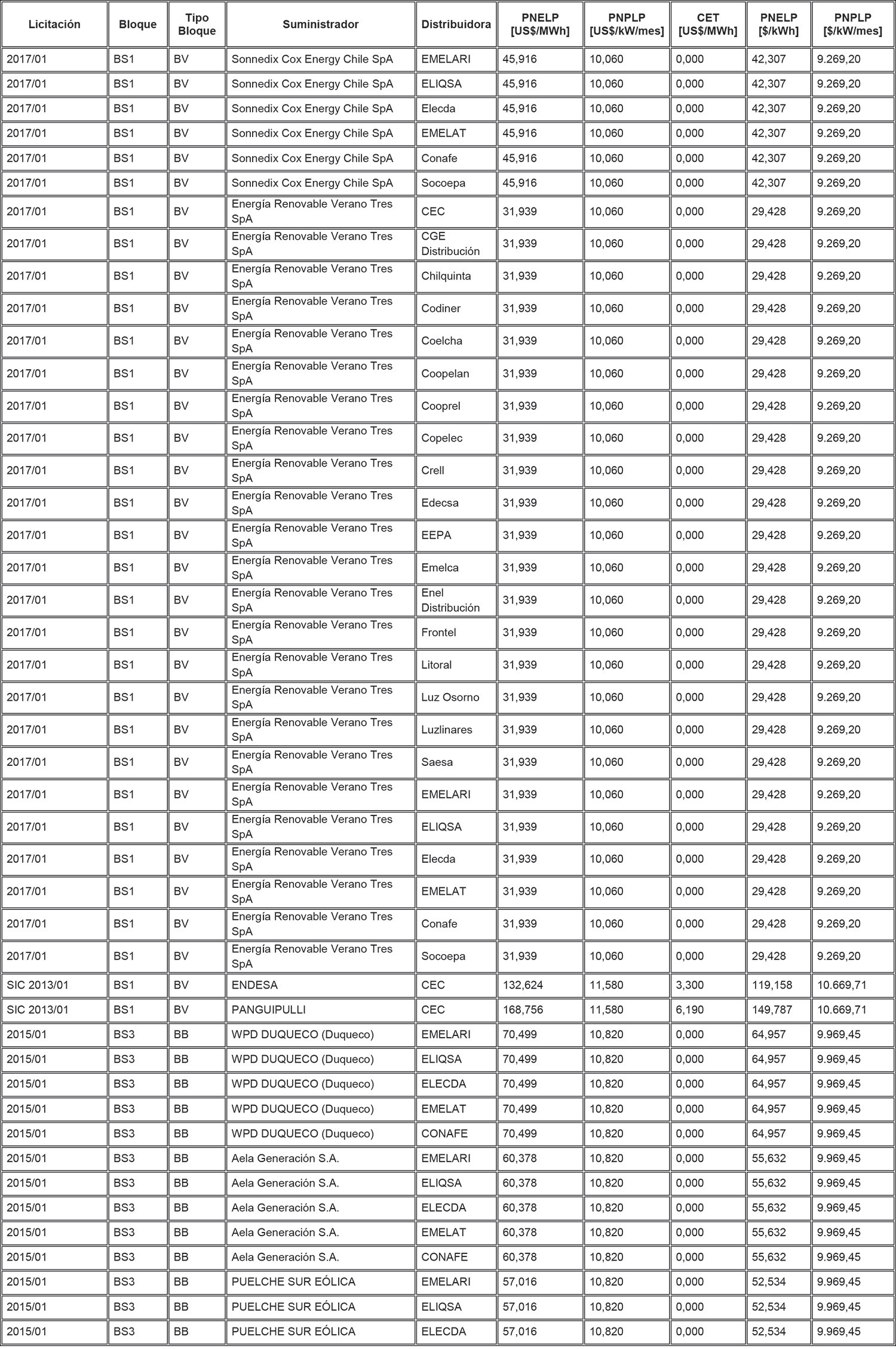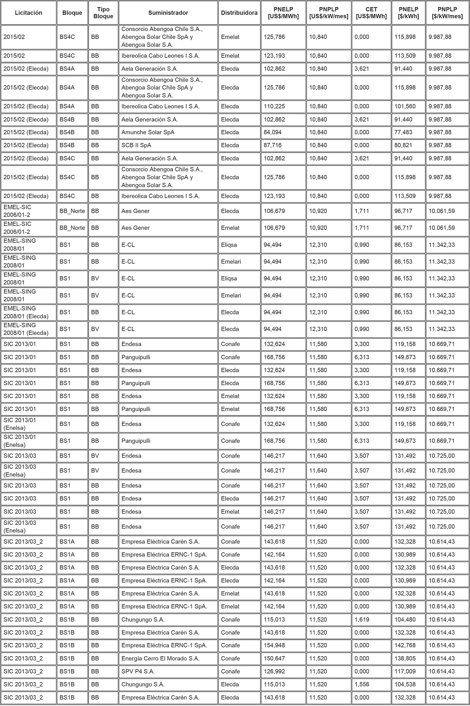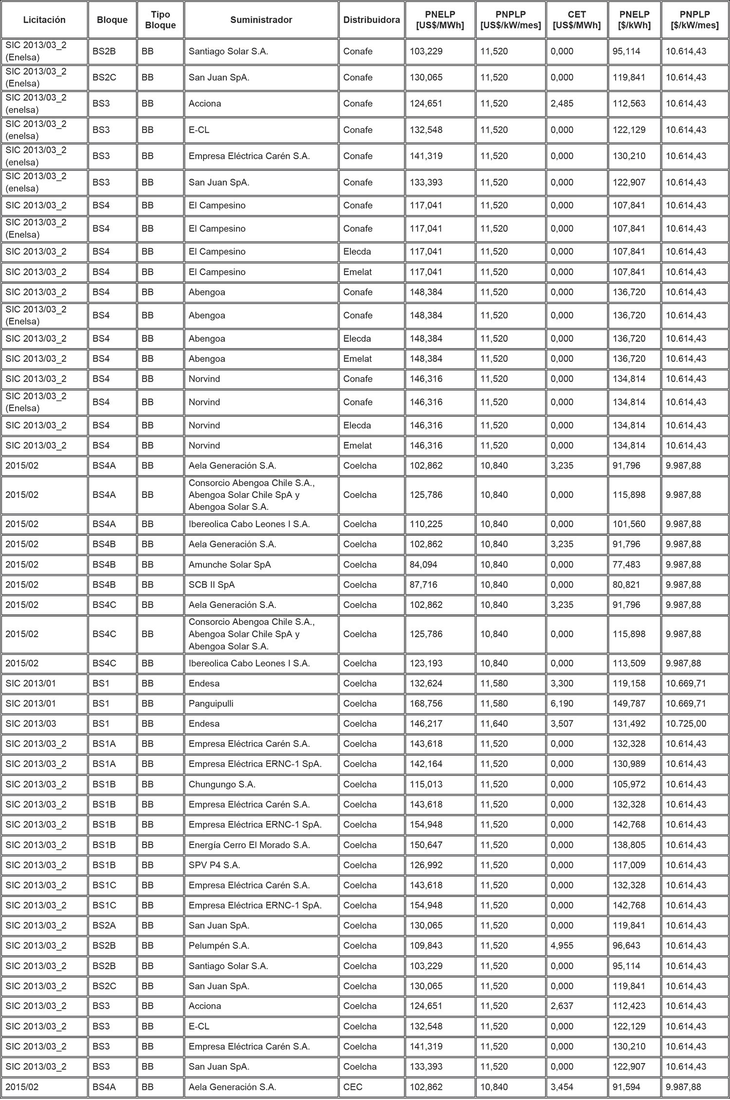 Los Precios de Nudo de Largo Plazo de energía y potencia, de acuerdo con lo señalado en los artículos 6° y 11° de la resolución exenta N° 703, y los descuentos del monto del Cargo Equivalente de Transmisión Final ("CET") en el precio total de energía de los contratos modificados de acuerdo a lo señalado en el artículo vigesimoquinto transitorio, letra E. número i., de la ley N° 20.936 y en la resolución exenta N° 7, son los que se indican en la siguiente tabla: