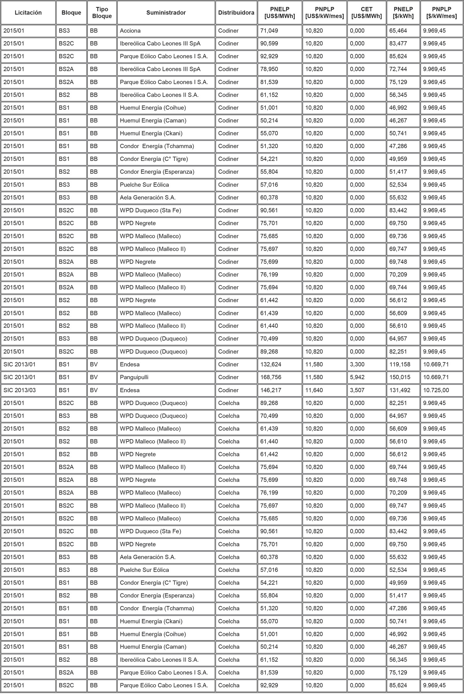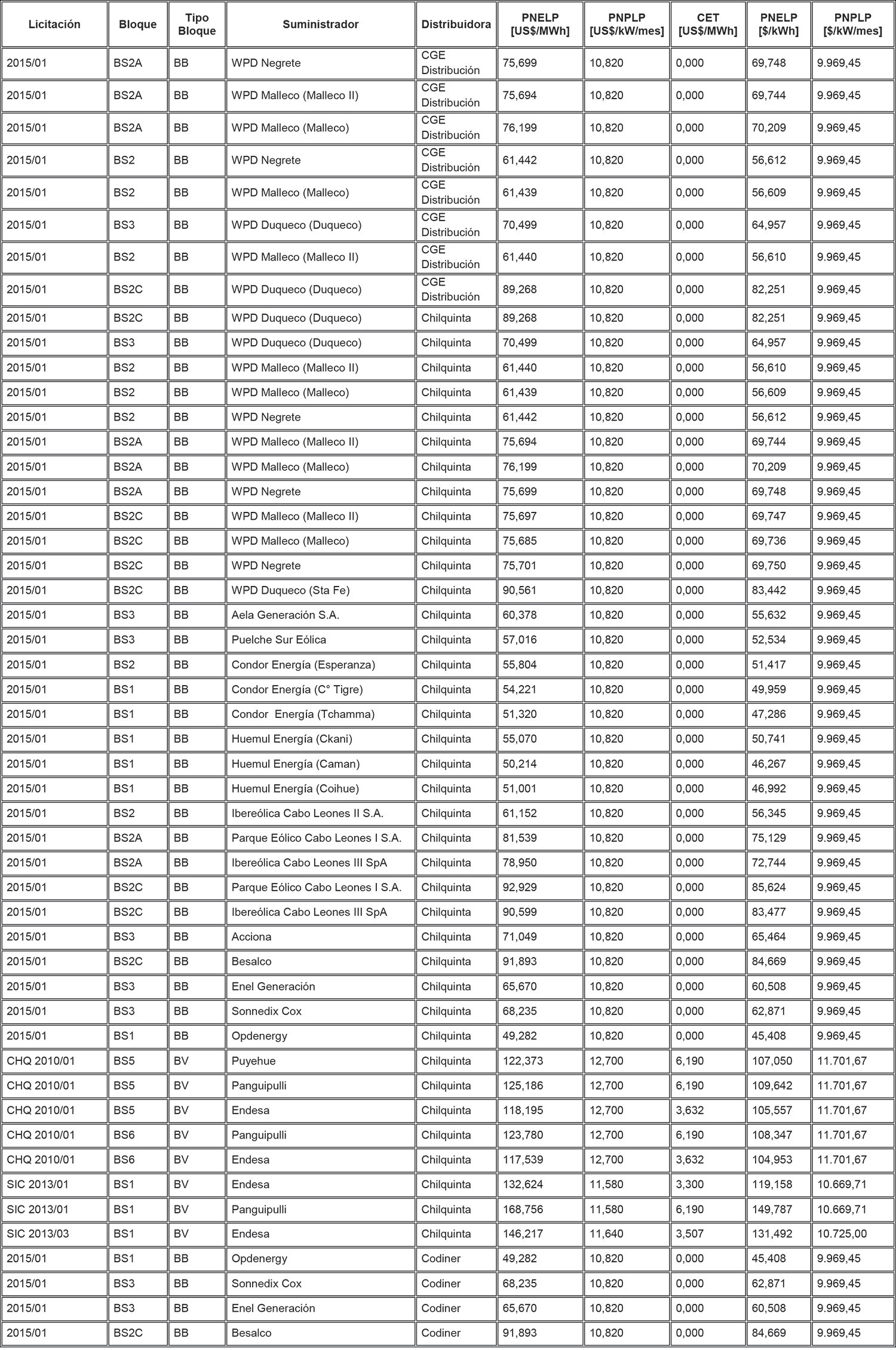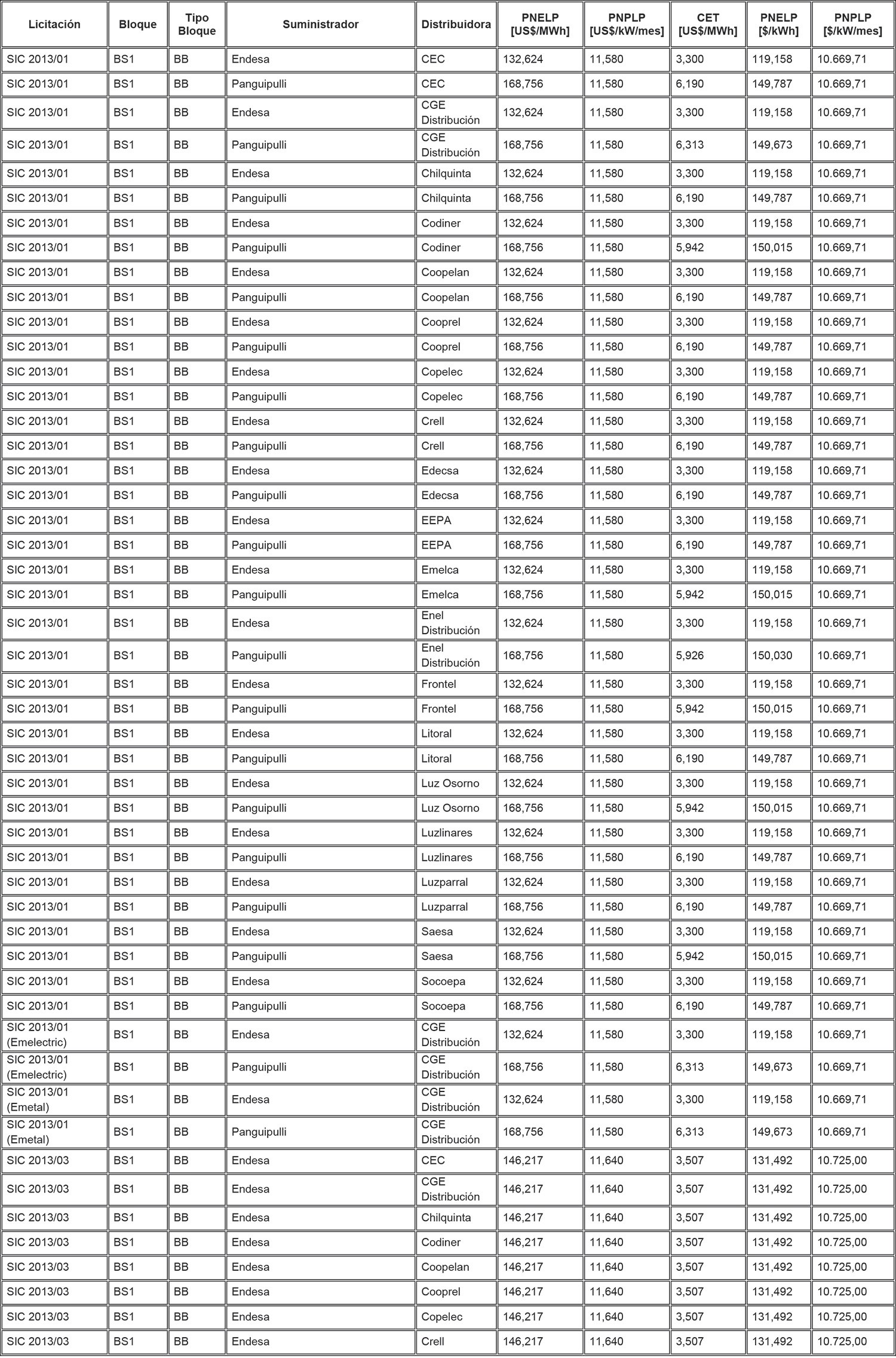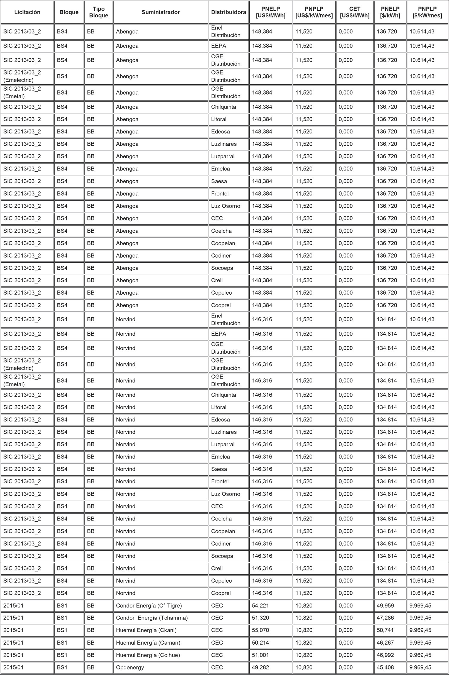 Los Precios de Nudo de Largo Plazo de energía y potencia, de acuerdo con lo señalado en los artículos 6° y 11° de la resolución exenta N° 703, y los descuentos del monto del Cargo Equivalente de Transmisión Final ("CET") en el precio total de energía de los contratos modificados de acuerdo a lo señalado en el artículo vigesimoquinto transitorio, letra E. número i., de la ley N° 20.936 y en la resolución exenta N° 7, son los que se indican en la siguiente tabla: