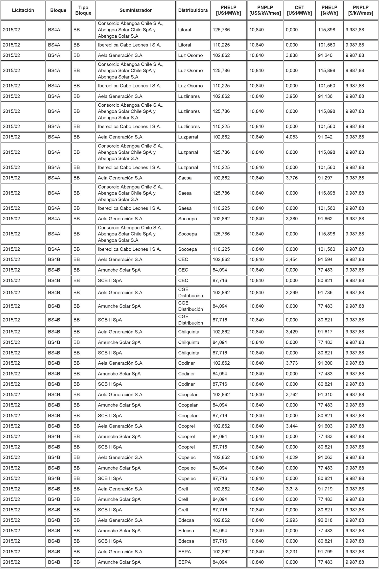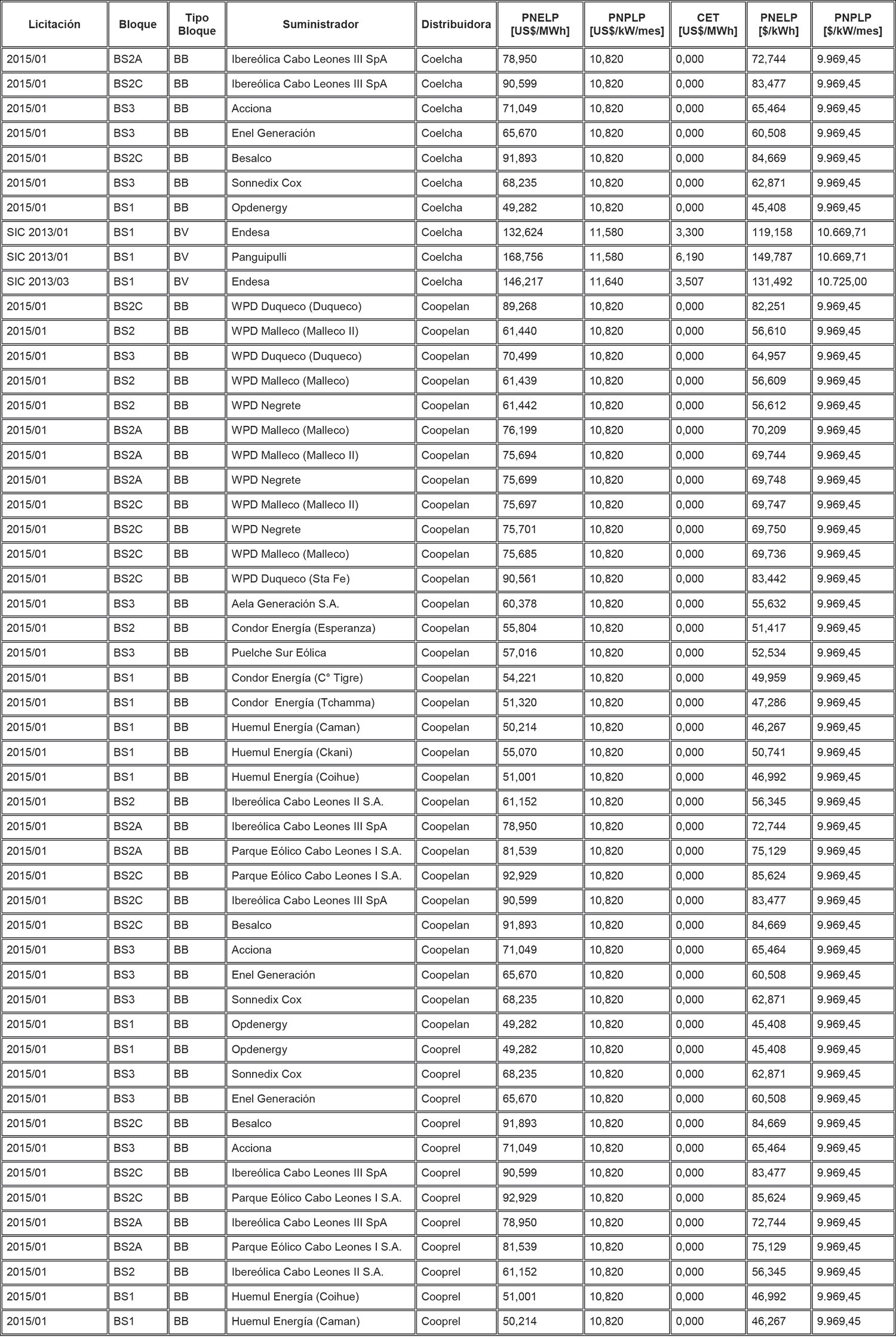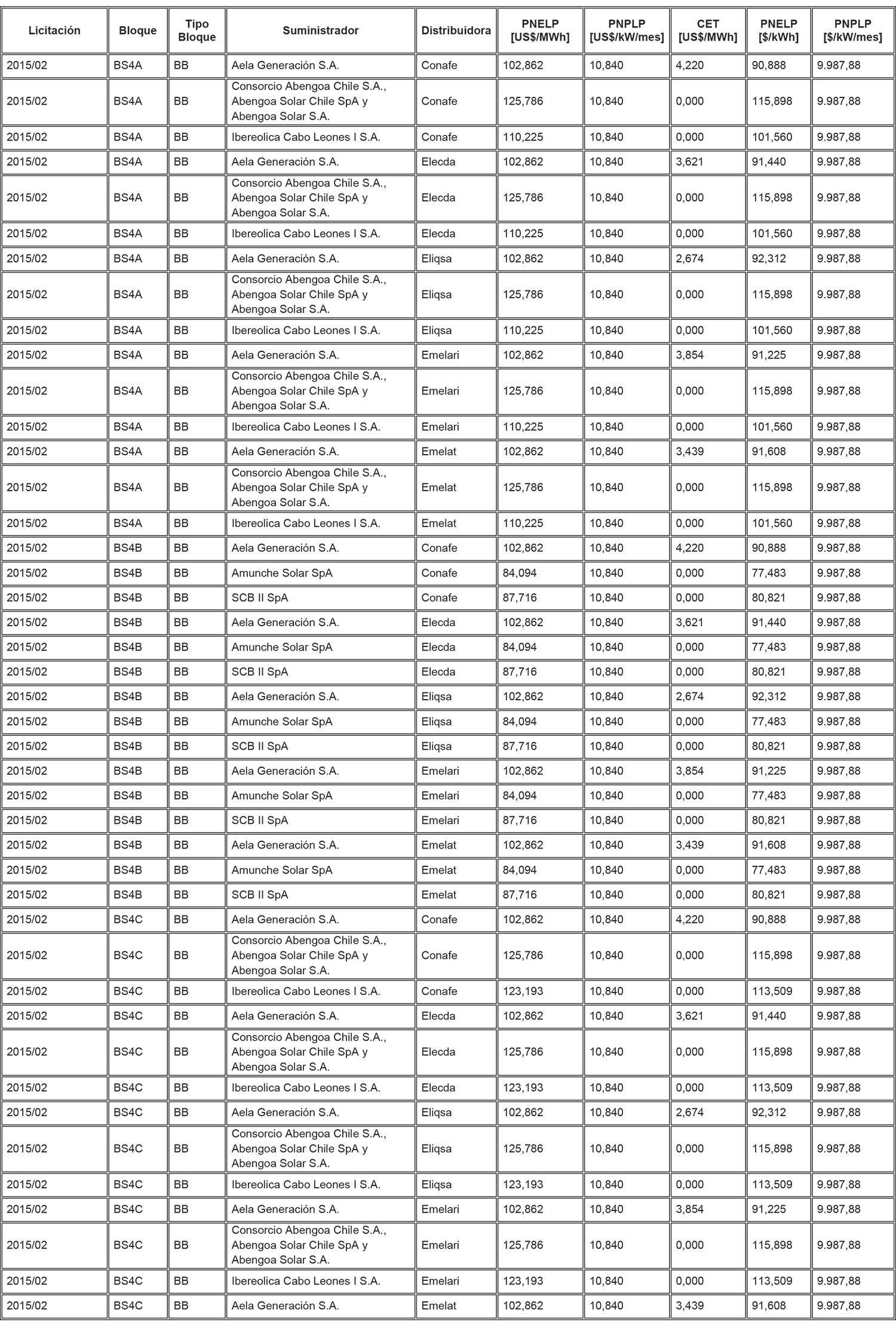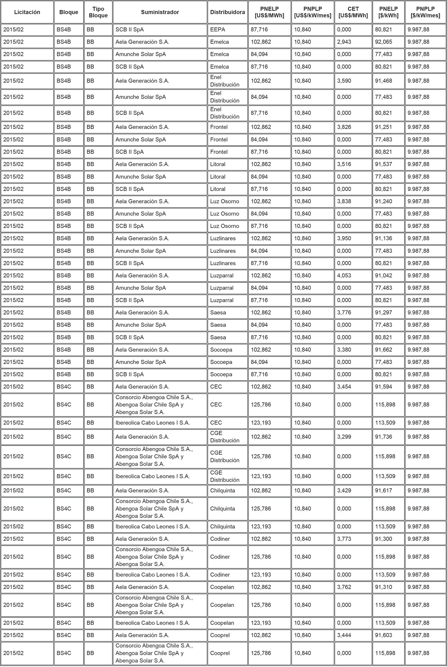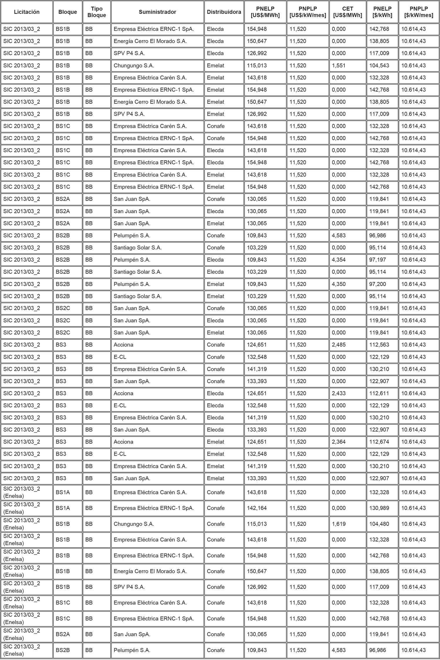 Los Precios de Nudo de Largo Plazo de energía y potencia, de acuerdo con lo señalado en los artículos 6° y 11° de la resolución exenta N° 703, y los descuentos del monto del Cargo Equivalente de Transmisión Final ("CET") en el precio total de energía de los contratos modificados de acuerdo a lo señalado en el artículo vigesimoquinto transitorio, letra E. número i., de la ley N° 20.936 y en la resolución exenta N° 7, son los que se indican en la siguiente tabla: