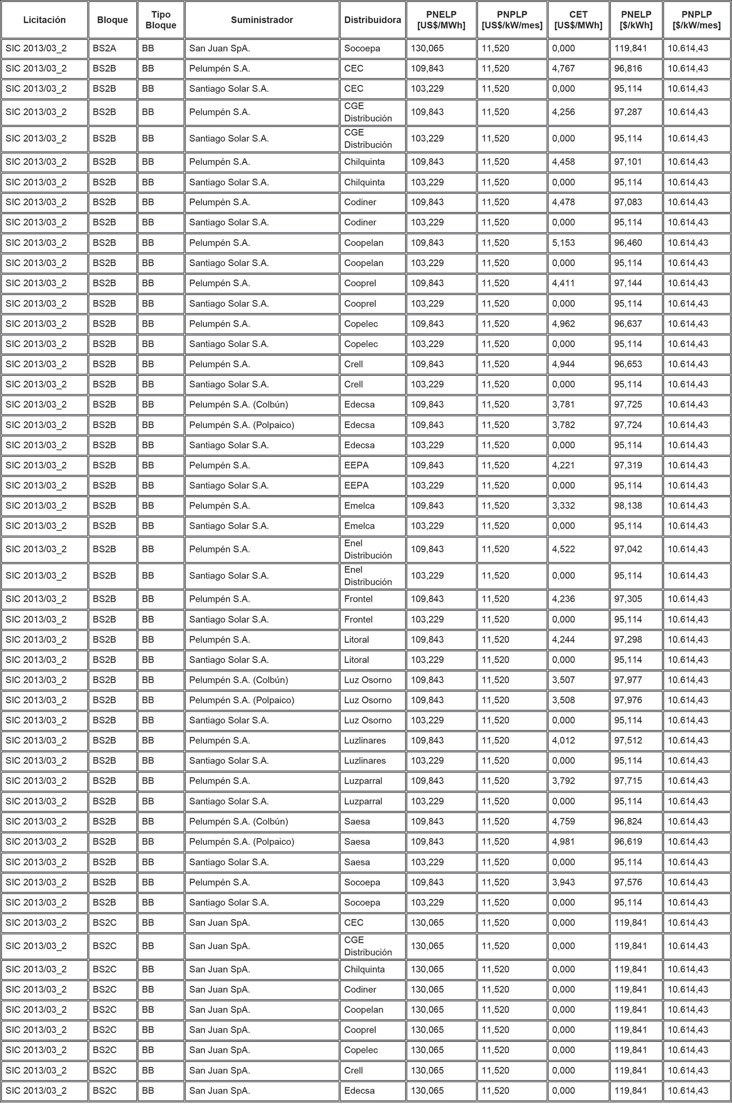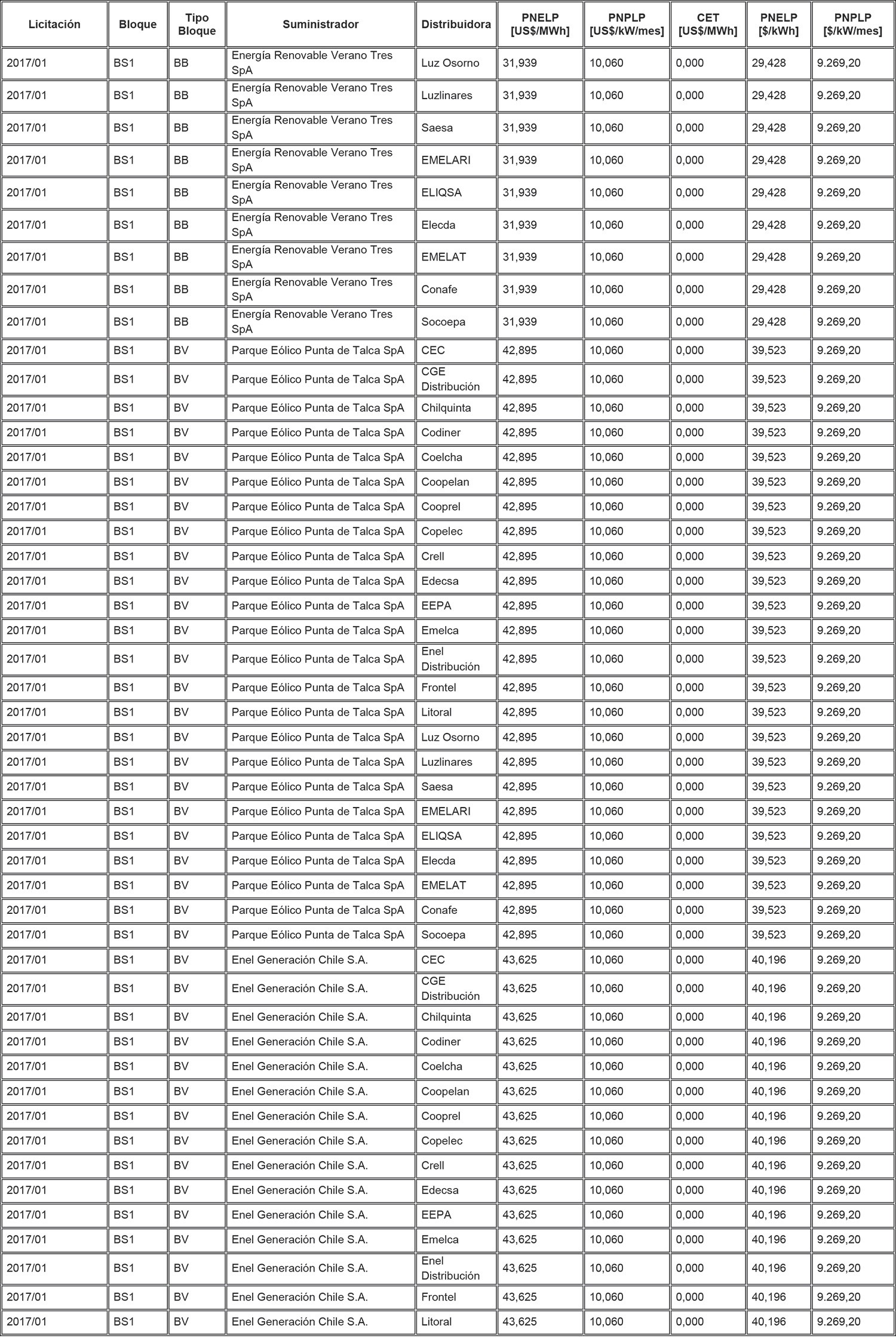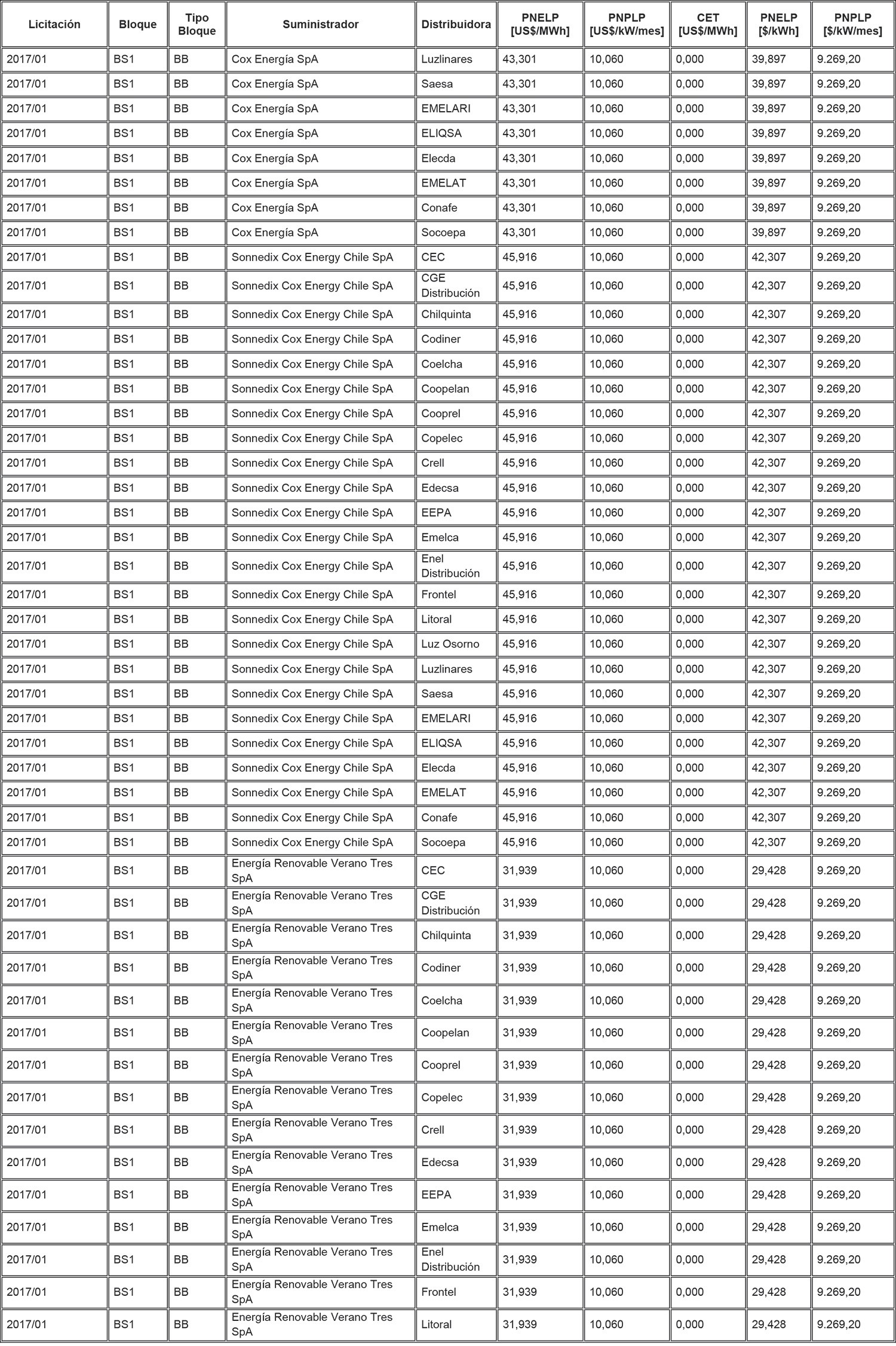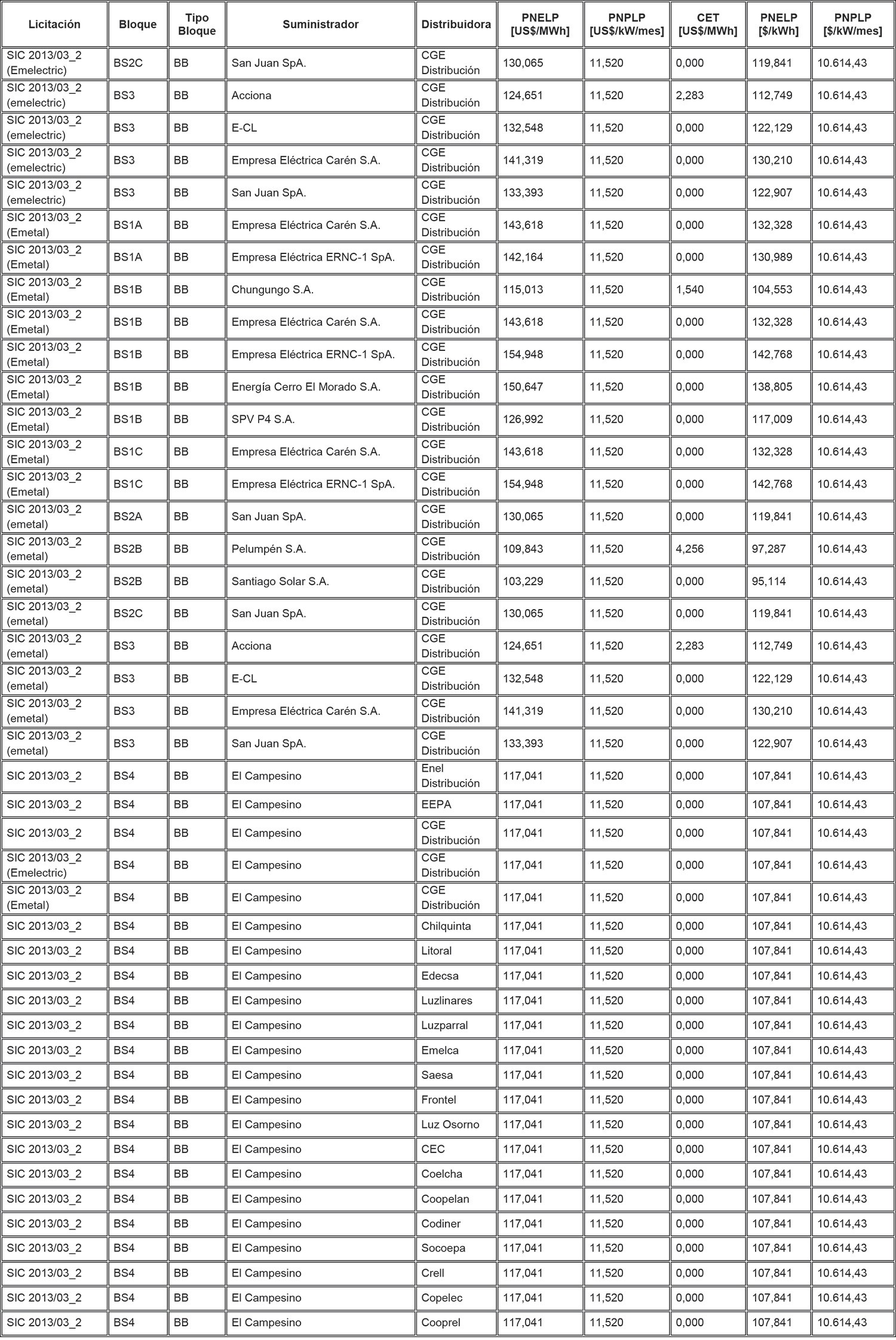 Los Precios de Nudo de Largo Plazo de energía y potencia, de acuerdo con lo señalado en los artículos 6° y 11° de la resolución exenta N° 703, y los descuentos del monto del Cargo Equivalente de Transmisión Final ("CET") en el precio total de energía de los contratos modificados de acuerdo a lo señalado en el artículo vigesimoquinto transitorio, letra E. número i., de la ley N° 20.936 y en la resolución exenta N° 7, son los que se indican en la siguiente tabla: