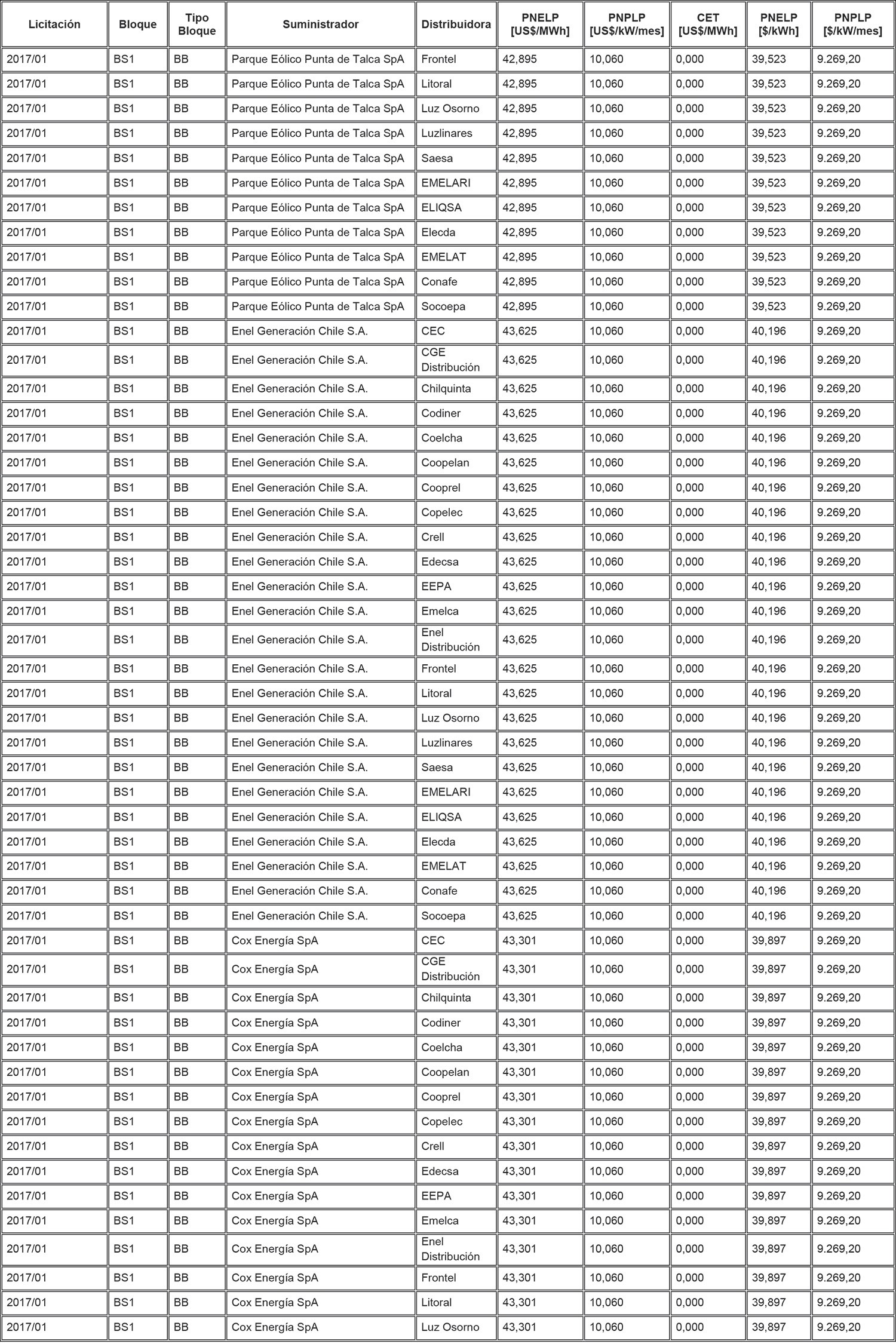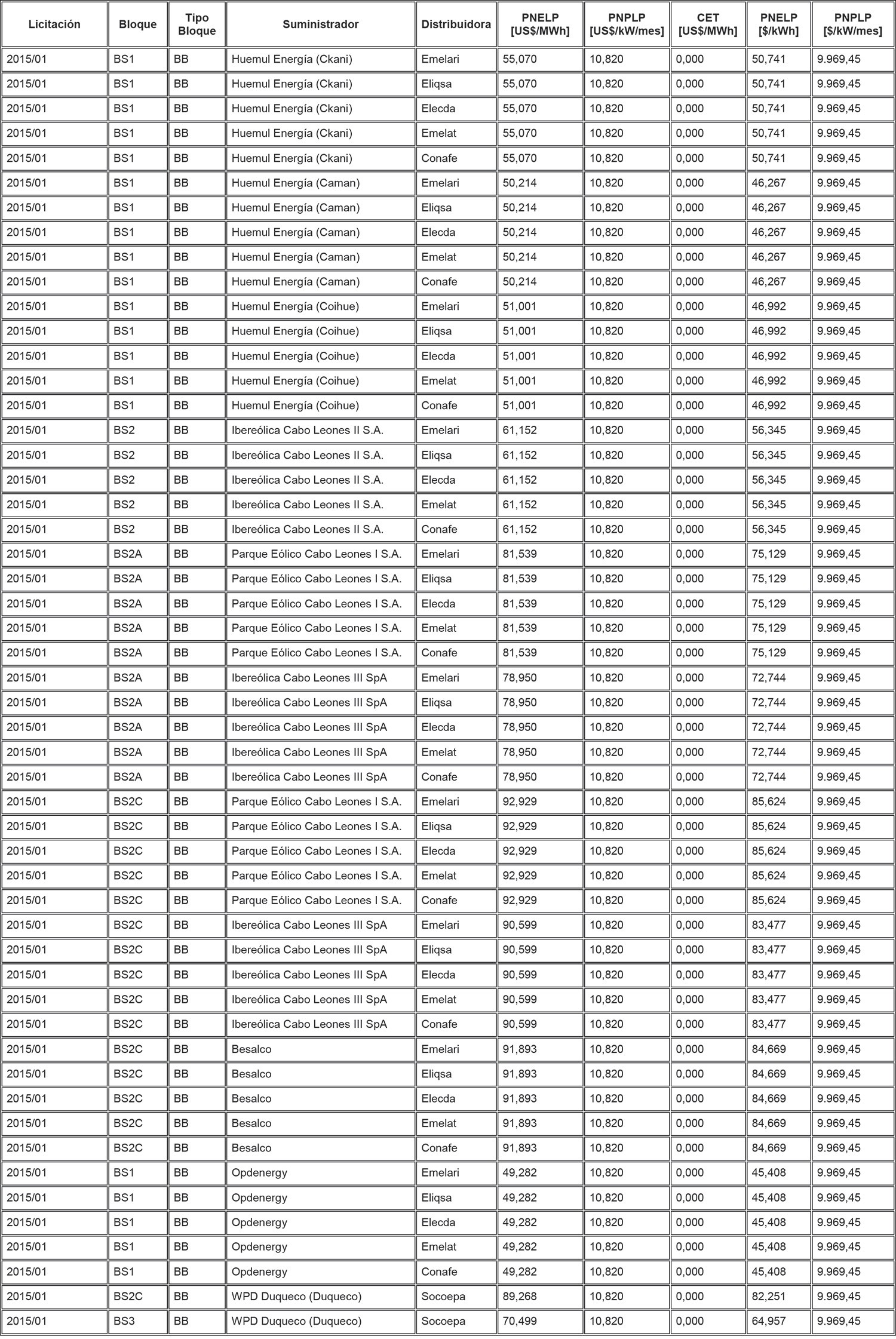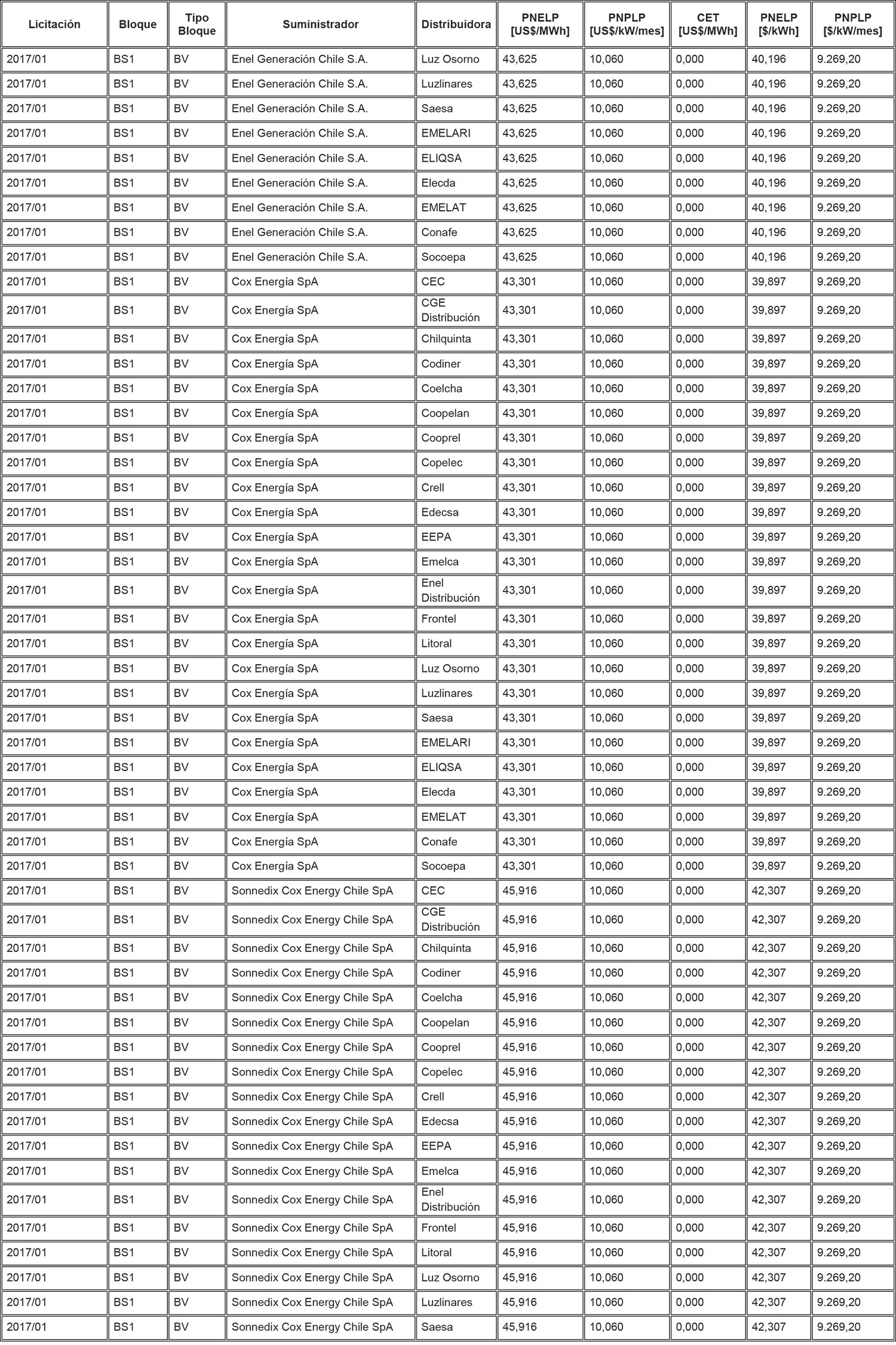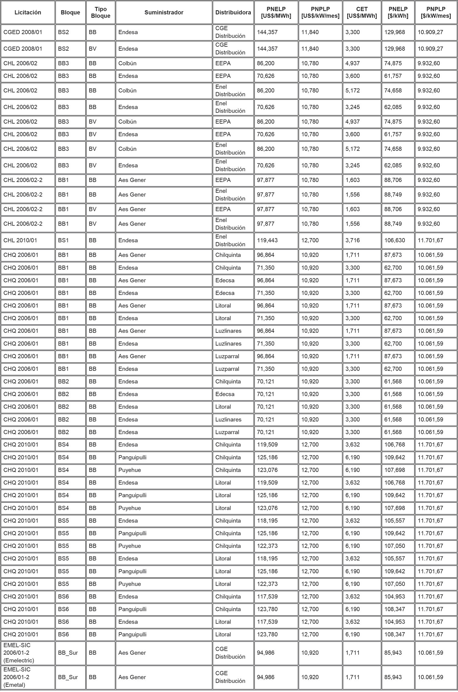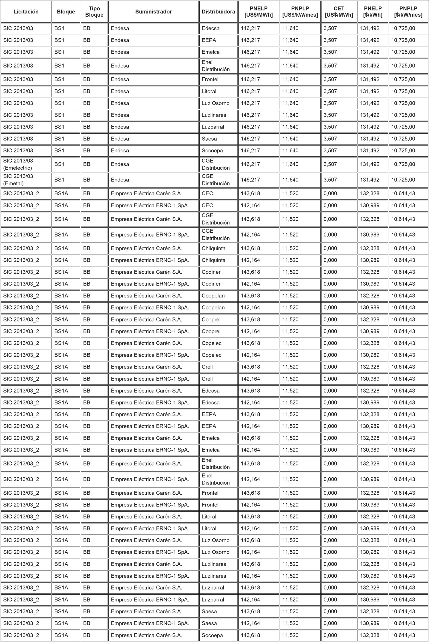 Los Precios de Nudo de Largo Plazo de energía y potencia, de acuerdo con lo señalado en los artículos 6° y 11° de la resolución exenta N° 703, y los descuentos del monto del Cargo Equivalente de Transmisión Final ("CET") en el precio total de energía de los contratos modificados de acuerdo a lo señalado en el artículo vigesimoquinto transitorio, letra E. número i., de la ley N° 20.936 y en la resolución exenta N° 7, son los que se indican en la siguiente tabla: