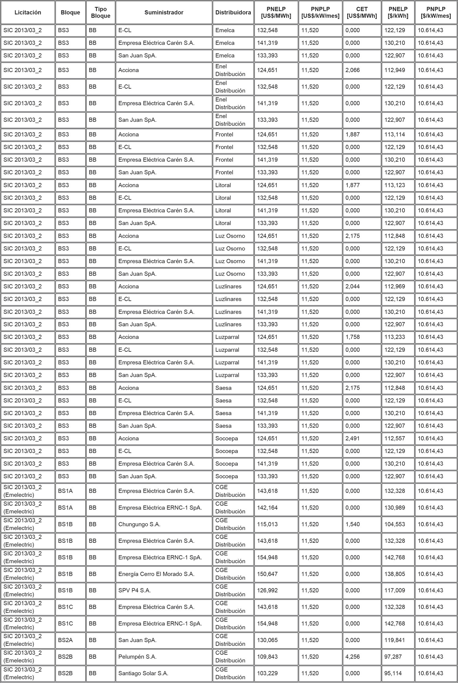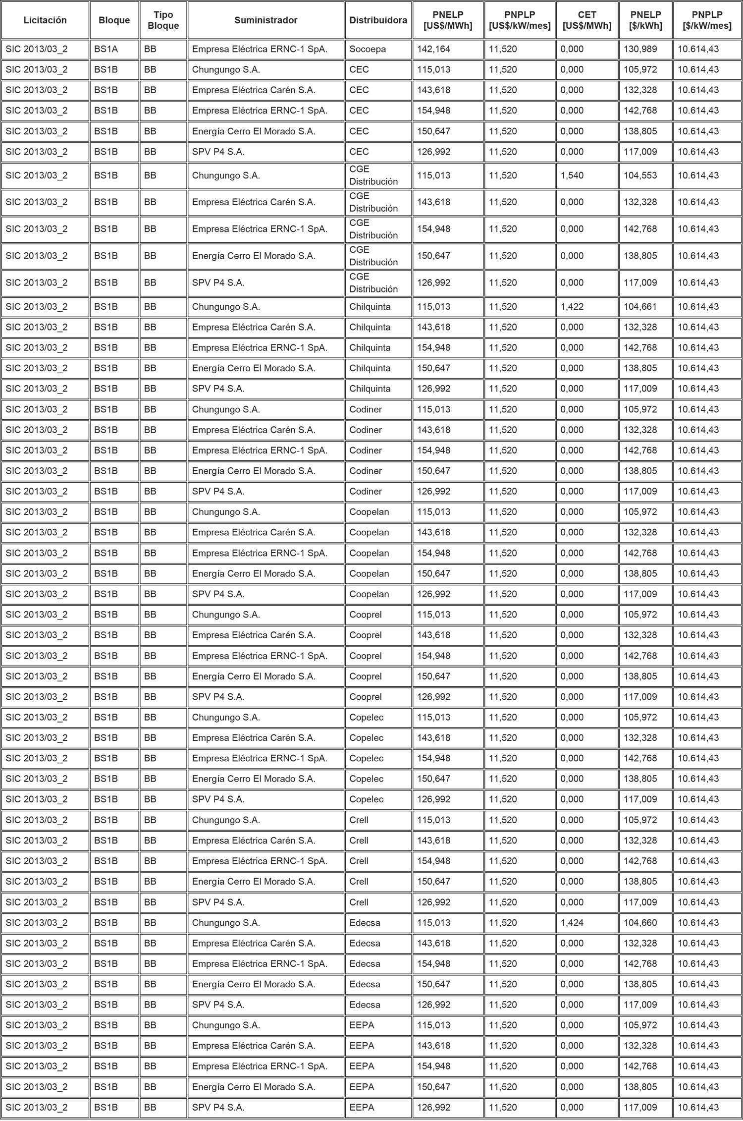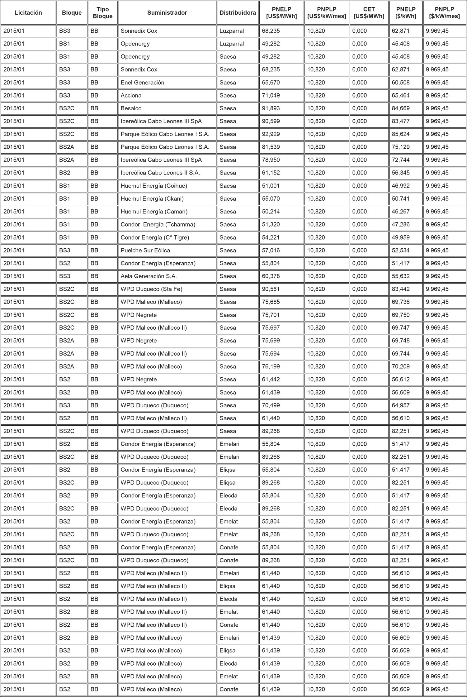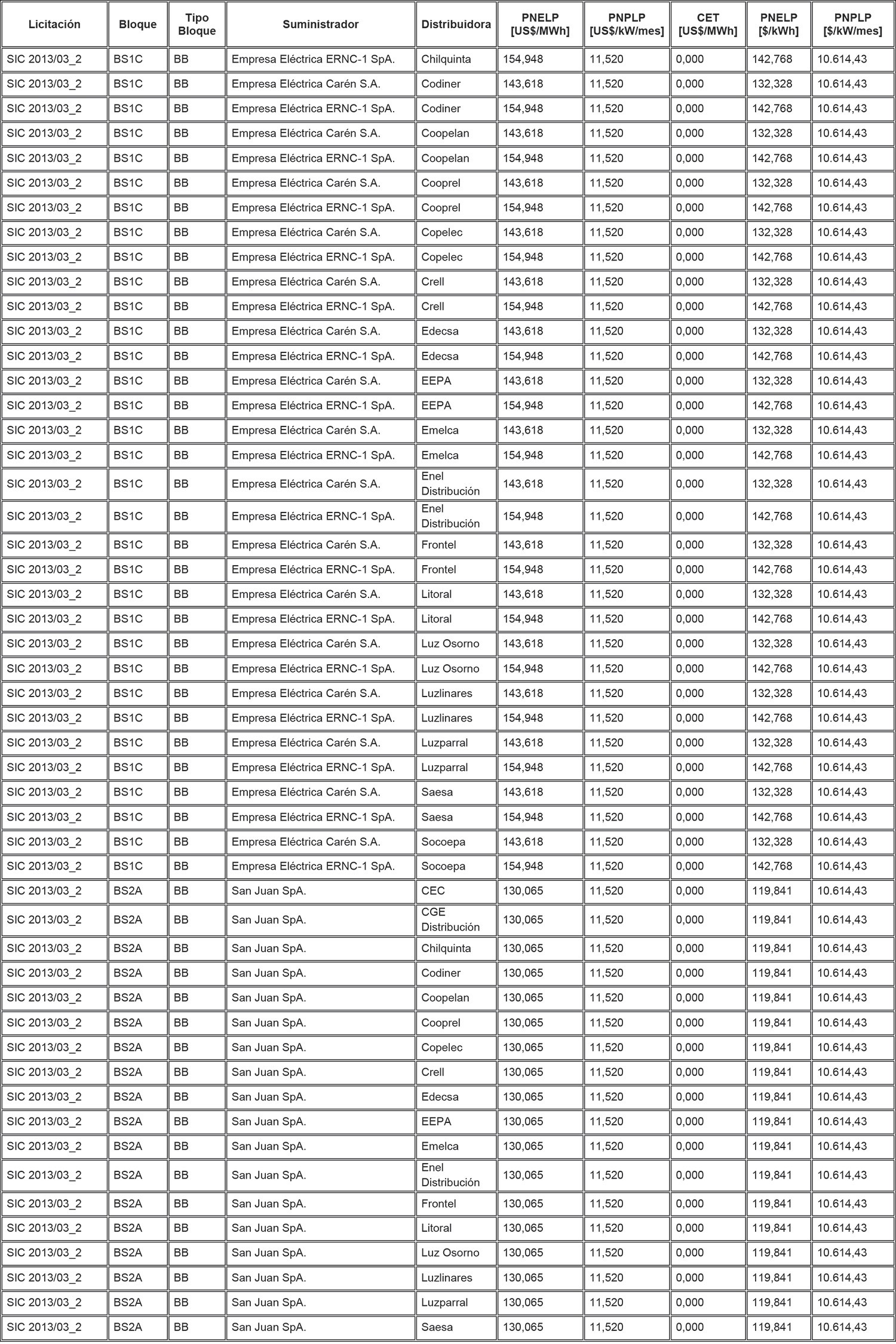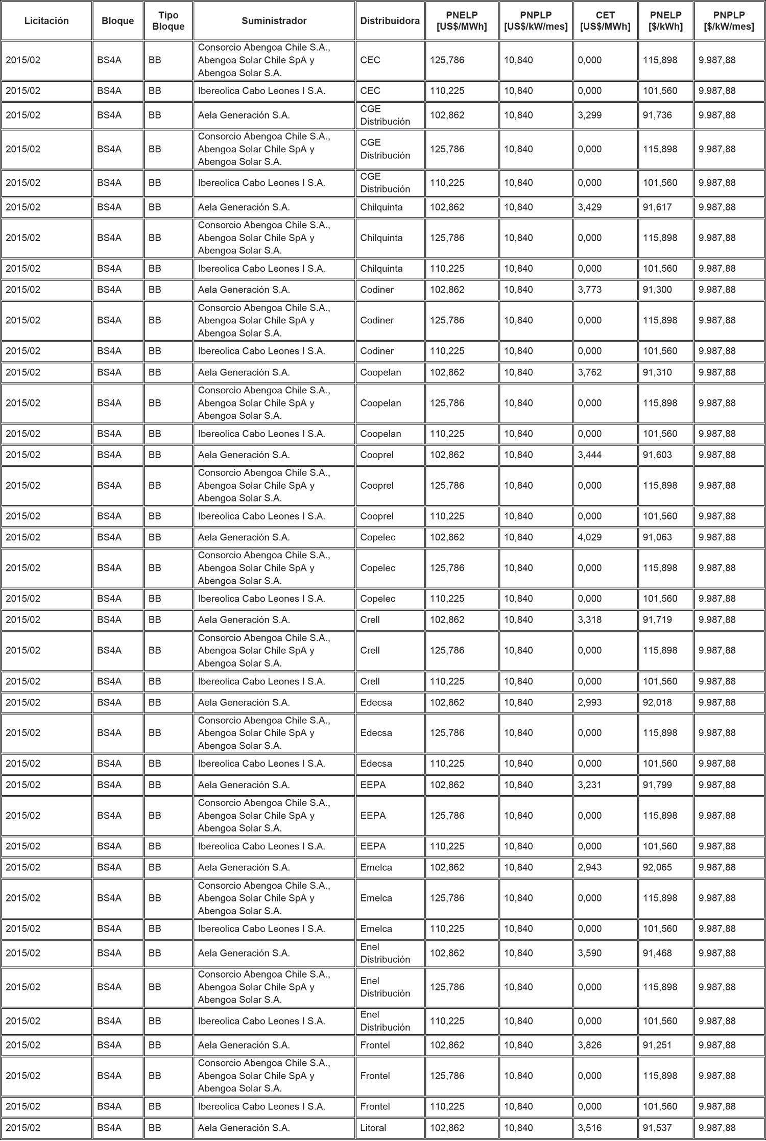 Los Precios de Nudo de Largo Plazo de energía y potencia, de acuerdo con lo señalado en los artículos 6° y 11° de la resolución exenta N° 703, y los descuentos del monto del Cargo Equivalente de Transmisión Final ("CET") en el precio total de energía de los contratos modificados de acuerdo a lo señalado en el artículo vigesimoquinto transitorio, letra E. número i., de la ley N° 20.936 y en la resolución exenta N° 7, son los que se indican en la siguiente tabla: