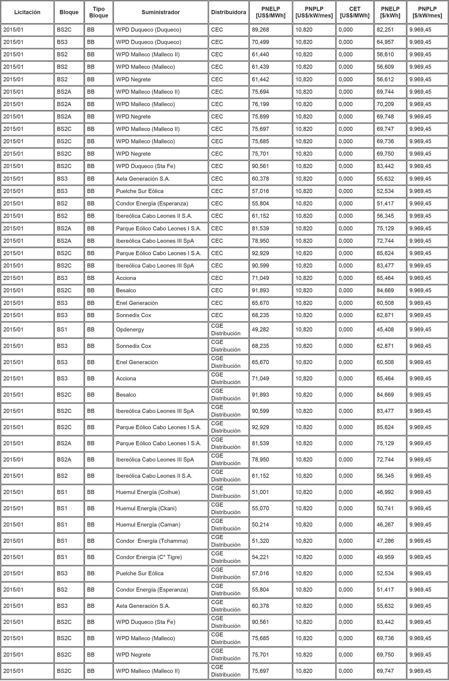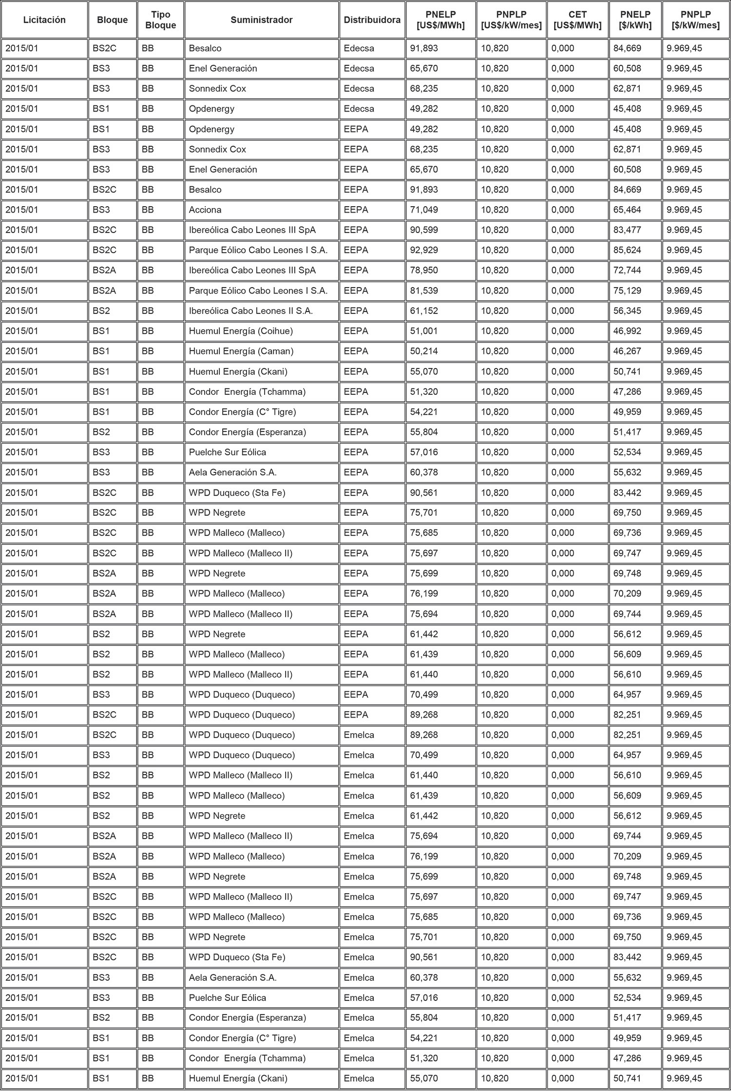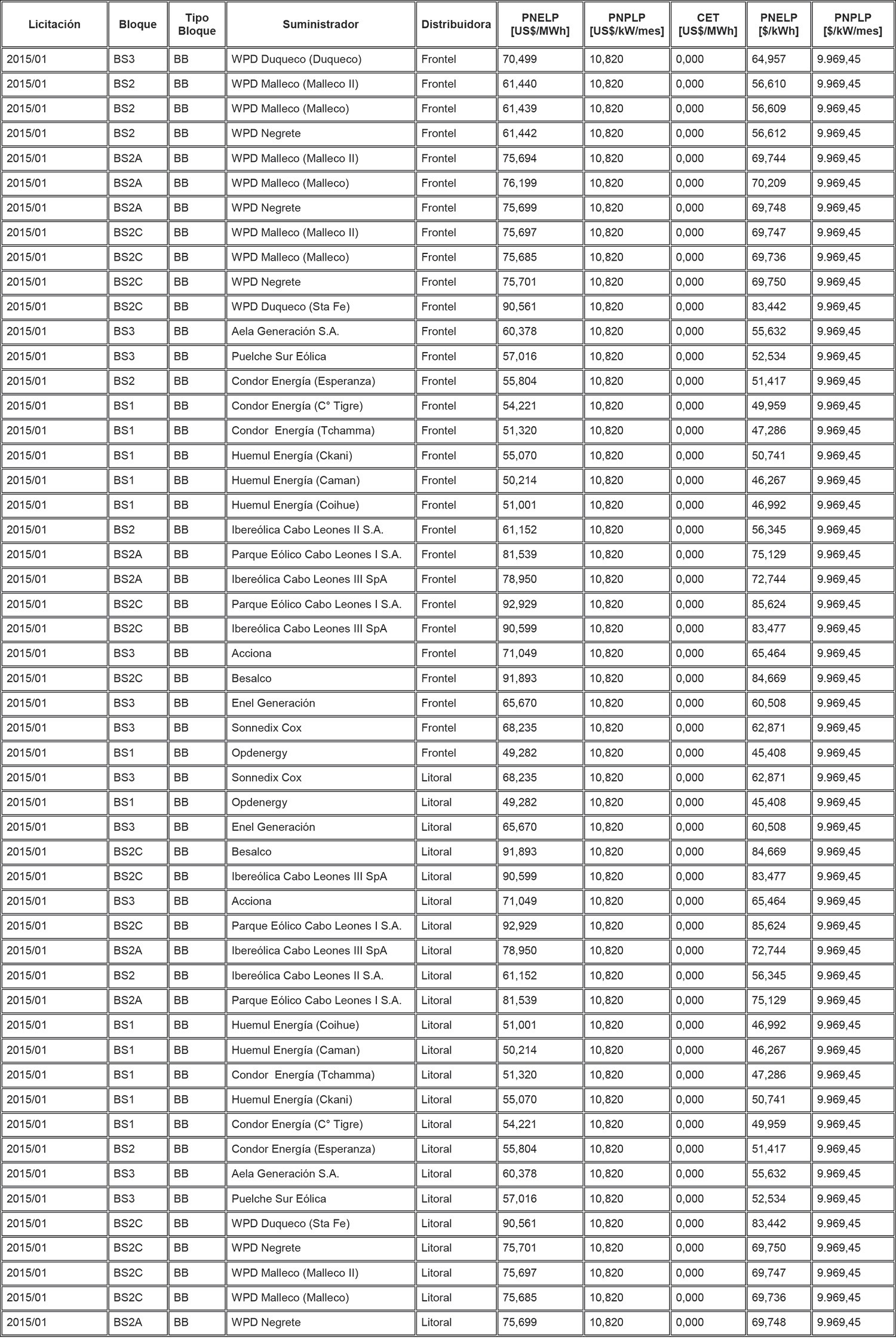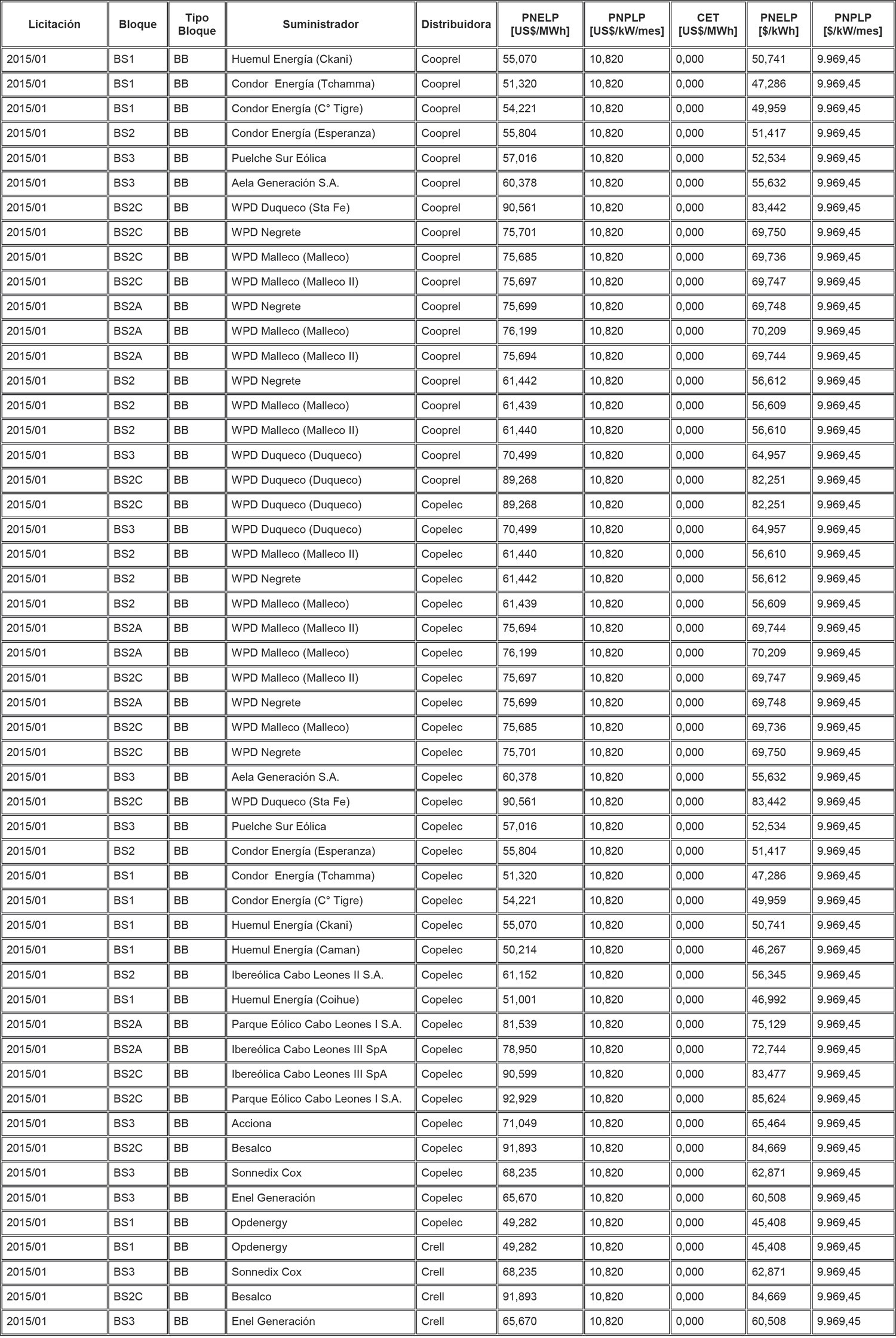 Los Precios de Nudo de Largo Plazo de energía y potencia, de acuerdo con lo señalado en los artículos 6° y 11° de la resolución exenta N° 703, y los descuentos del monto del Cargo Equivalente de Transmisión Final ("CET") en el precio total de energía de los contratos modificados de acuerdo a lo señalado en el artículo vigesimoquinto transitorio, letra E. número i., de la ley N° 20.936 y en la resolución exenta N° 7, son los que se indican en la siguiente tabla: