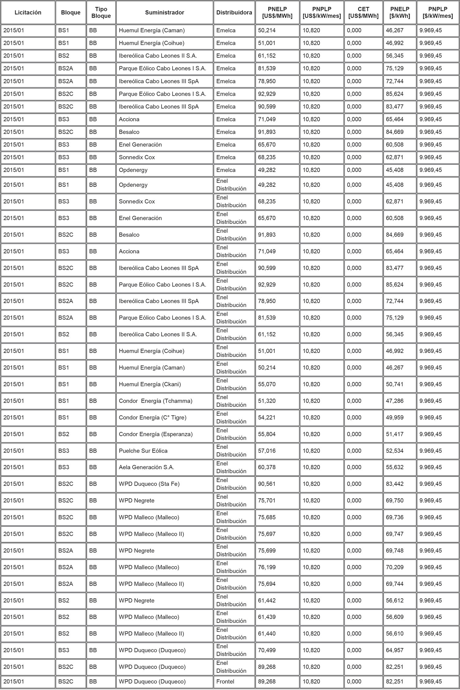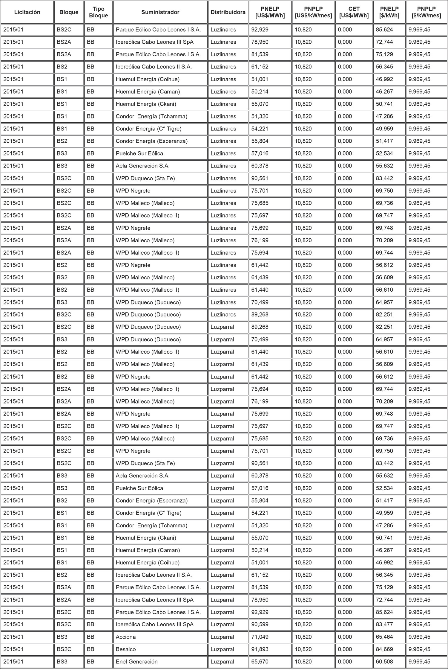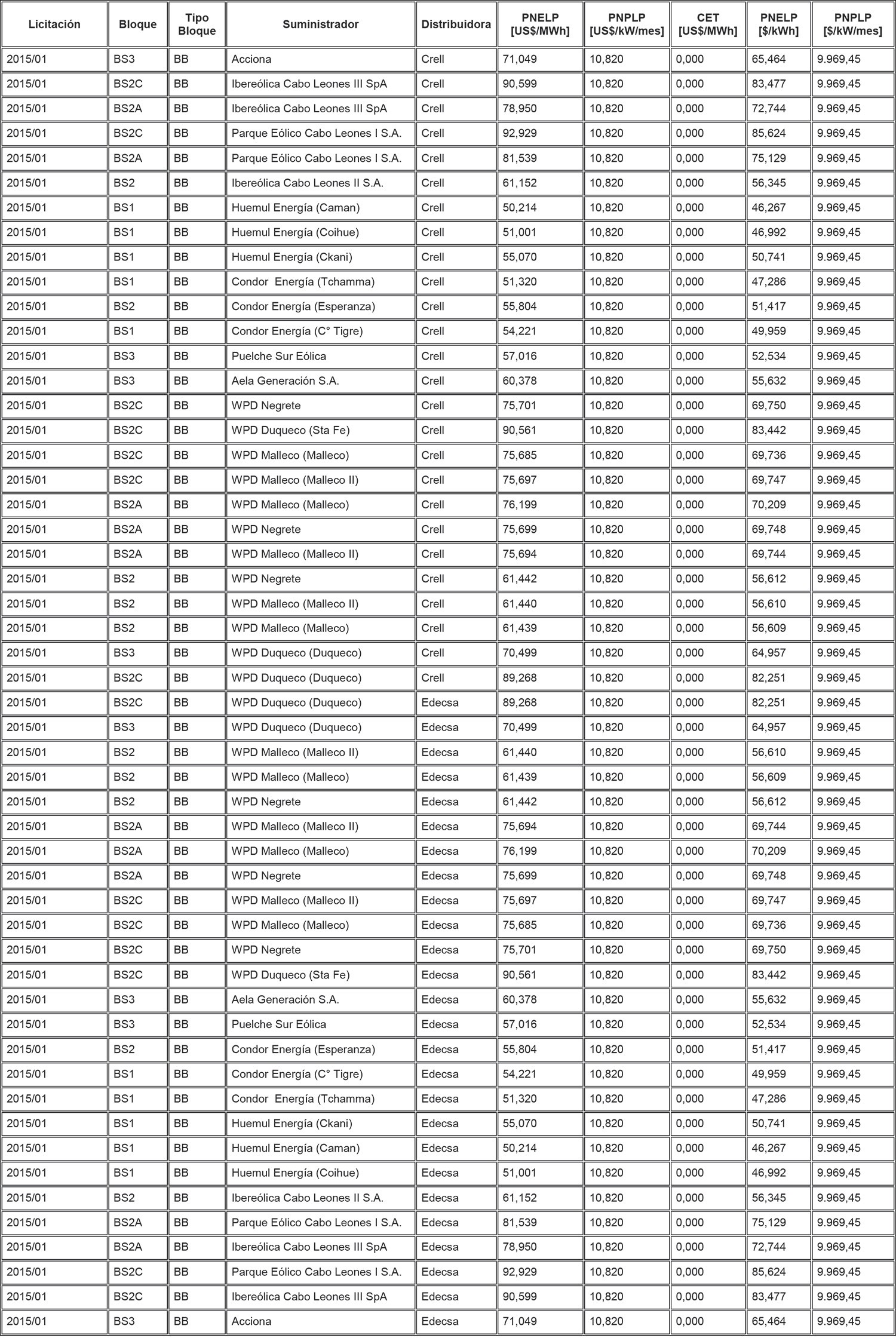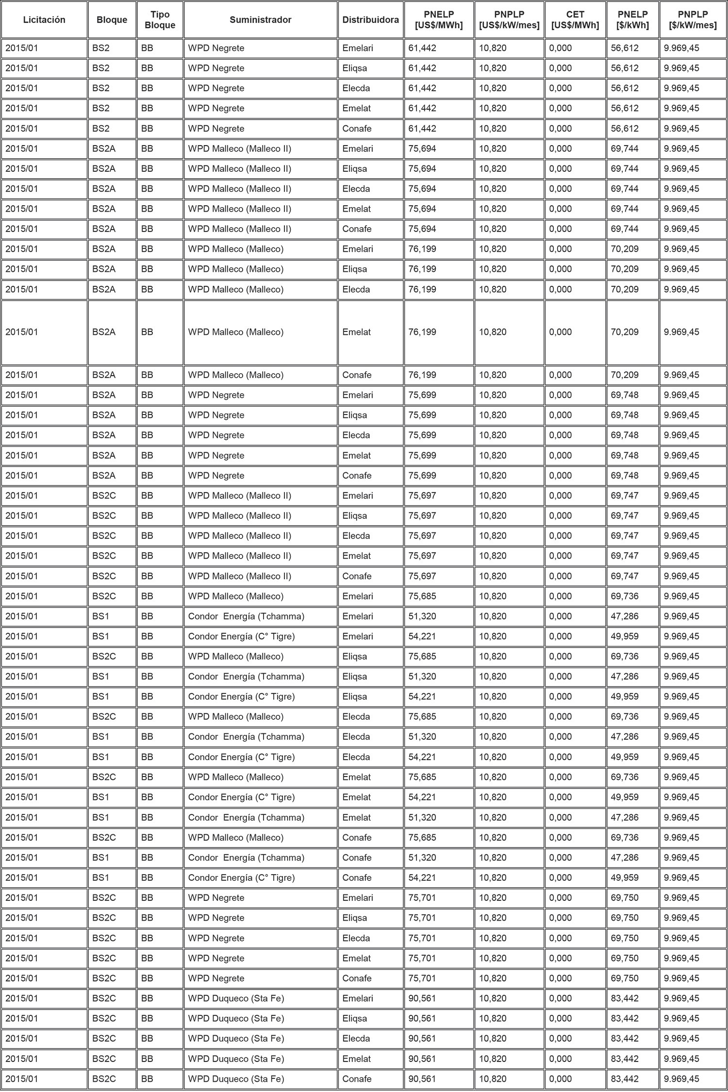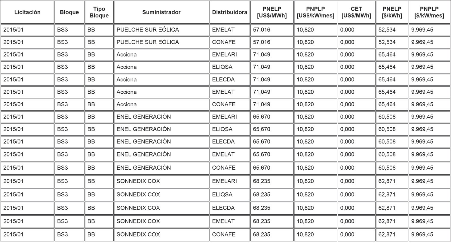Los Precios de Nudo de Largo Plazo de energía y potencia, de acuerdo con lo señalado en los artículos 6° y 11° de la resolución exenta N° 703, y los descuentos del monto del Cargo Equivalente de Transmisión Final ("CET") en el precio total de energía de los contratos modificados de acuerdo a lo señalado en el artículo vigesimoquinto transitorio, letra E. número i., de la ley N° 20.936 y en la resolución exenta N° 7, son los que se indican en la siguiente tabla: