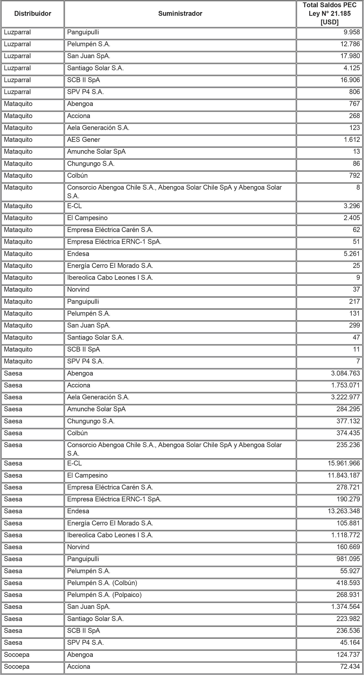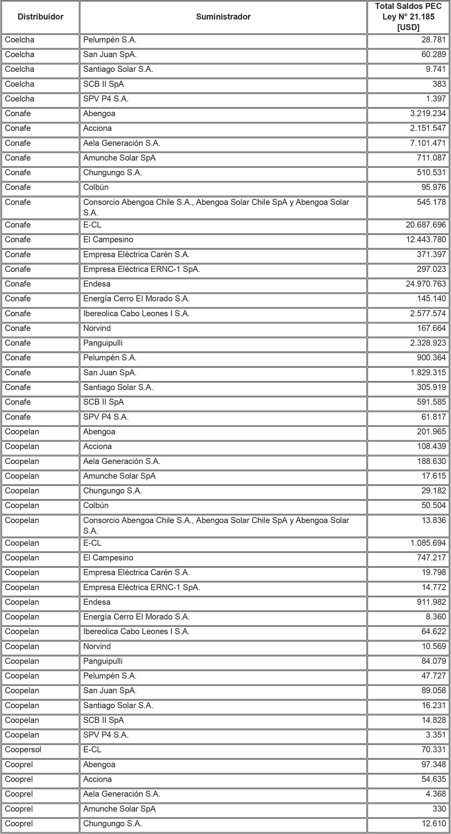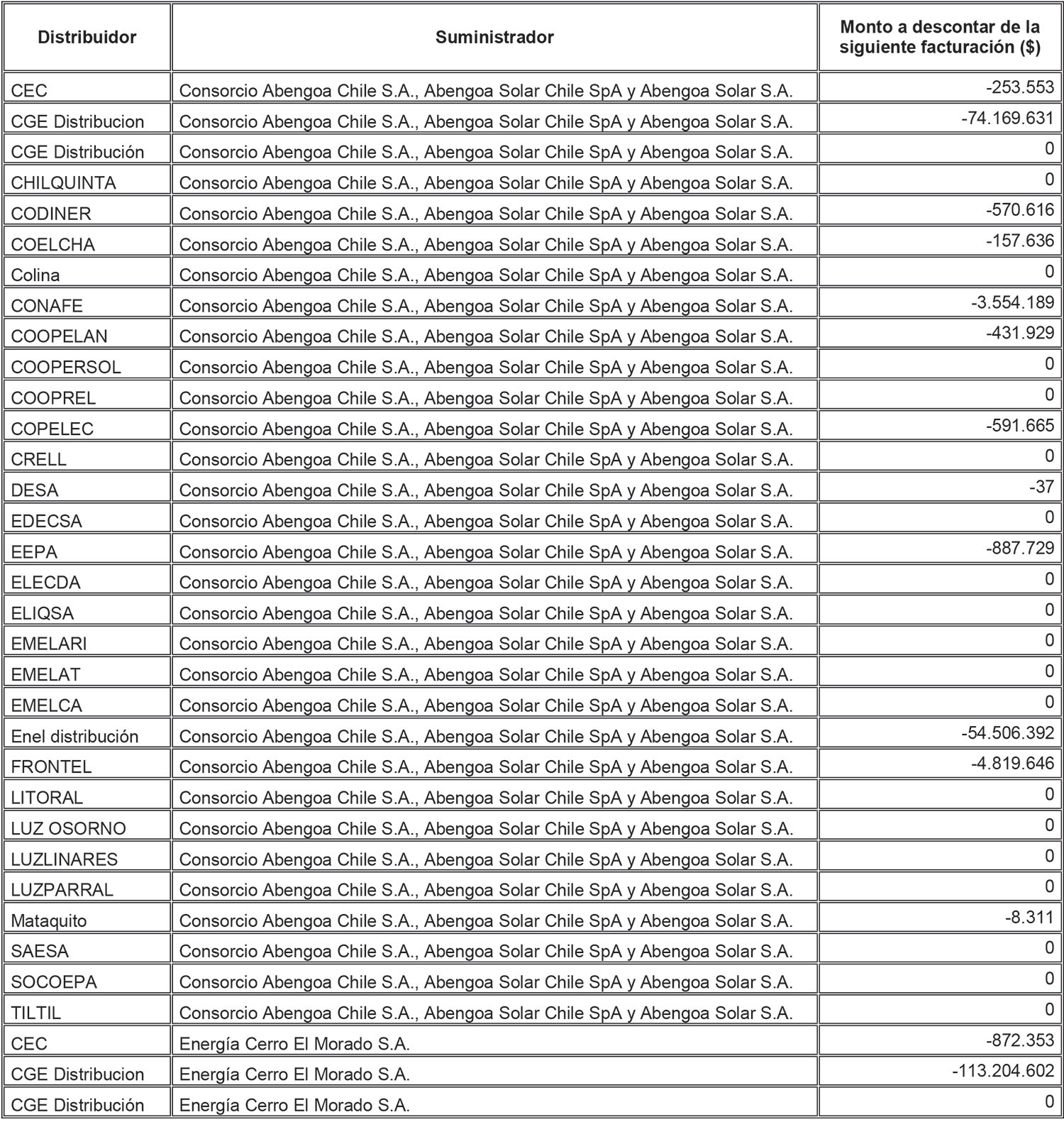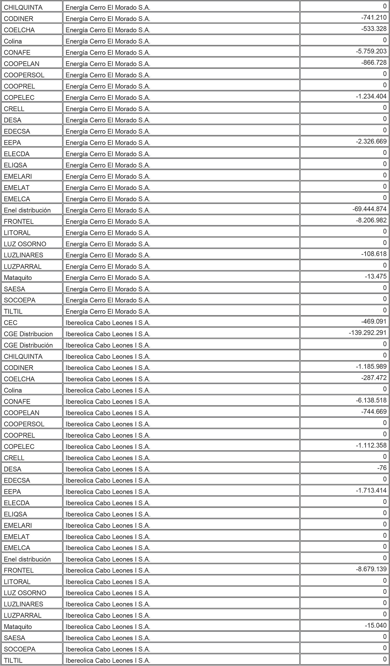 De acuerdo a lo señalado precedentemente, la siguiente tabla contiene los saldos antes mencionados del Sistema Eléctrico Nacional, identificando al suministrador acreedor de dichos saldos y la Distribuidora deudora correspondiente:
