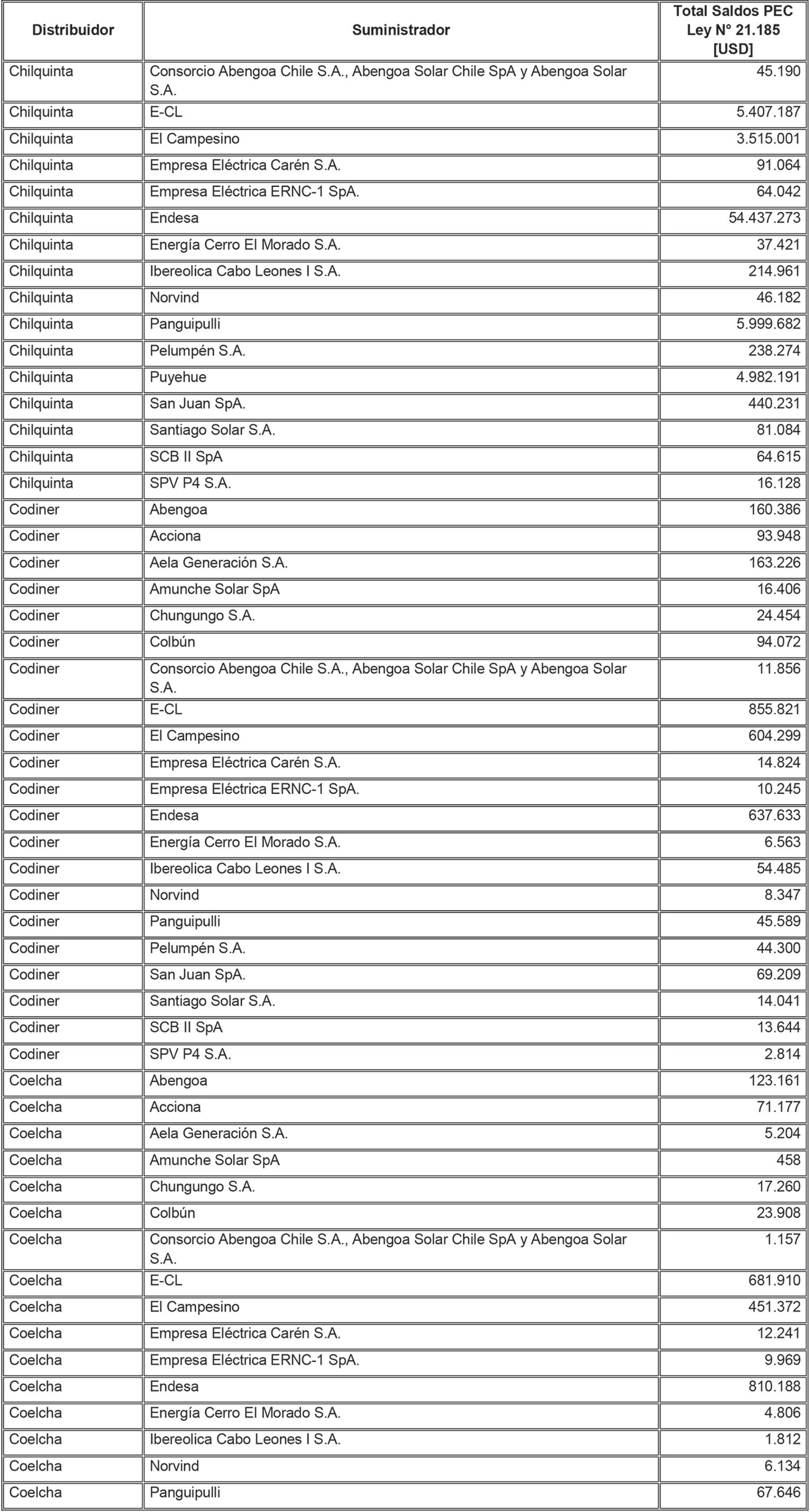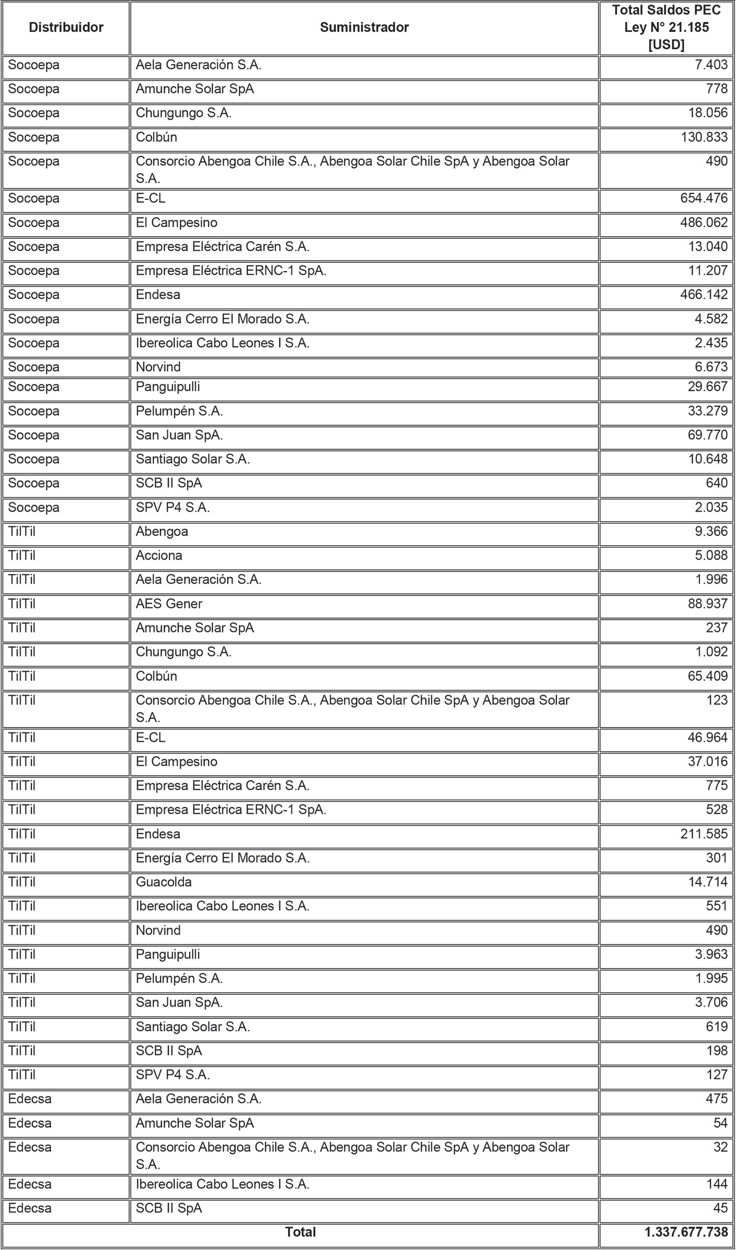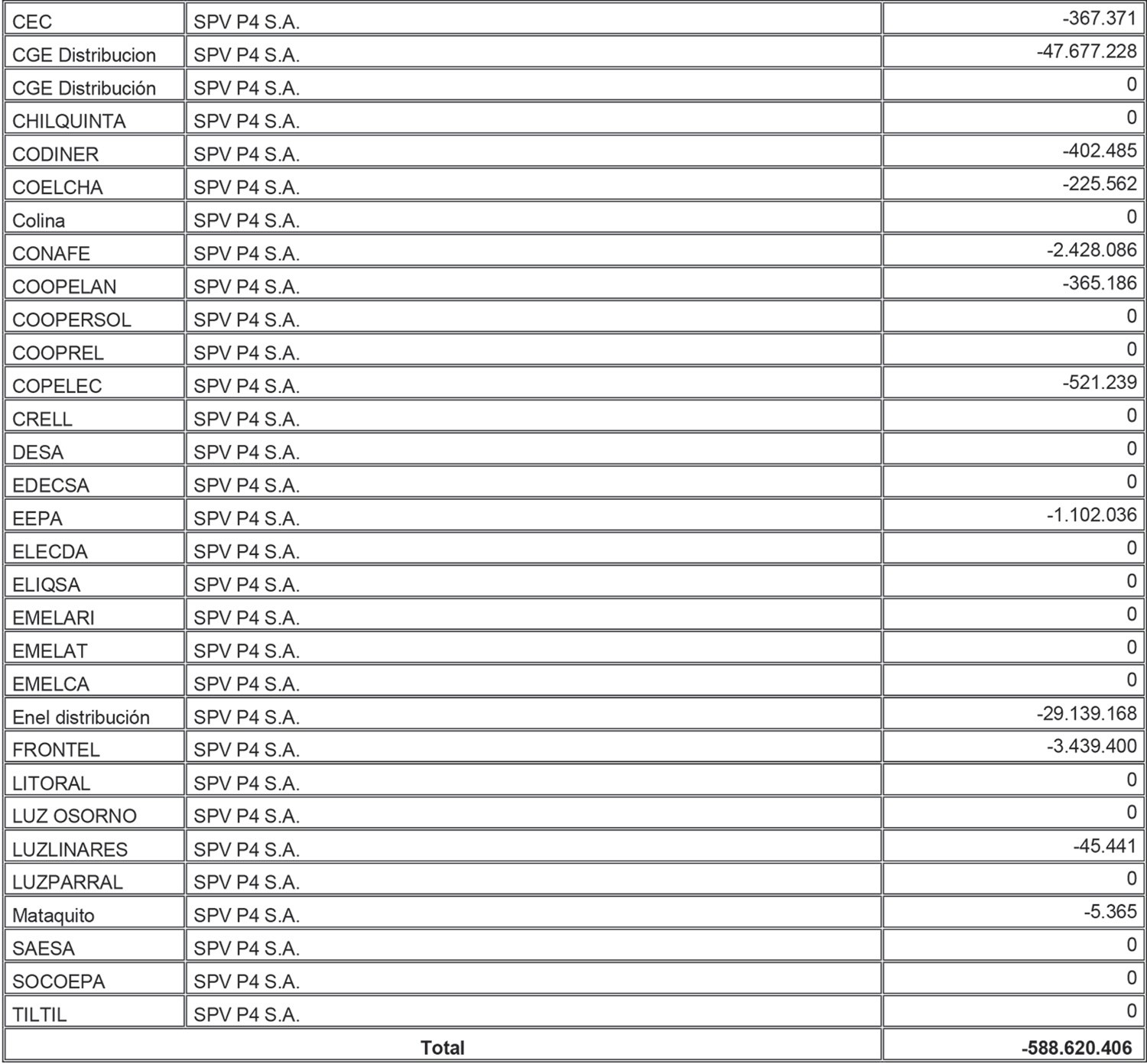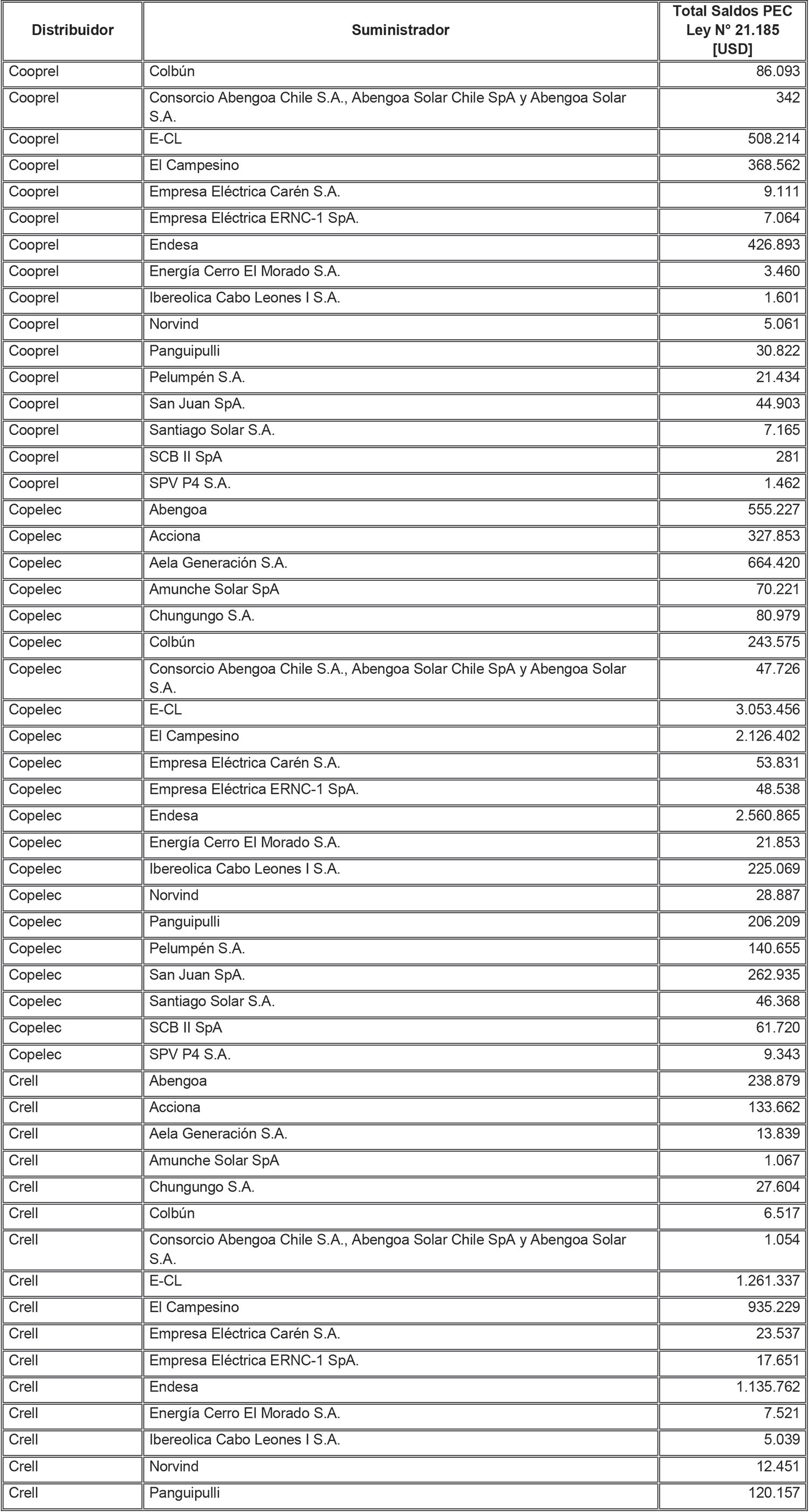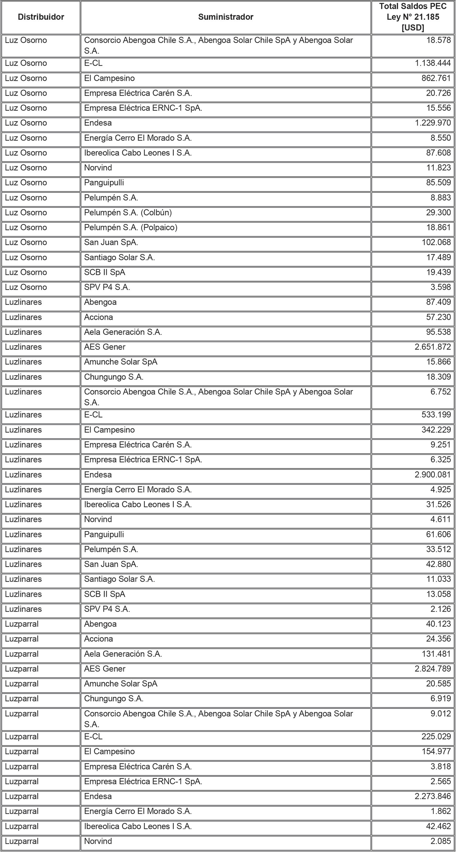 De acuerdo a lo señalado precedentemente, la siguiente tabla contiene los saldos antes mencionados del Sistema Eléctrico Nacional, identificando al suministrador acreedor de dichos saldos y la Distribuidora deudora correspondiente: