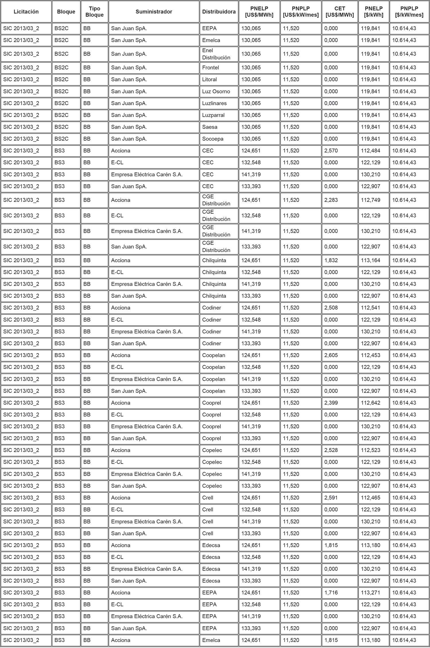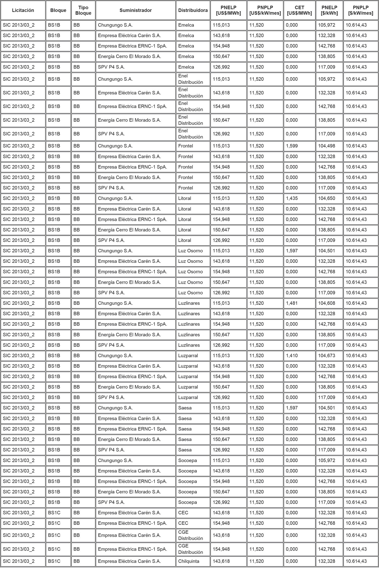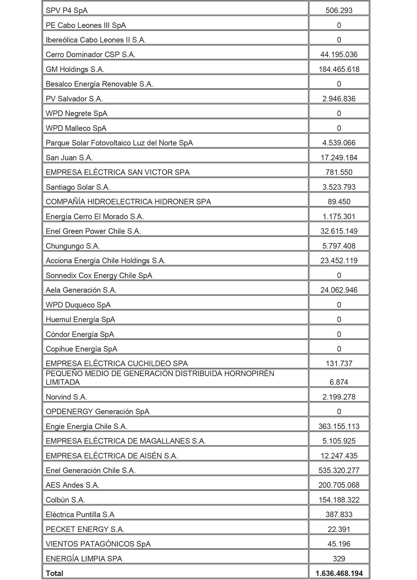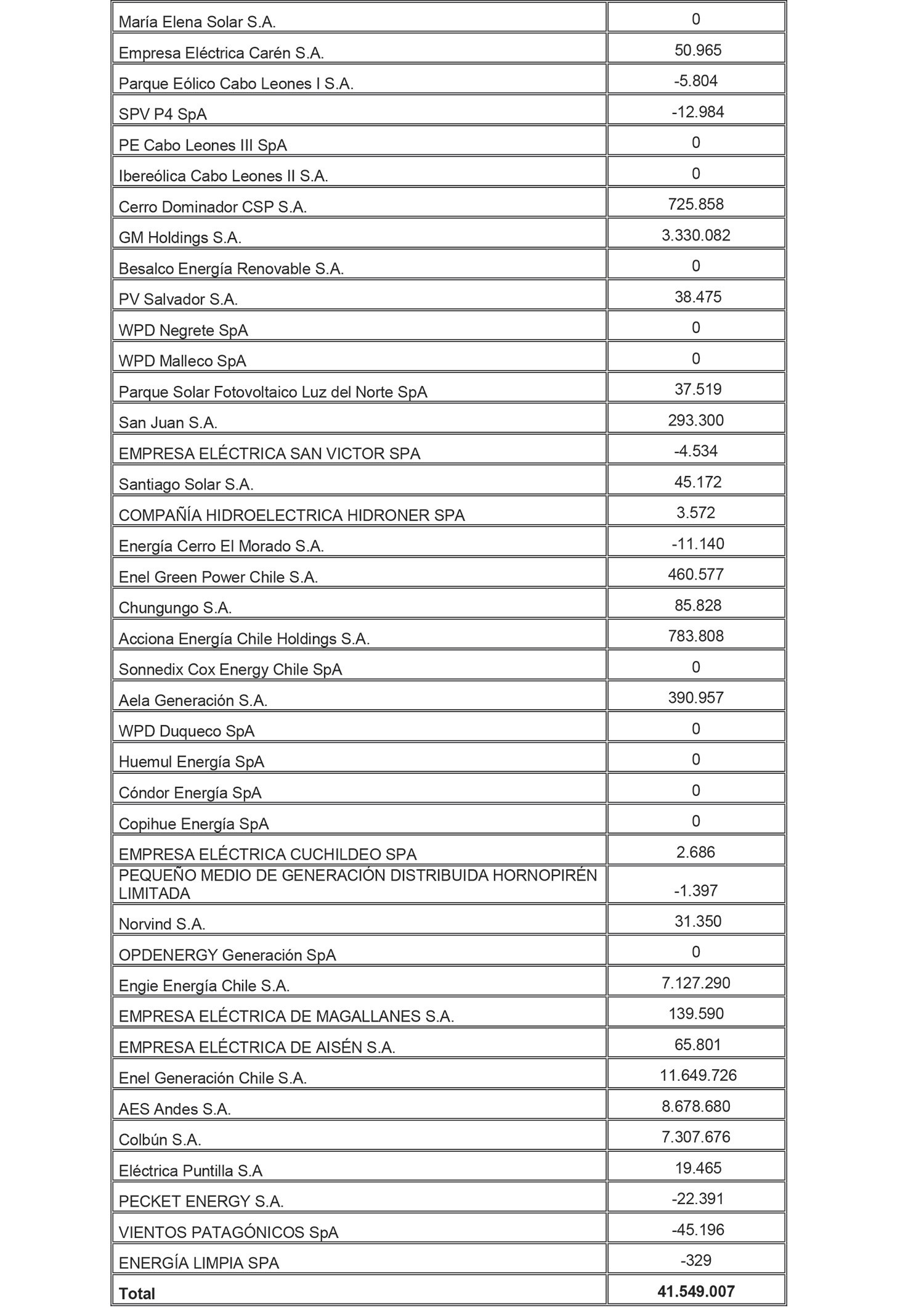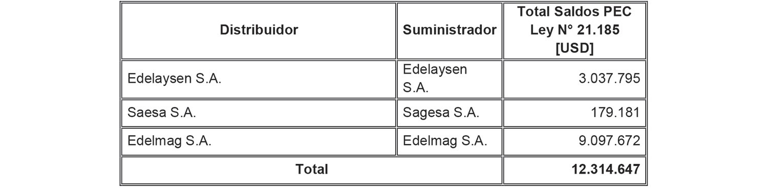De acuerdo a lo señalado precedentemente, la siguiente tabla contiene los saldos antes mencionados del Sistema Eléctrico Nacional, identificando al suministrador acreedor de dichos saldos y la Distribuidora deudora correspondiente: