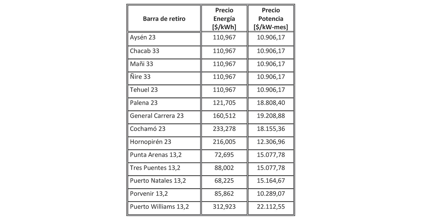 En los sistemas medianos de Punta Arenas, Puerto Natales, Porvenir y Puerto Williams y de Aysén, Palena y General Carrera, los precios de nudo de energía y potencia de punta que se aplicarán a los suministros servidos en la barra de retiro para el nivel de tensión que se indica, corresponden a los indicados en la Tabla 2.