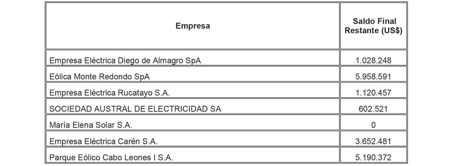 De conformidad a lo dispuesto en el artículo 5 de la ley N° 21.472 y en el artículo 12 del artículo segundo de la resolución exenta N° 379, el presente decreto contiene el Saldo Final Restante por suministrador, de acuerdo a la siguiente tabla:
