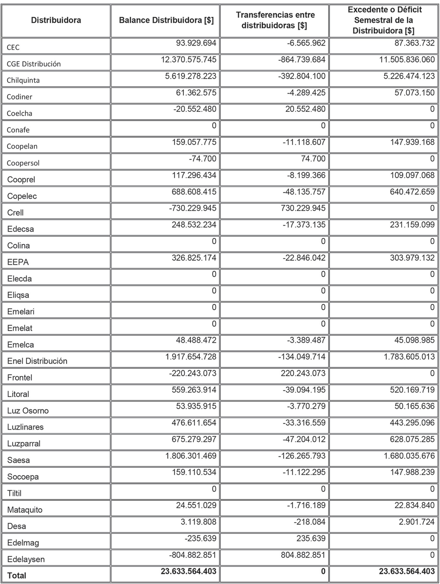 Conforme a lo anterior, en la tabla siguiente se detalla el resultado del Balance de la Distribuidora, las transferencias entre Distribuidoras y el Excedente o Déficit semestral de la Distribuidora resultante de tal ejercicio.