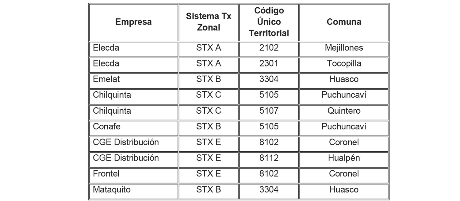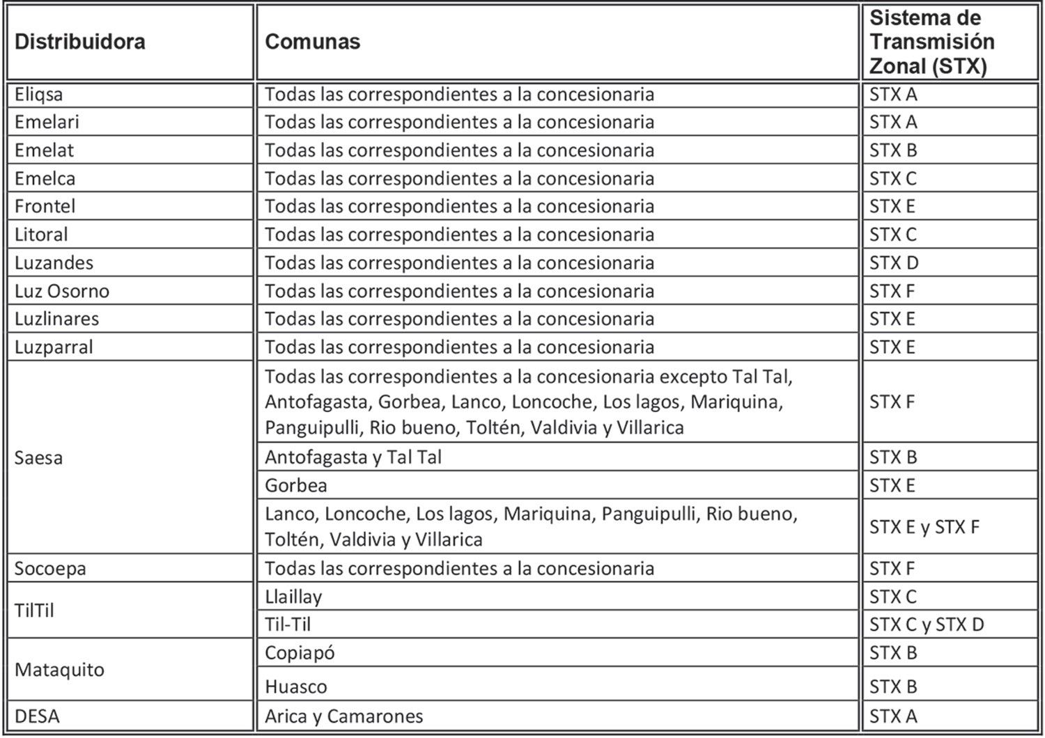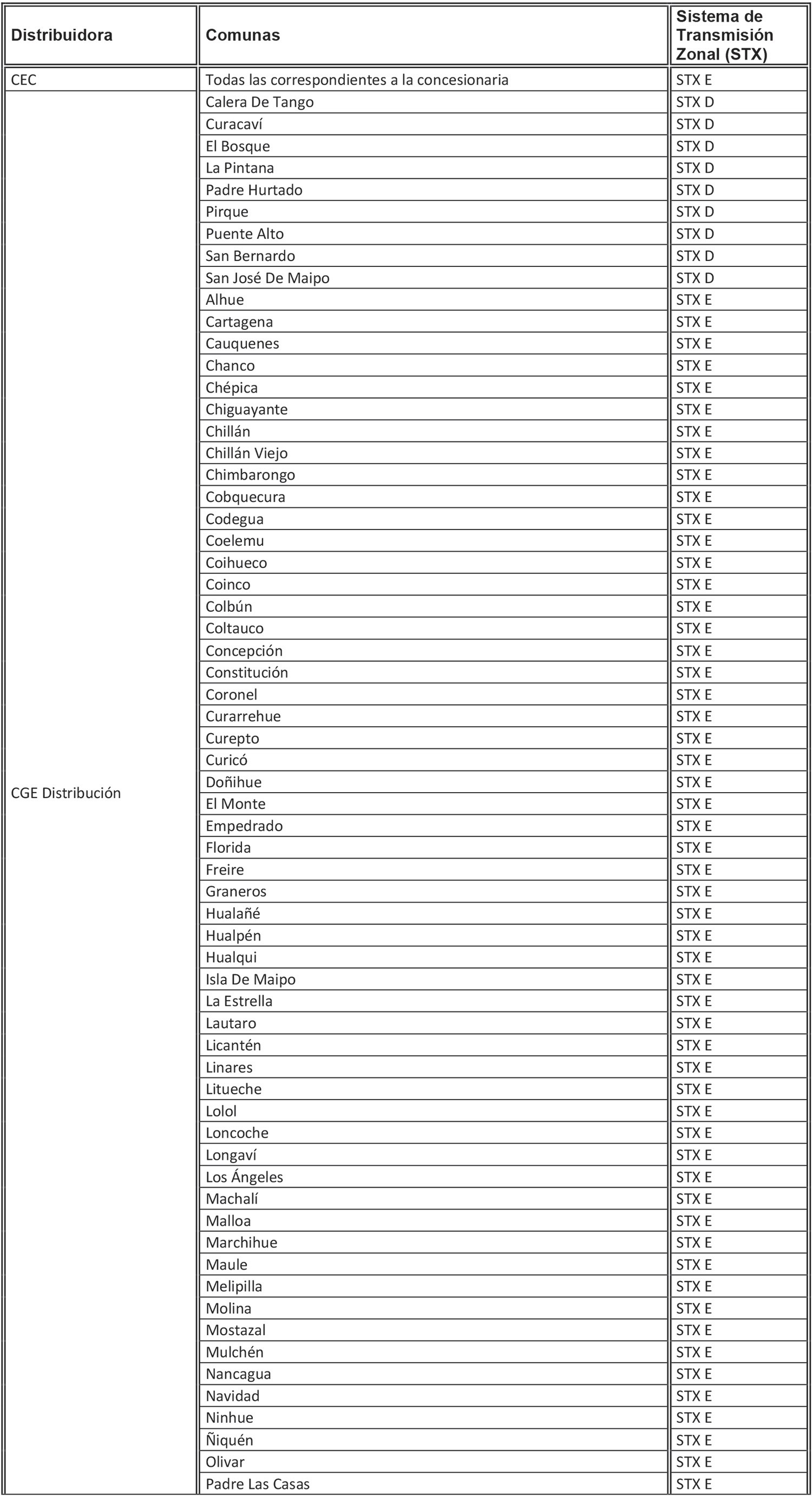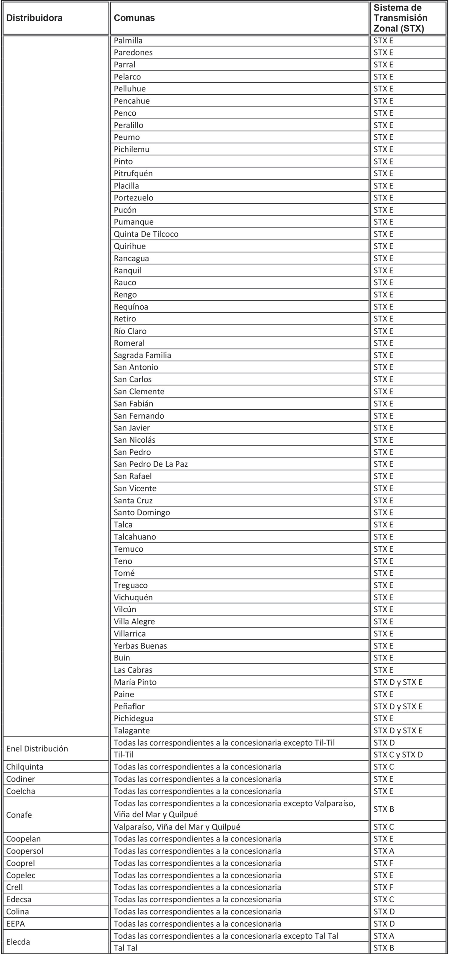 * Todas aquellas comunas que no se encuentren individualizadas en la tabla y que son suministradas por la respectiva Concesionaria en el sistema de transmisión zonal indicado.