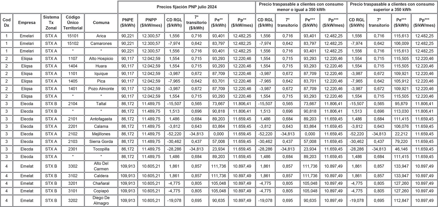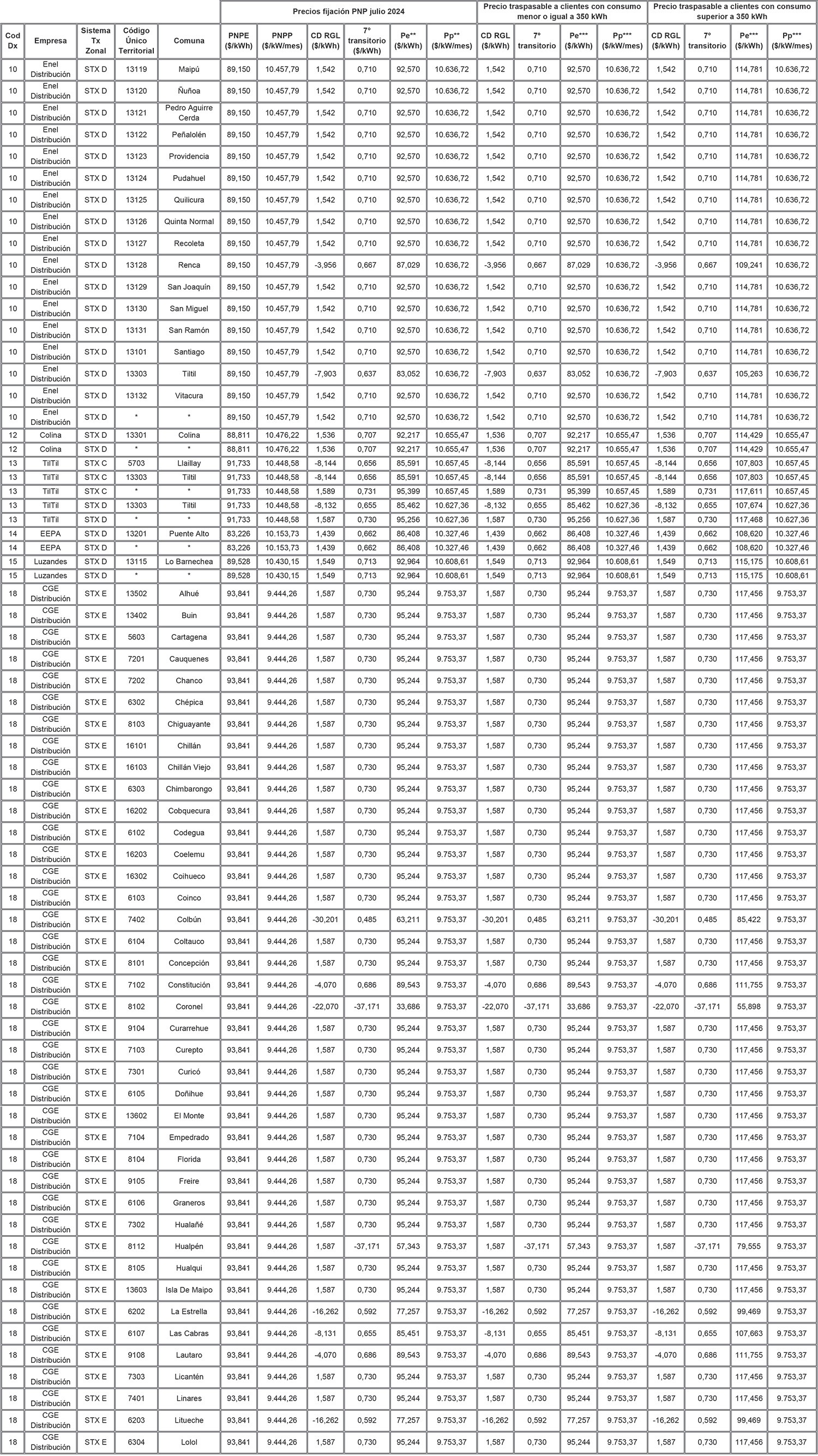 En la Tabla 14, los valores correspondientes a "Precios fijación PNP Julio 2024" se obtienen aplicando los factores Ni, que se señalan en la tabla siguiente: