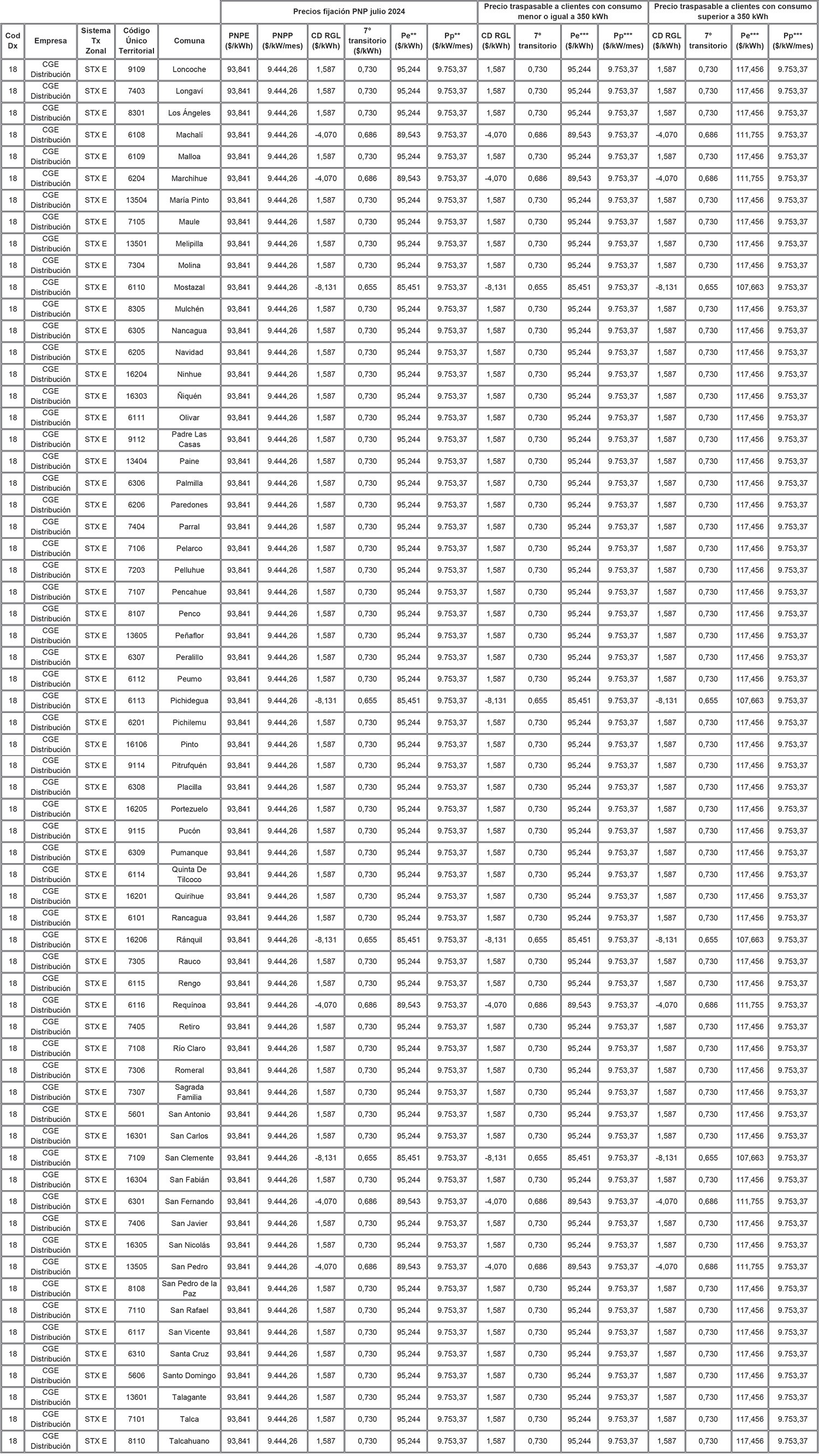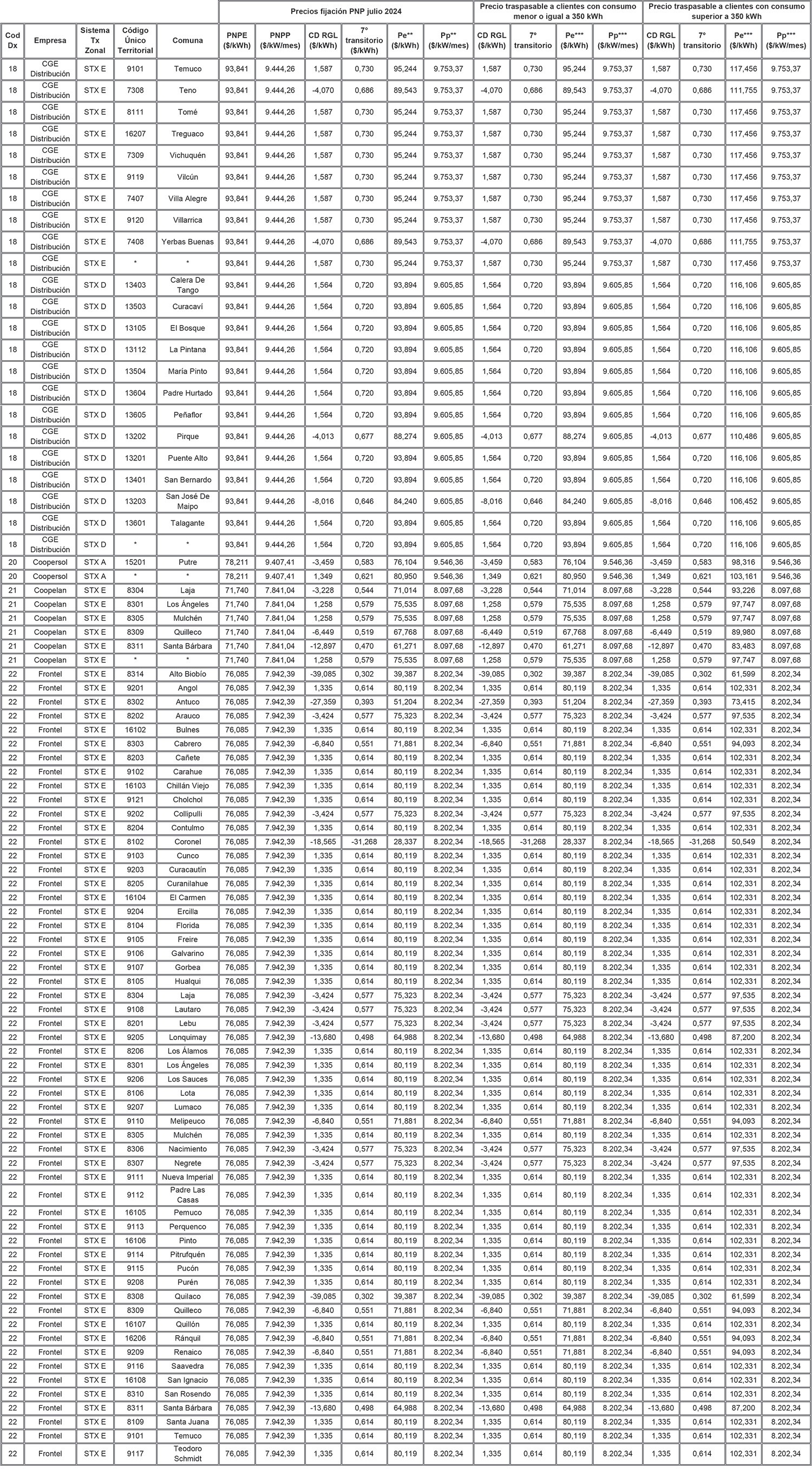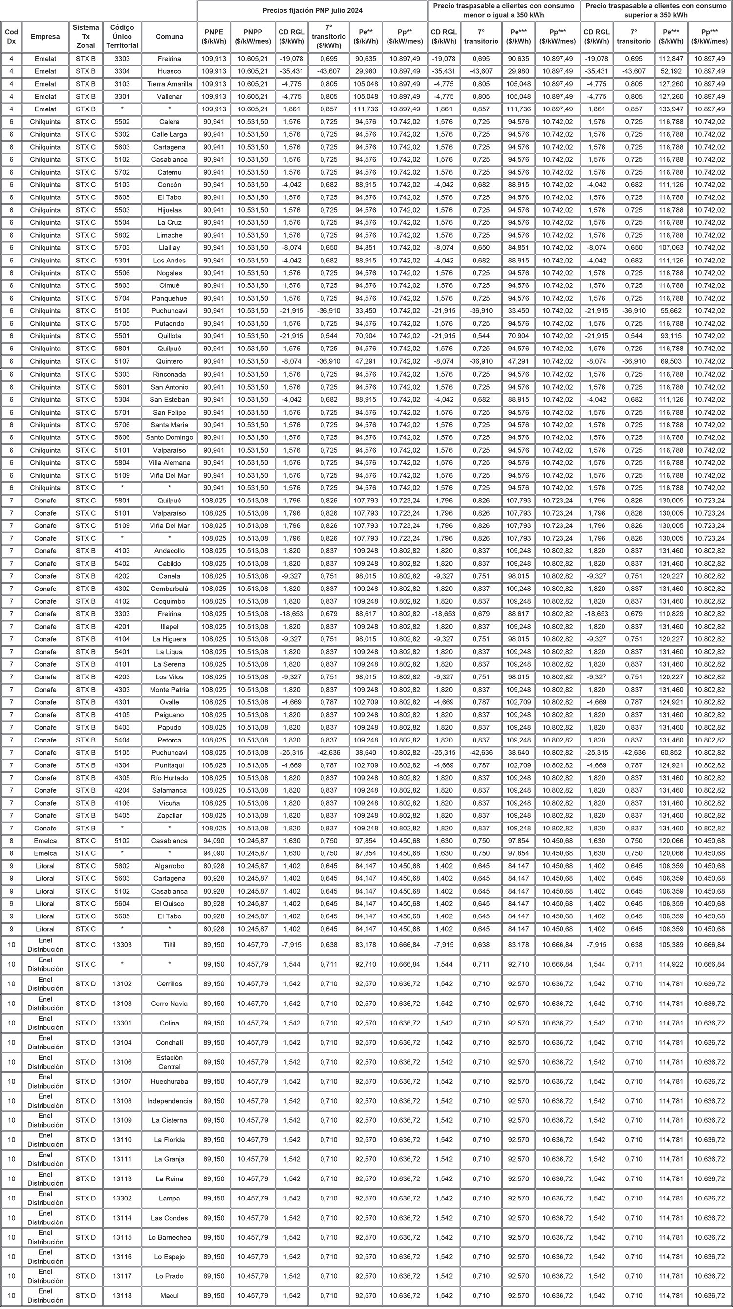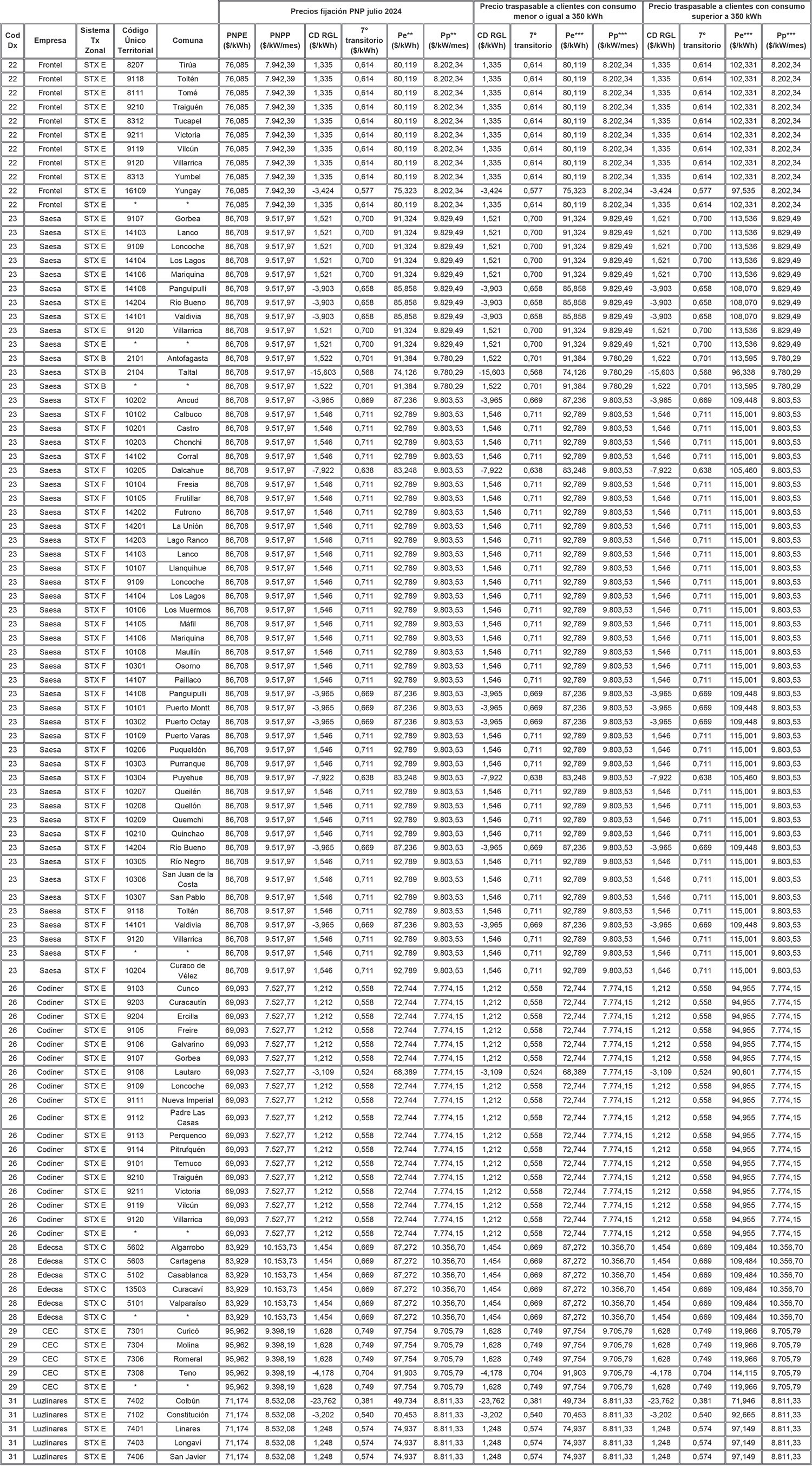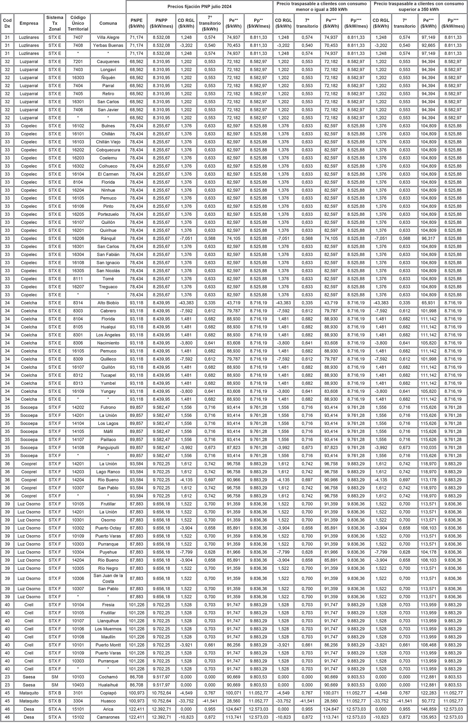 Los valores que las Distribuidoras podrán traspasar a sus Clientes Regulados se indican en la Tabla 13, para cada Distribuidora y sector de nudo asociado al sistema de transmisión zonal en donde se ubica el cliente respectivo, considerando la siguiente clasificación para las empresas distribuidoras presentes en más de un sector de nudo: