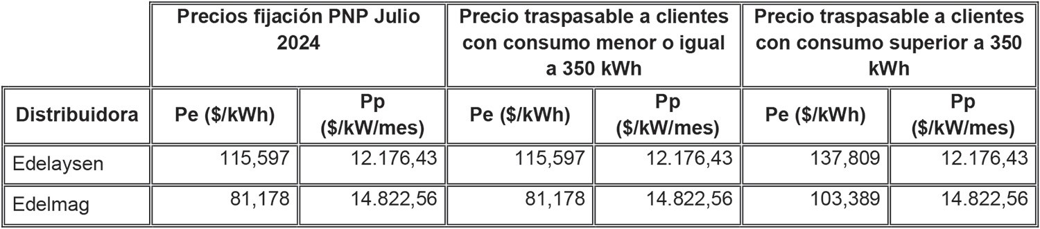 Los precios de energía a nivel de distribución traspasables a Clientes Regulados por las Distribuidoras Edelaysen y Edelmag son los que se establecen a continuación:
