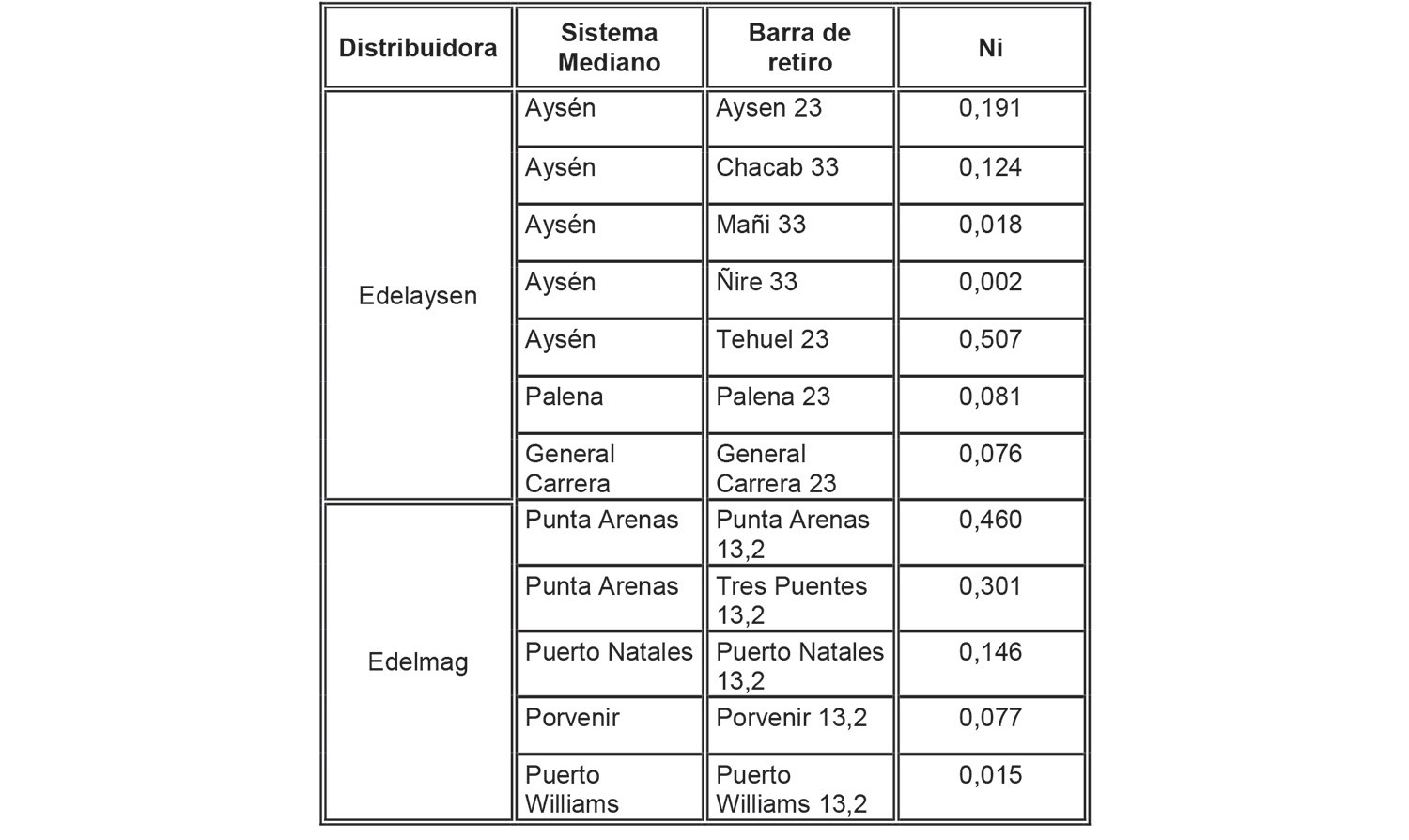 Tabla 15: Ponderadores Ni para precios traspasables a cliente final en los sistemas medianos